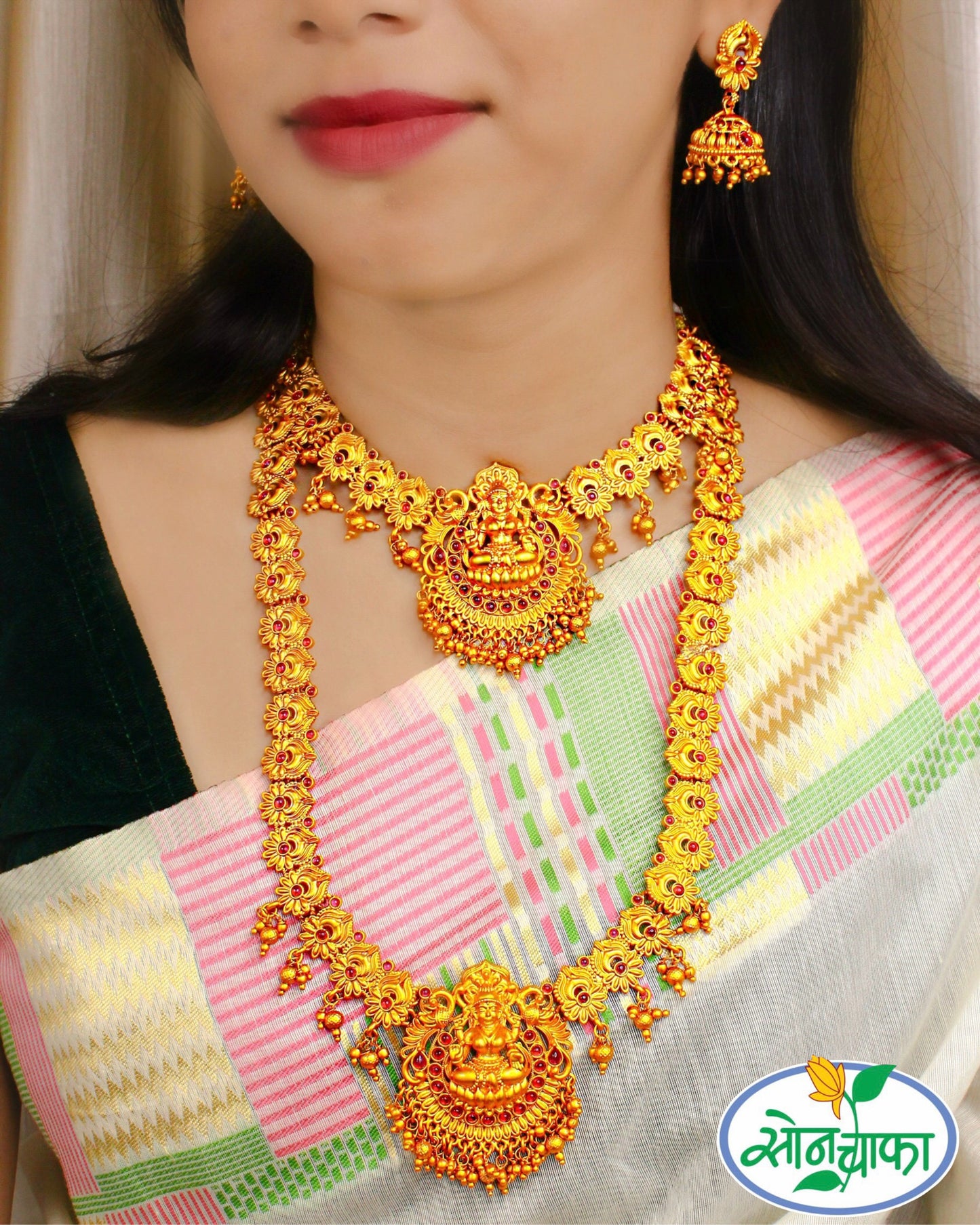 Temple designer combo set for women in wedding wear is here sonchafa jewellery with an designer necklace set. With an increble studding designs and with pink green stone wonderful matte gold finish combo set.