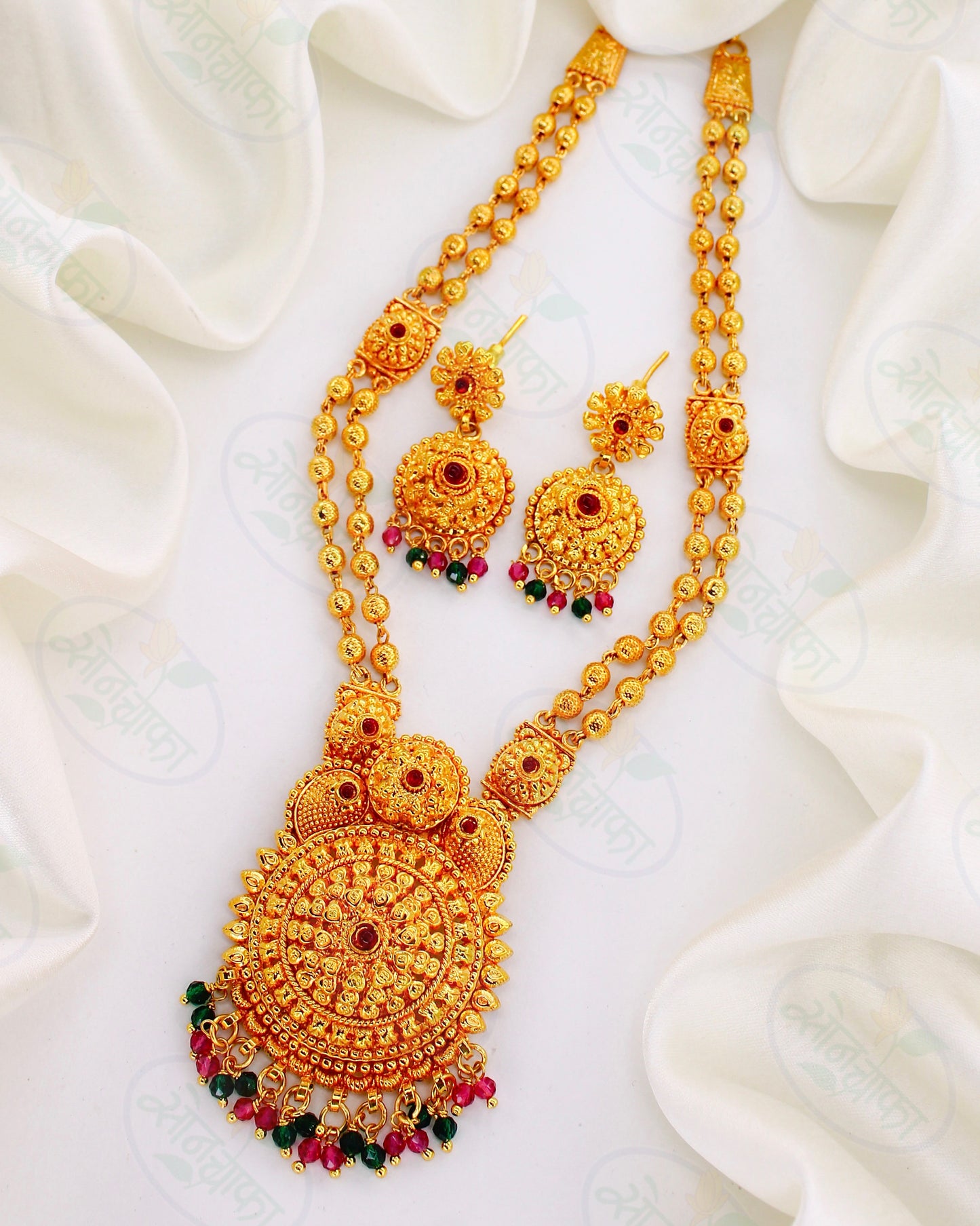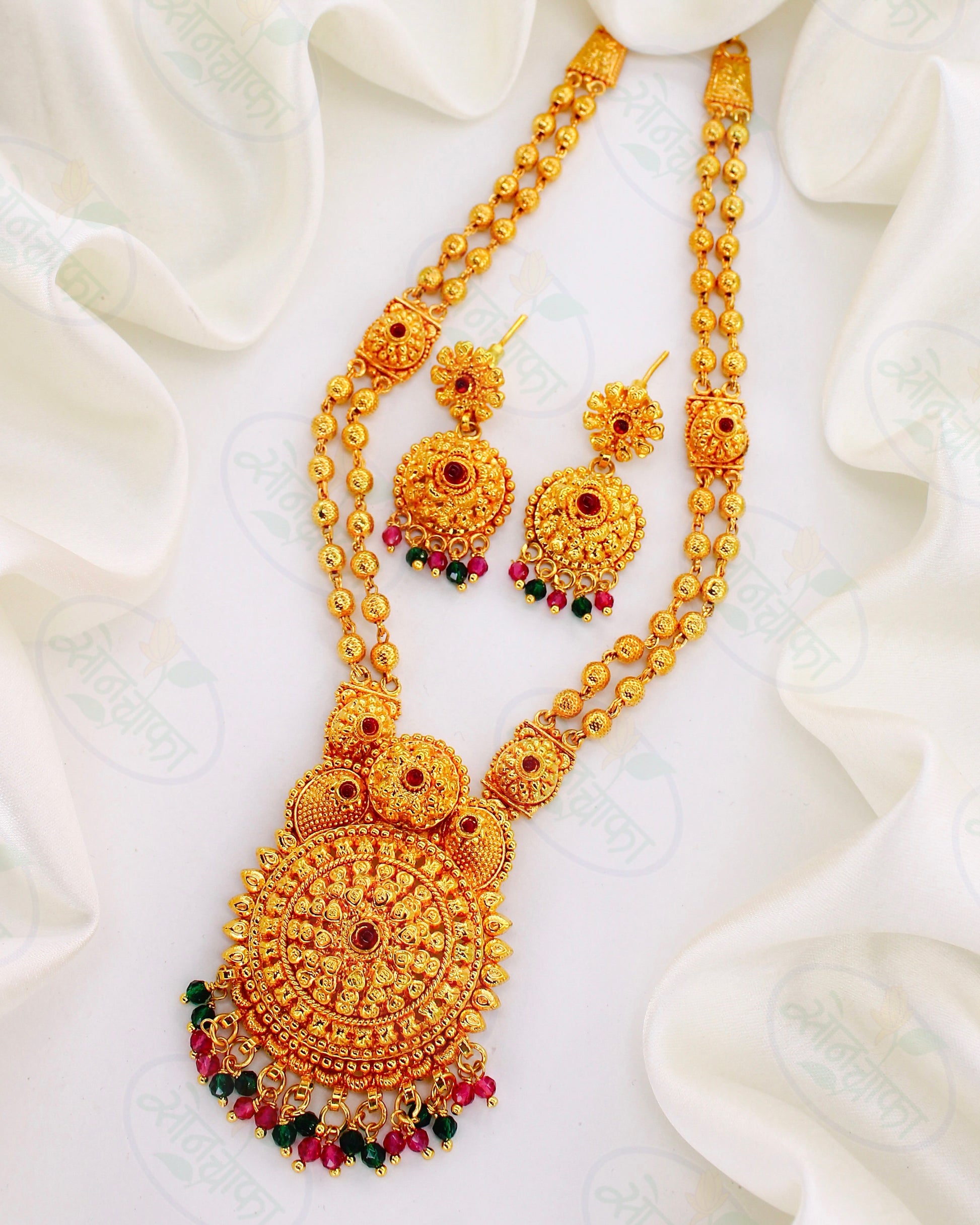 Sonchafa Jewellers brings to you this glamorous floral designer necklace set for modish women like you. Club this designer necklace set with your traditional costumes. It is embedded with sparkling pink stones and made from matte golden finish metal. It also has beautifully designed earrings. This long necklace set is superior in quality and rust-resistant as well.