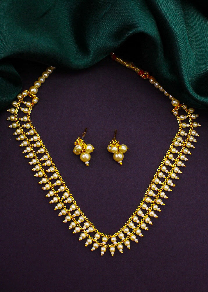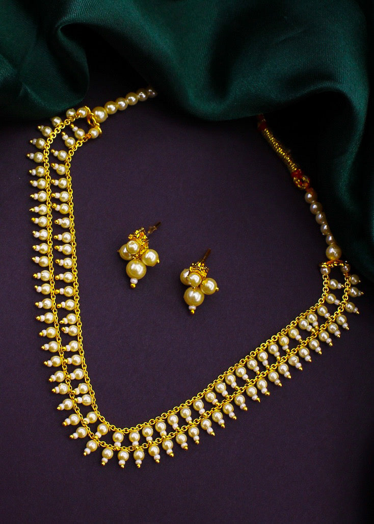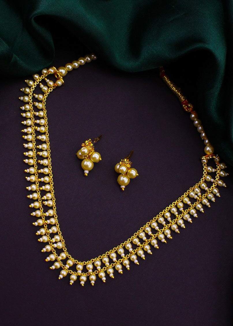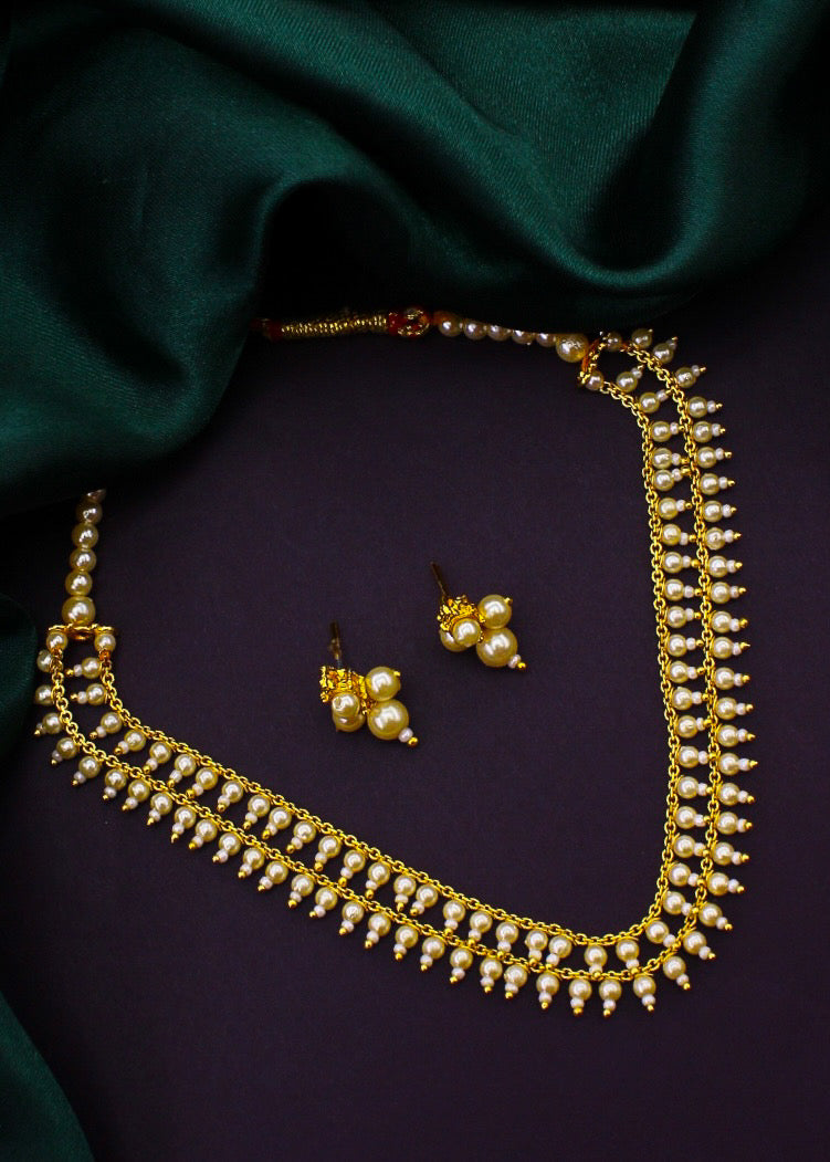 Take a look at this necklace set from Sonchafa Jewellery which is complete your traditional look. It is embedded with pearl beads. It is styled with dangled pearl beads and made from golden finish metal. This necklace is long lasting and high in durability.
