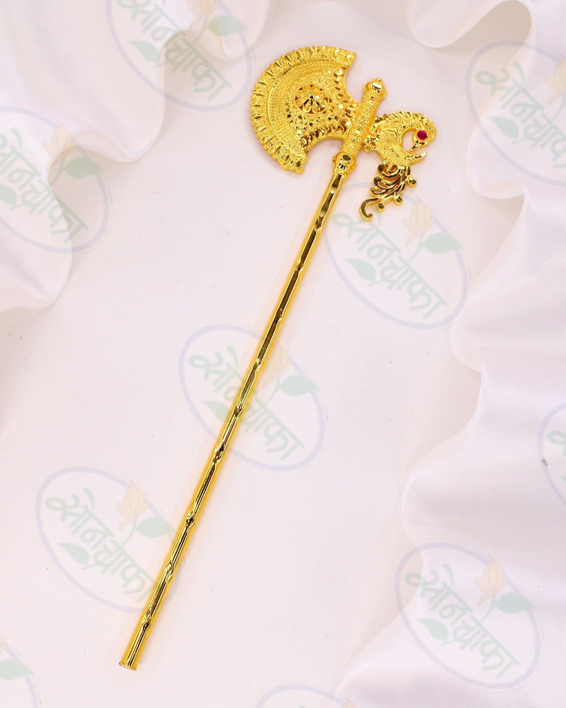This Ganpati season buy this designer Trishul for your Ganpati decoration. It is crafted from golden finish metal and decked with pink, green stone. This Trishul is superior in quality and rust-resistant as well