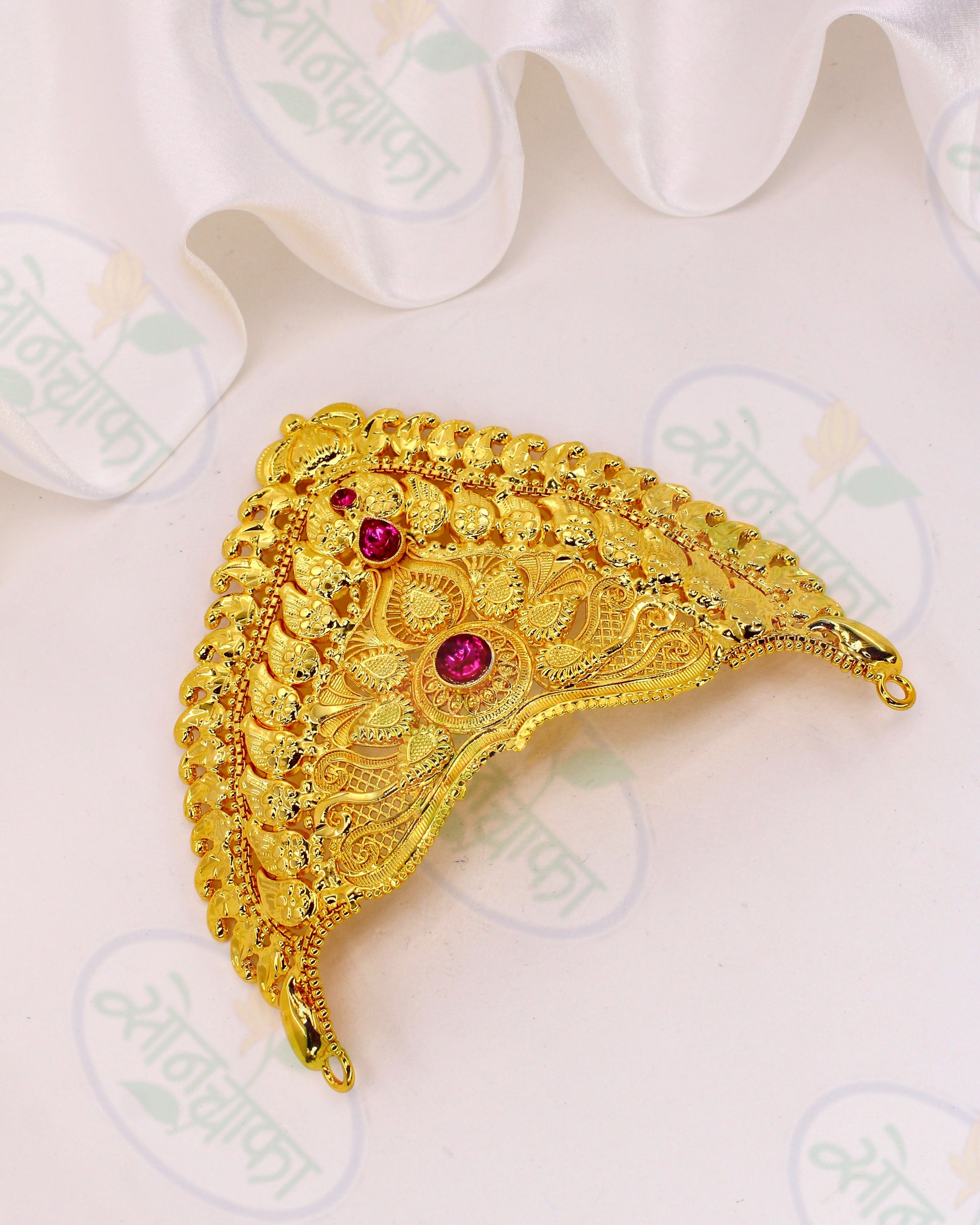 Specially designed for your Ganesha this floral Ganpati mukut from Sonchafa Jewellers. This piece of jewellery is very much adorable and made from golden finish metal. It is studded with glossy