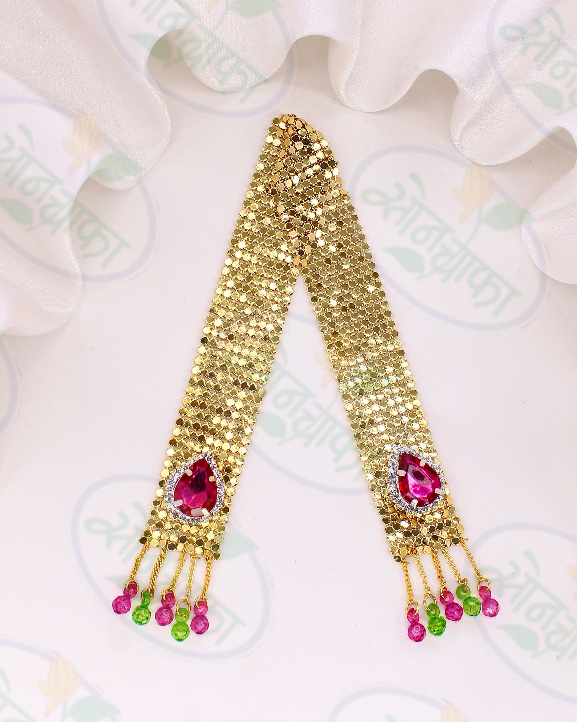 This Pearl beads adorable Golden colour is best to adorn your Ganapati decoration. It is fashion from Golden beads along. This Ganapati shawl has pink droplets.