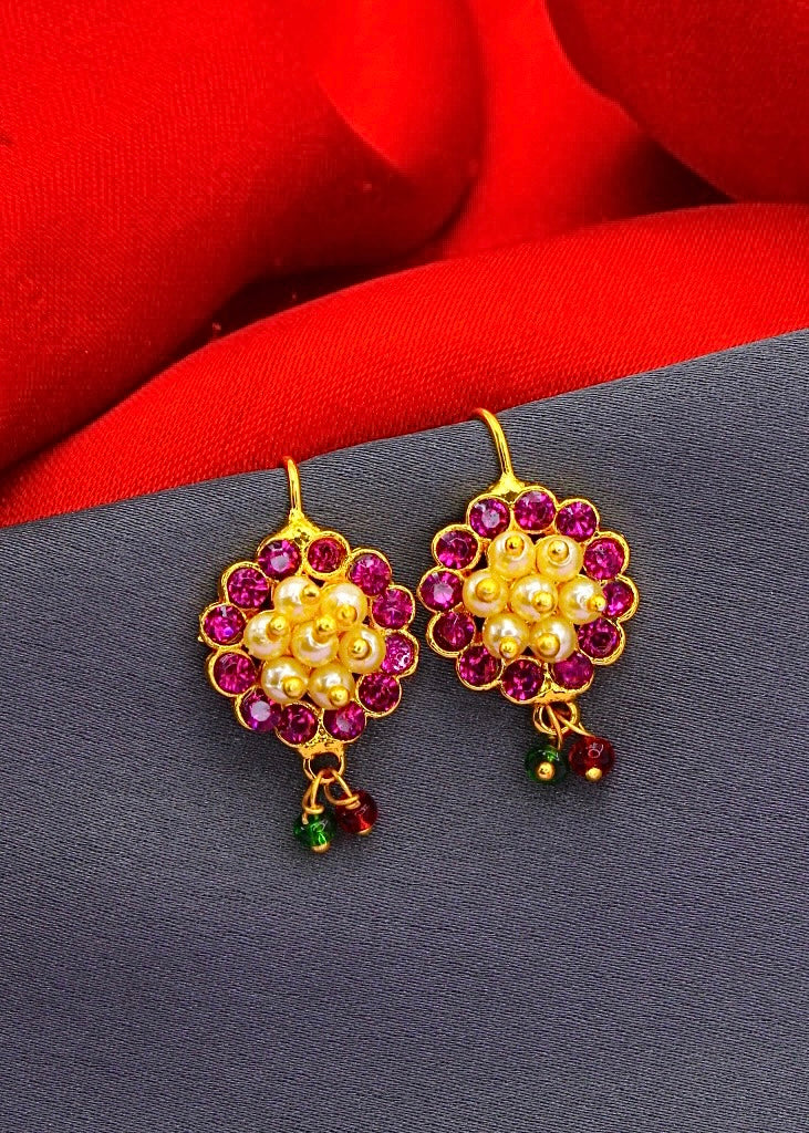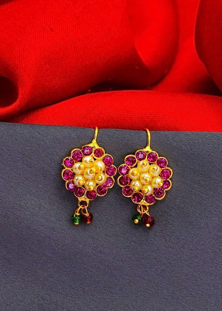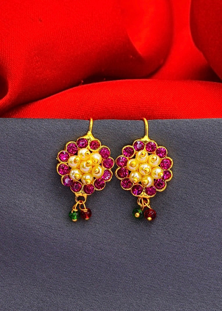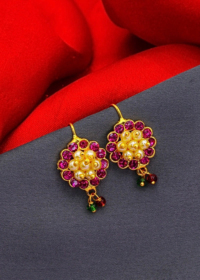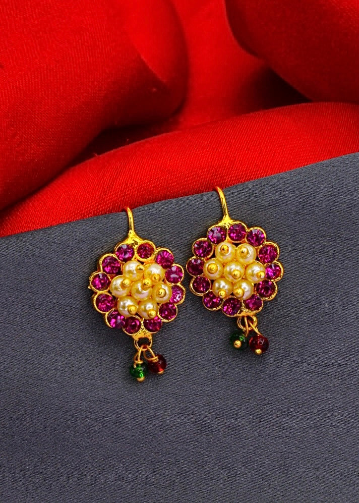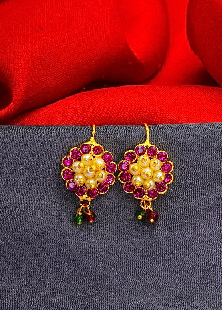 Beautifully designed this floret designer adorable bugadi from Sonchafa Jewellery is best to team with Maharashtrian costume. They are embedded with pearl beads and made from golden finish metal. These bugadi are easy to wear as they are clip-on.