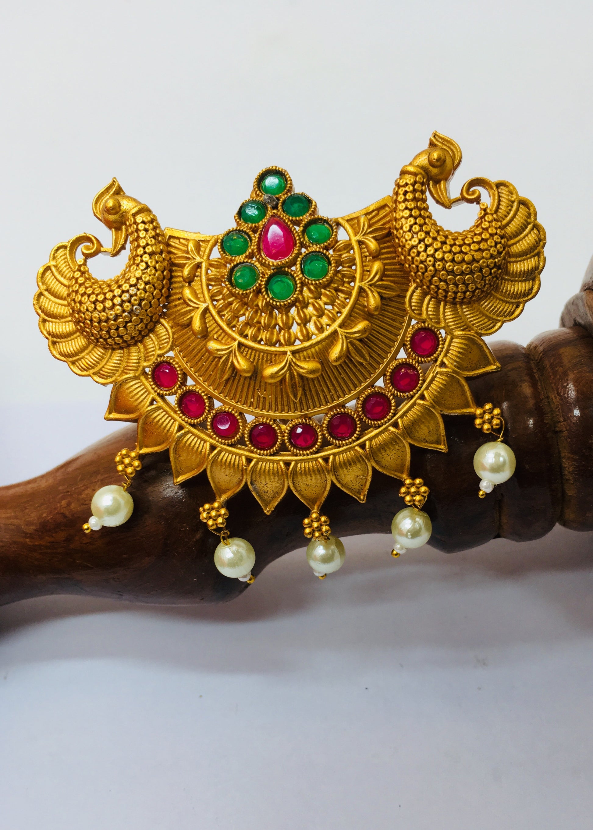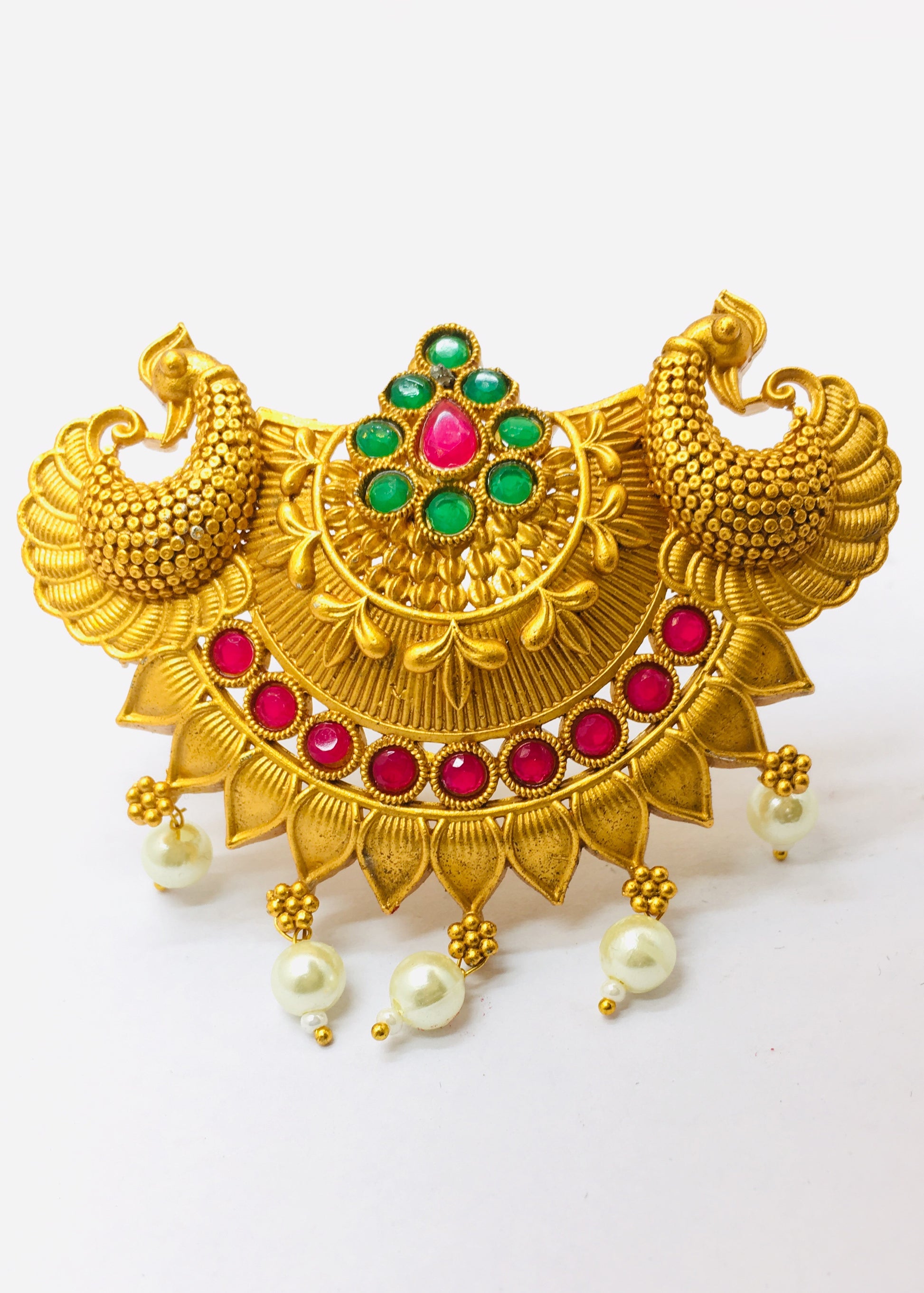 Get known for your fashionable taste in accessory by ordering this peacock design judapin from Sonchafa Jewellery. It is studded with pink - green stones along with pearls beads and fashioned from metal. This judapin is superior in quality and will surely fetch you endless compliments from onlookers for your amazing choice.