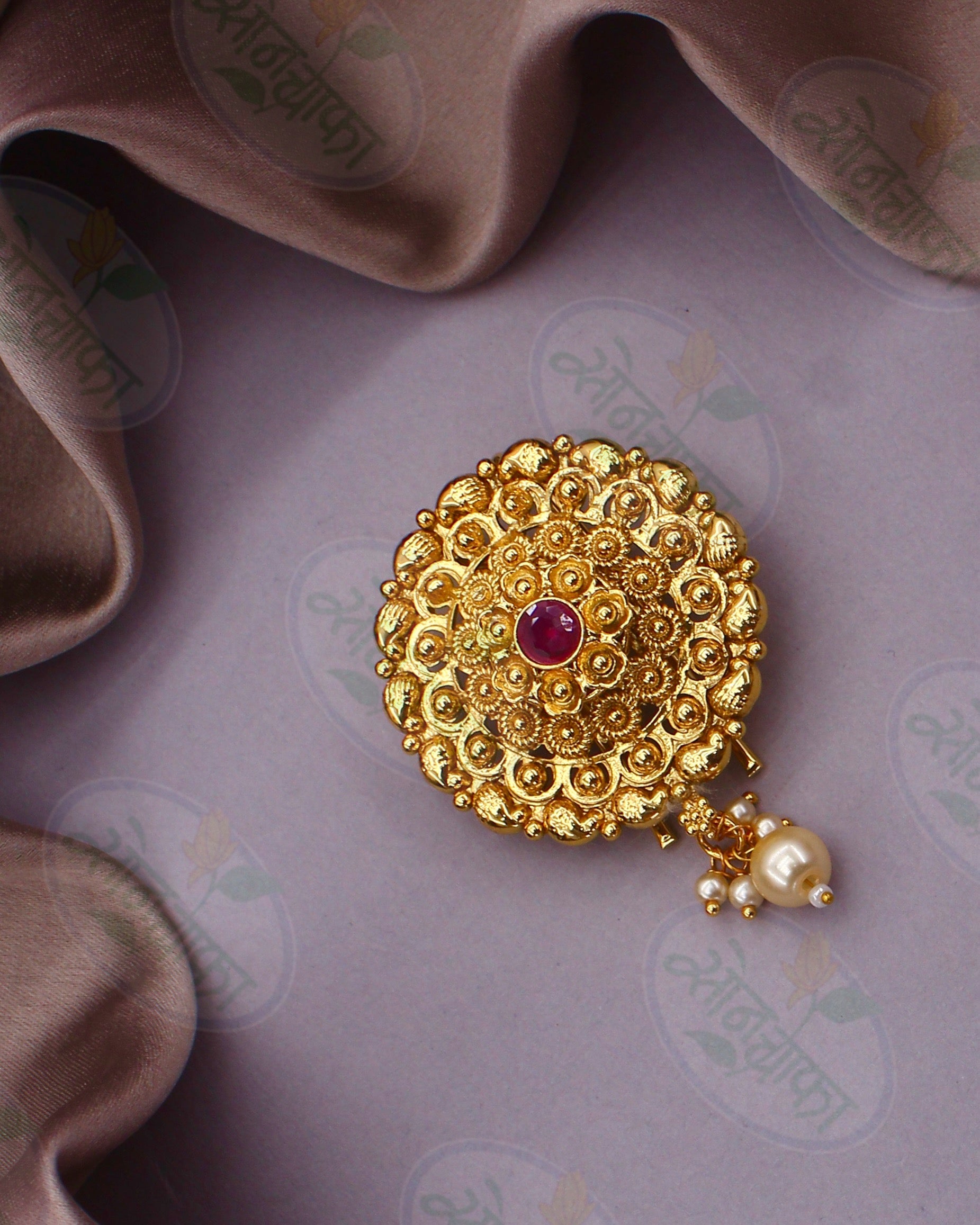 This wonderful classy round shape designer judapin form Sonchafa Jewellery for styled on hair. It Is studded pink stone along with beads and made from metal. This judapin is good in quality and will be your fashion companion for many years.