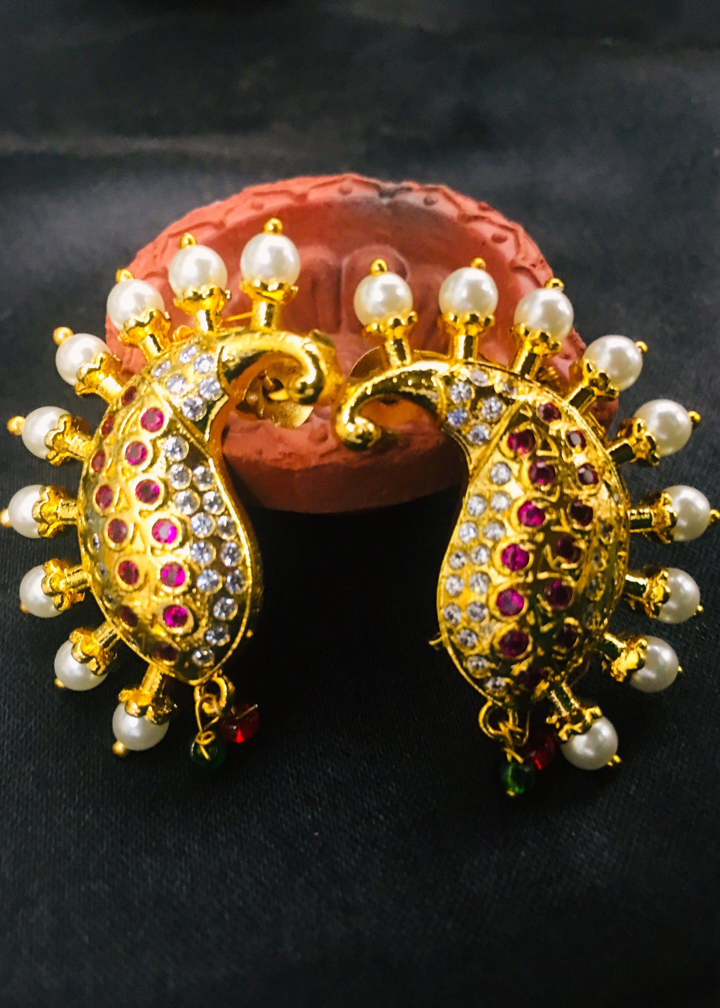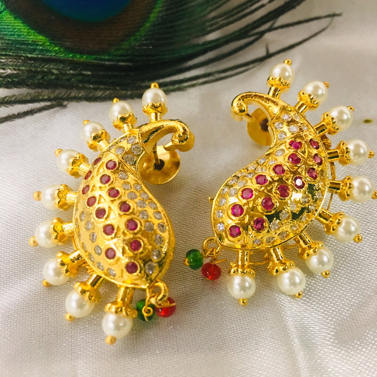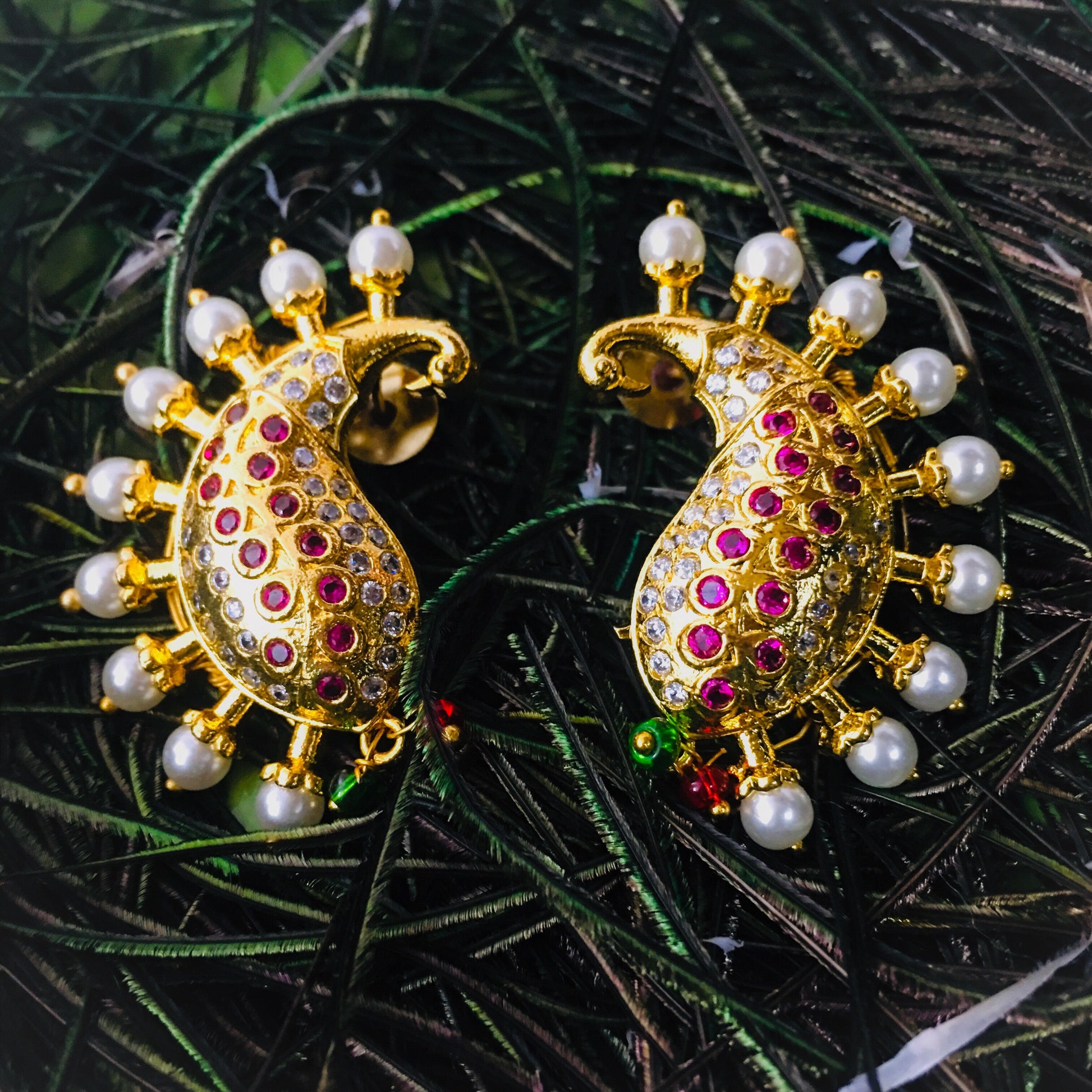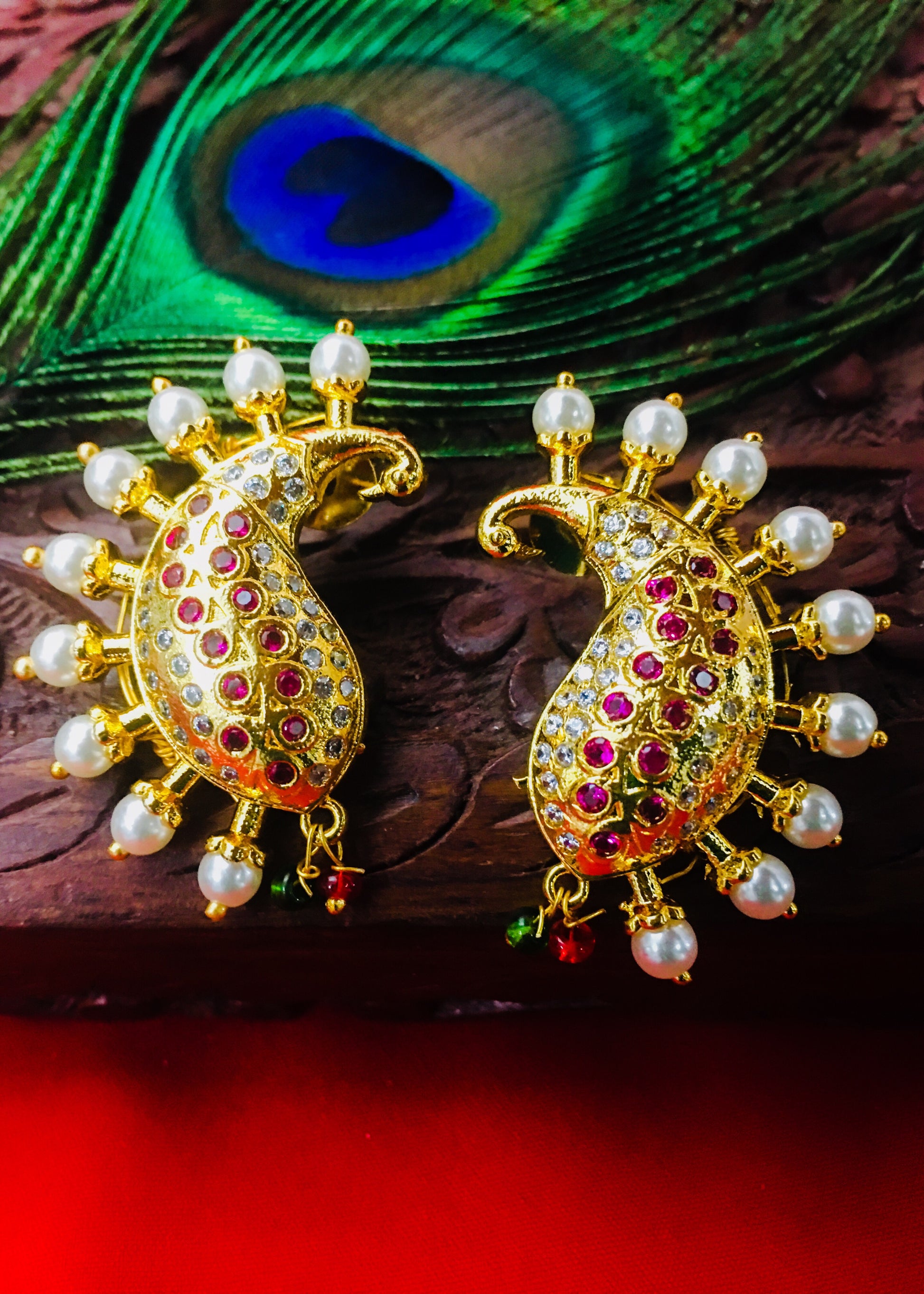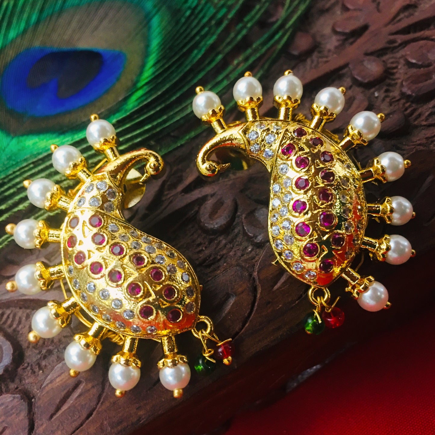Adorn your earlobes with this pair of golden colour wonderful studs earrings with your festive costume. It is studded sparkling stone along with pearls beads and made from golden finish metal. This studs earrings is completed peacock look.