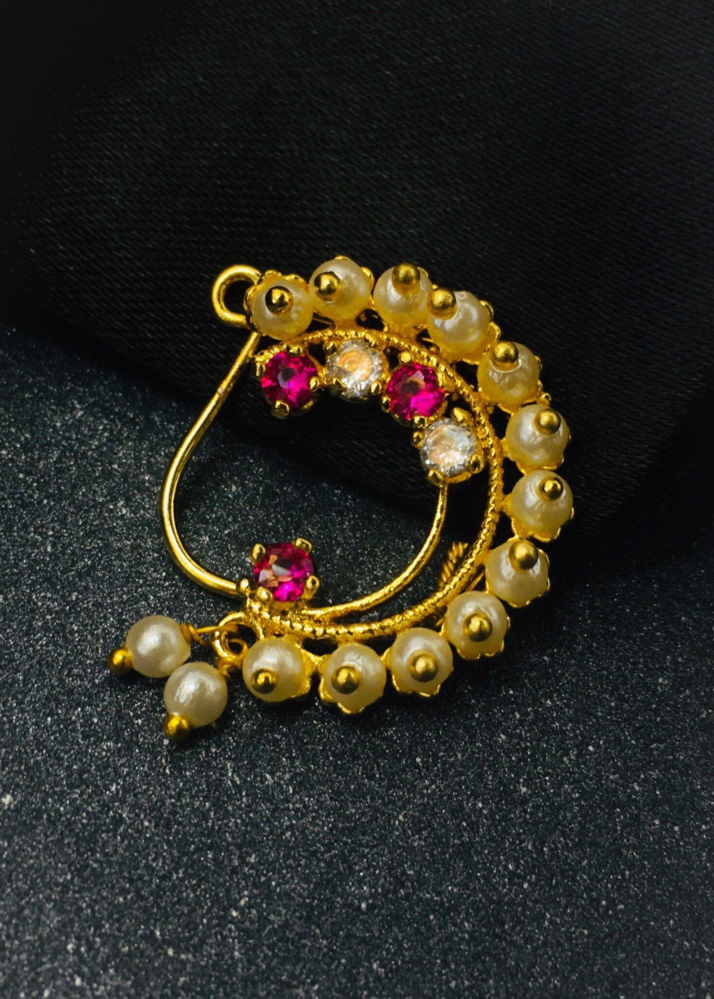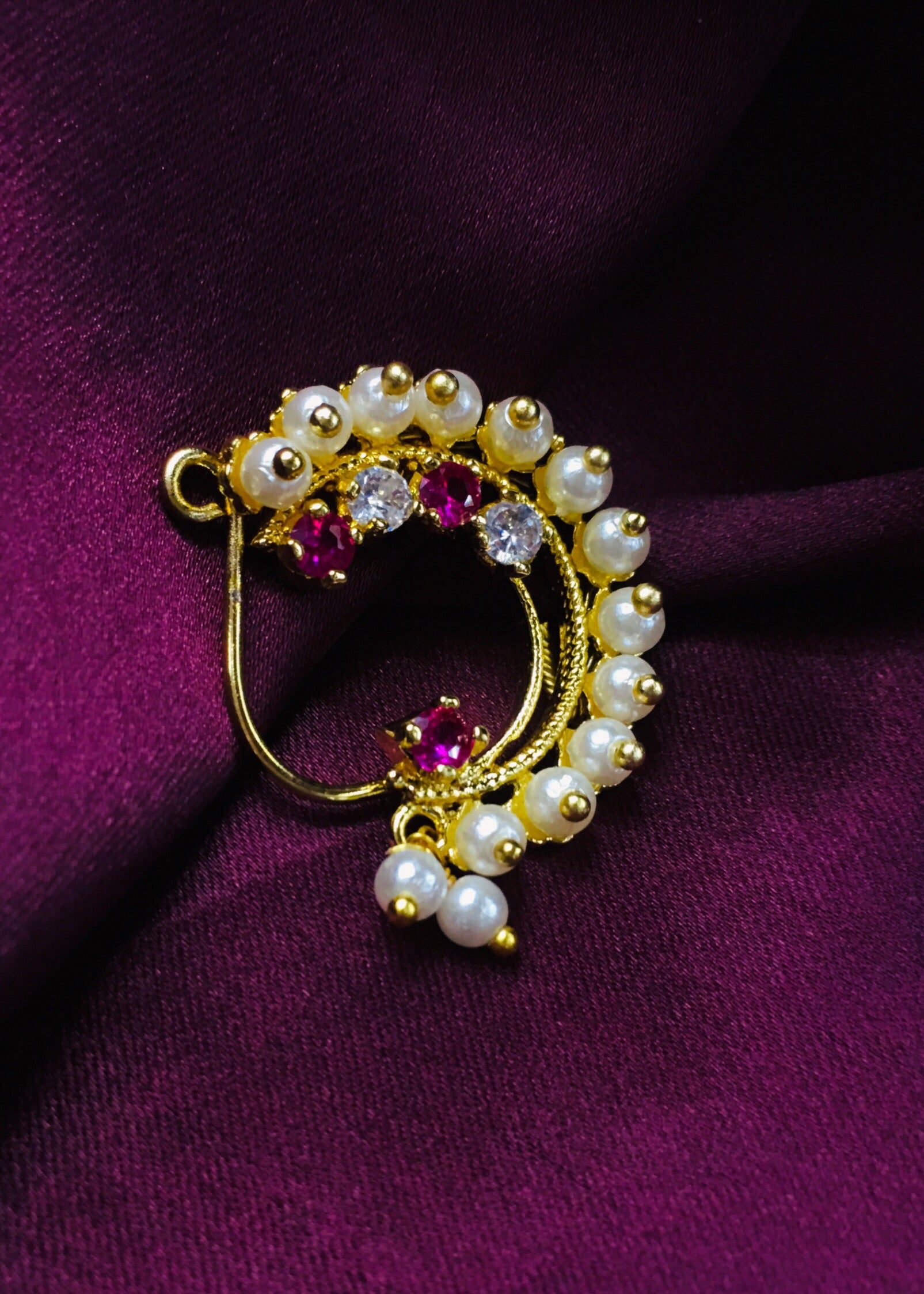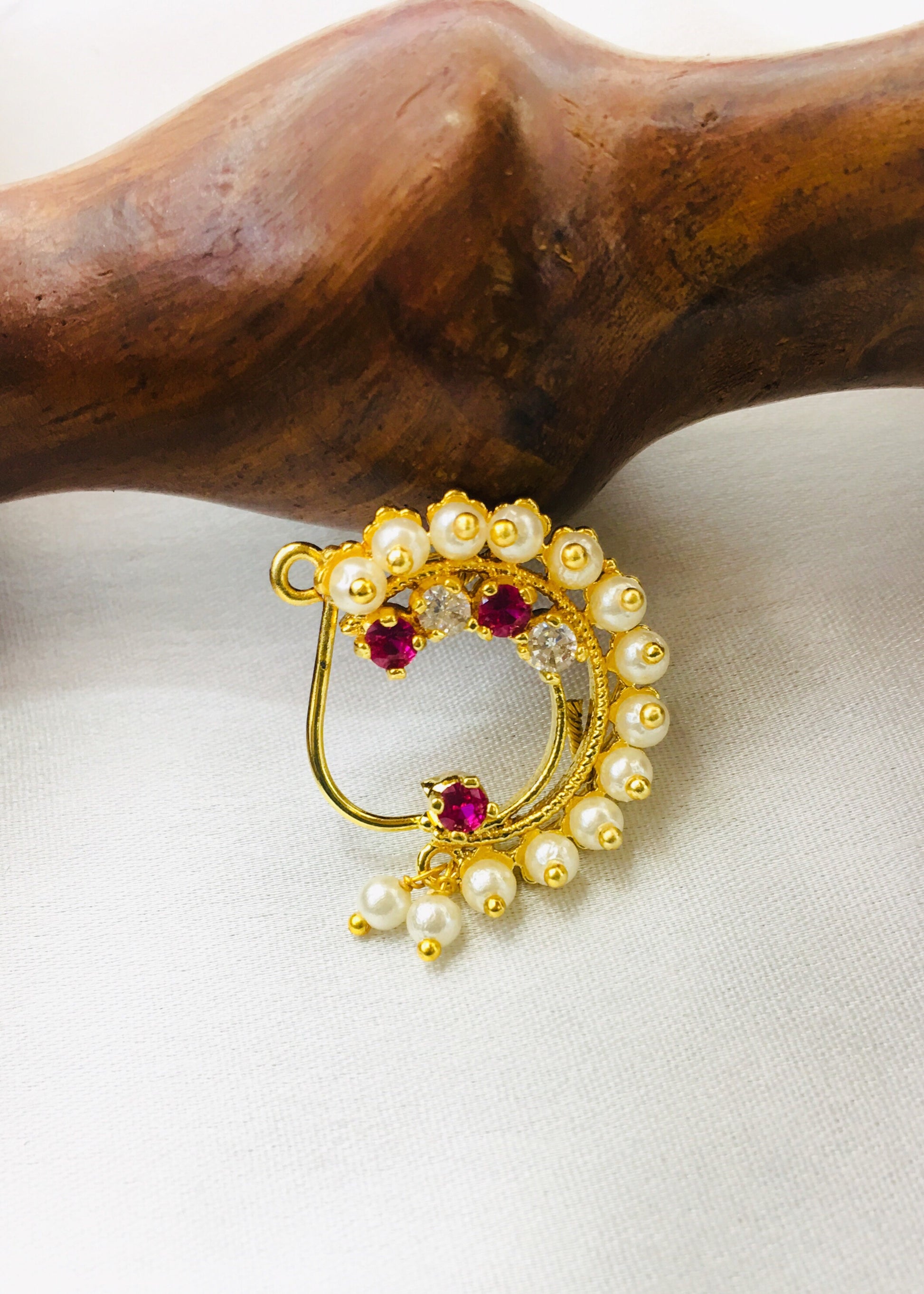 Pleasing this golden finish Maharashtrina Nath from Sonchafa Jewellery for stylish traditional look. It is styled with studded pink, white stone & along with pearl beads and made from golden finish metal. This nath is easy to wear clip on nose ring