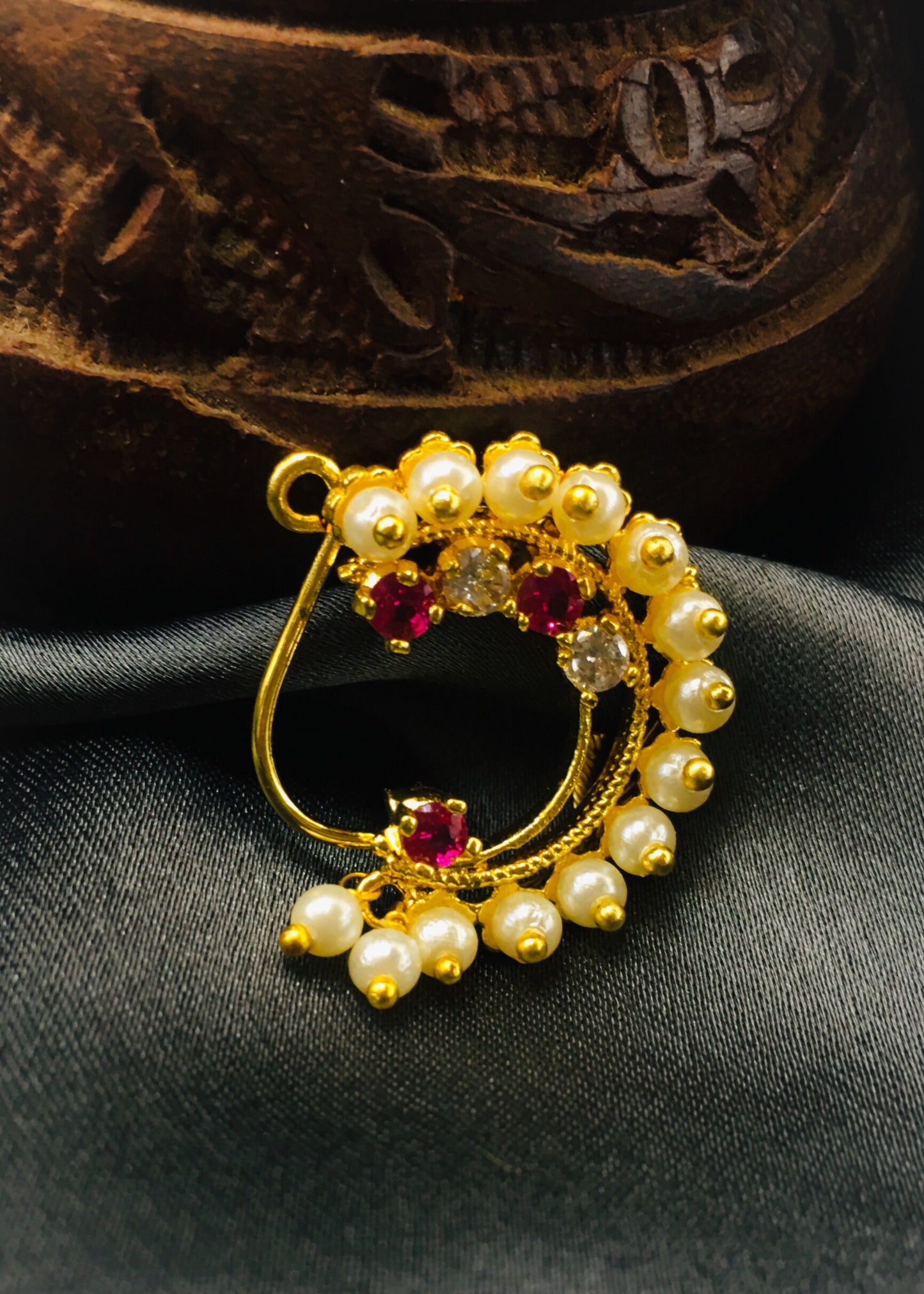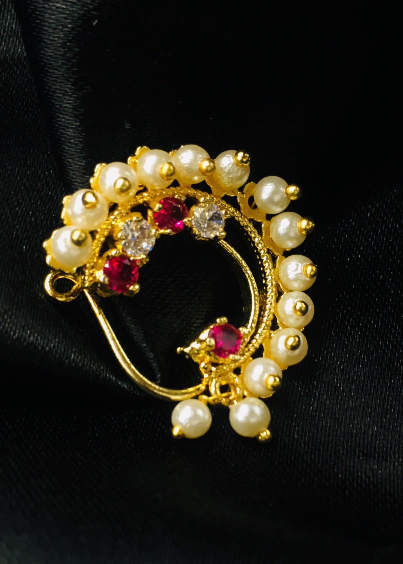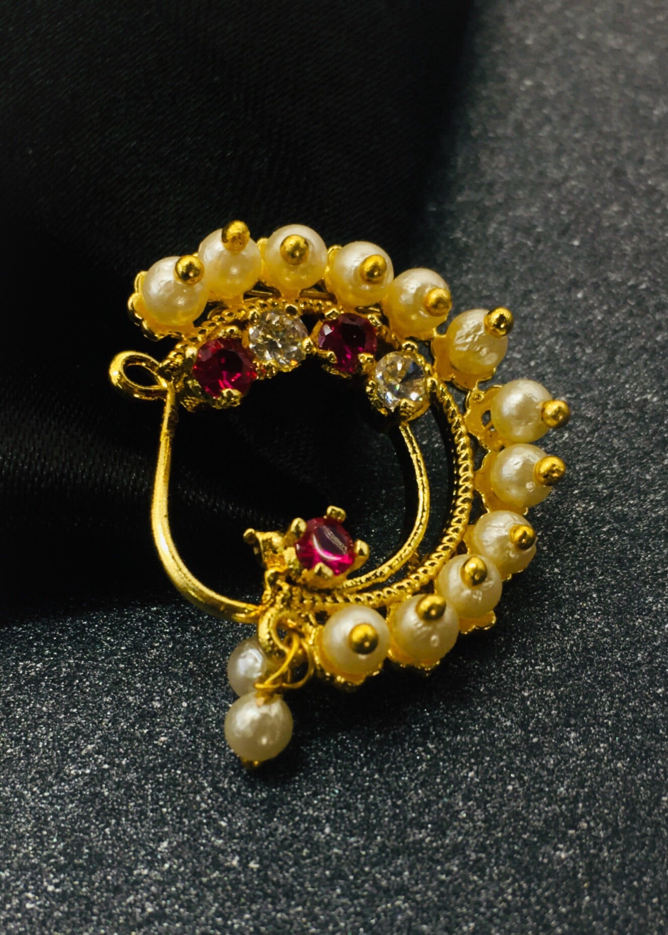 Pleasing this golden finish Maharashtrina Nath from Sonchafa Jewellery for stylish traditional look. It is styled with studded pink, white stone & along with pearl beads and made from golden finish metal. This nath is easy to wear clip on nose ring