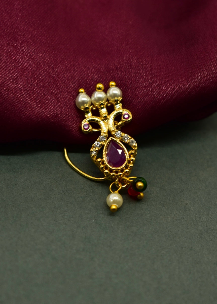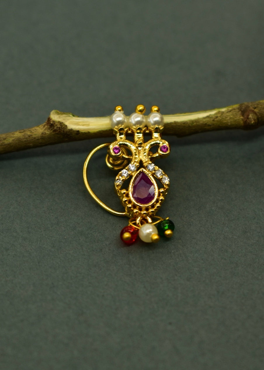 Stunning golden finish embedded with white and pink colour stone designer nath for girl or women by Sonchafa Jewellery. This nath is encrusted with stunning white pink stones and dangled with colorful beads. This dual peacock nath surely intensify your look.