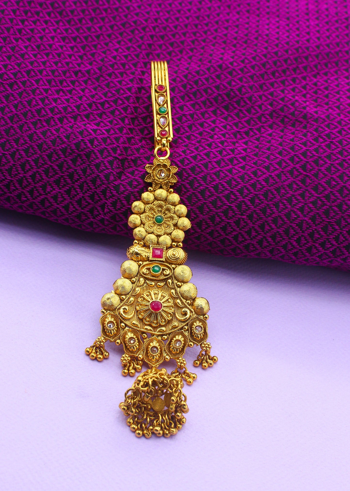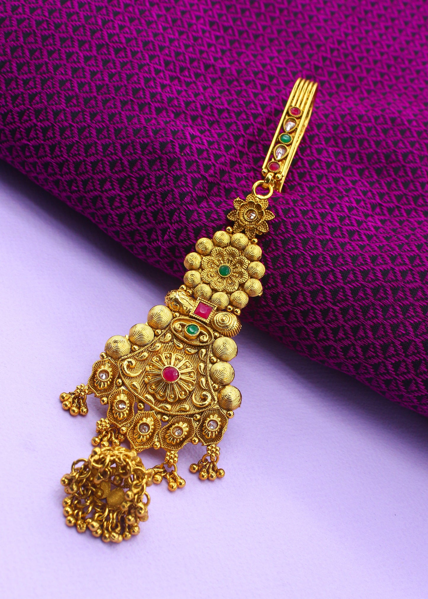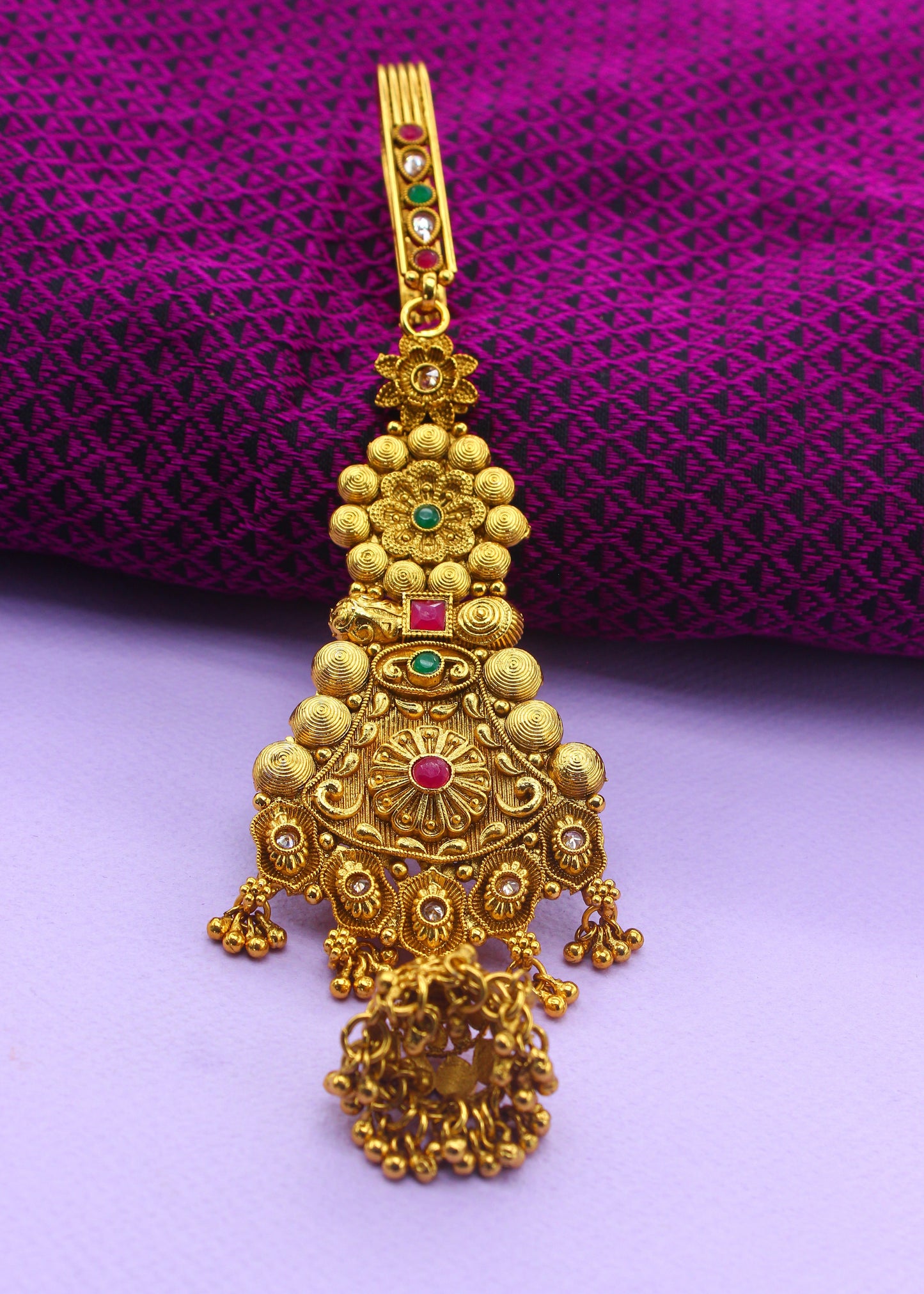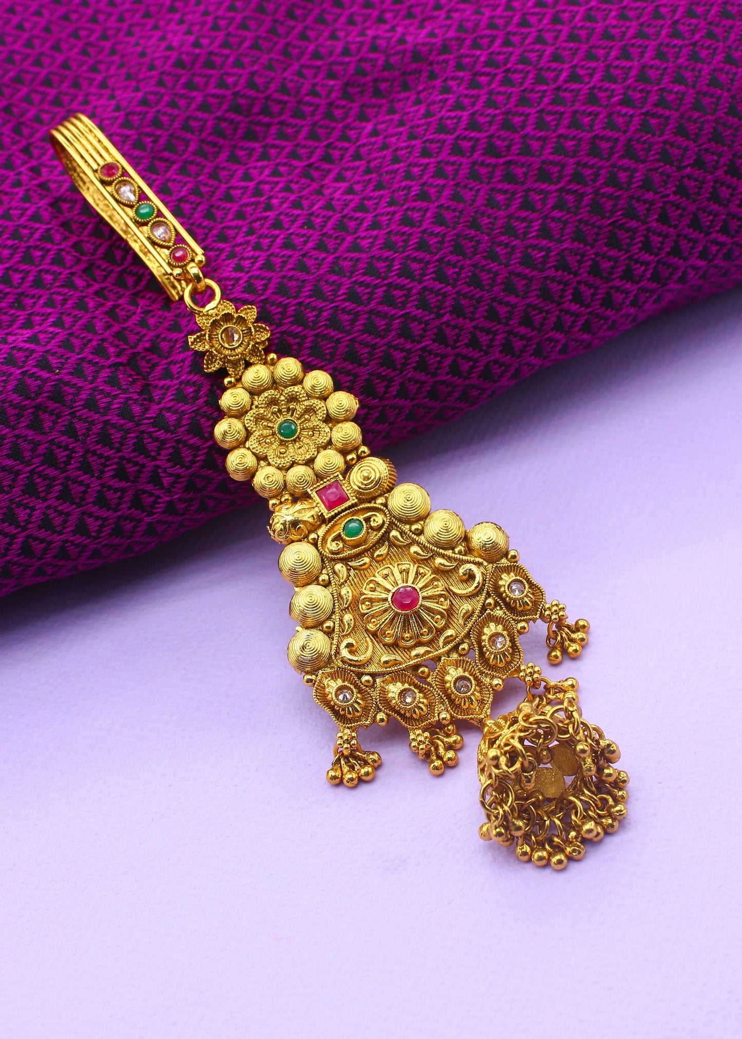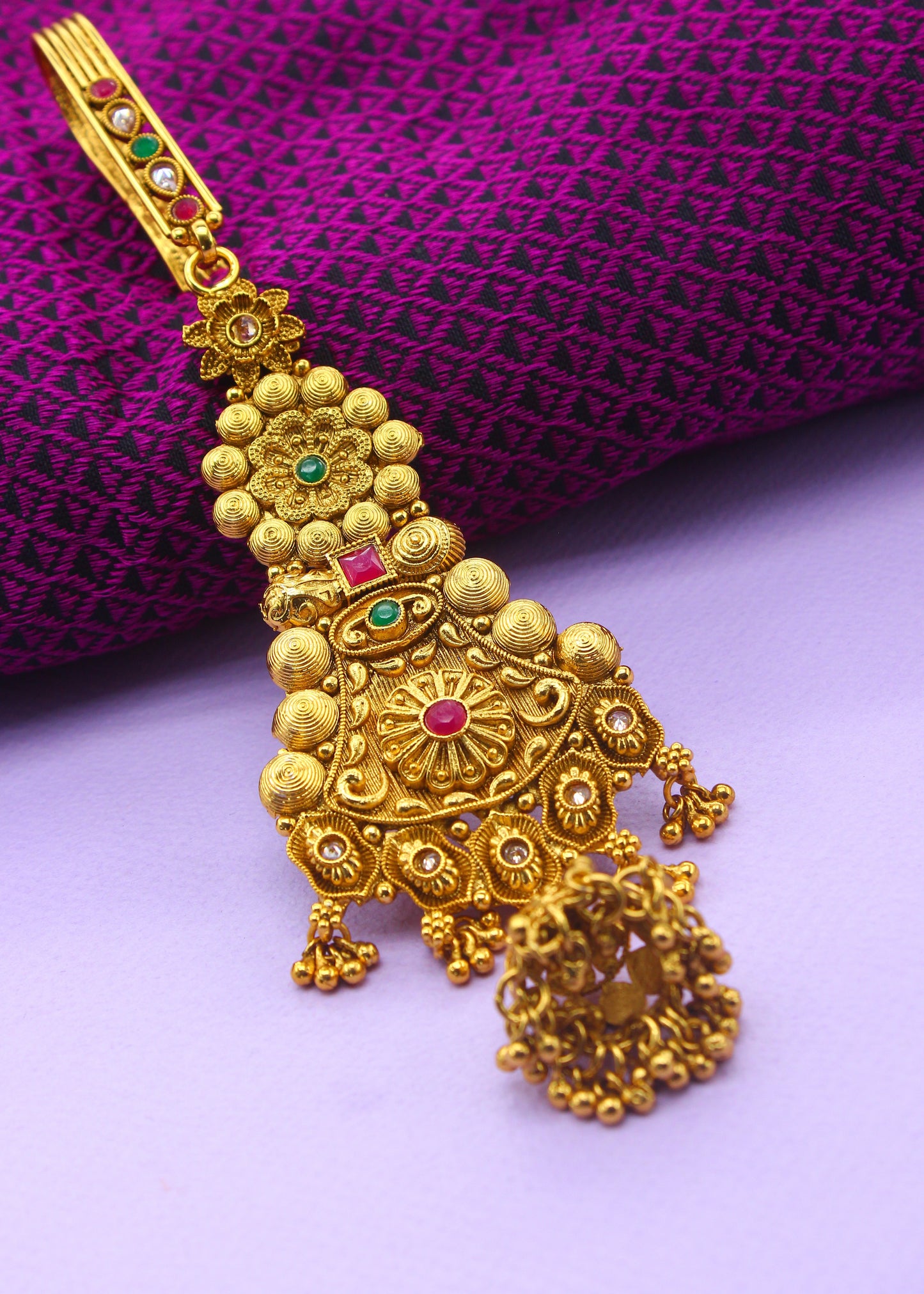 Antique golden finish floret designer challa from Sonchafa Jewellery for stylish girls/women like you. It is styled with pink, green, white stone and made from antique golden finish metal. This wonderful challa is styled with golden beads for more attraction.