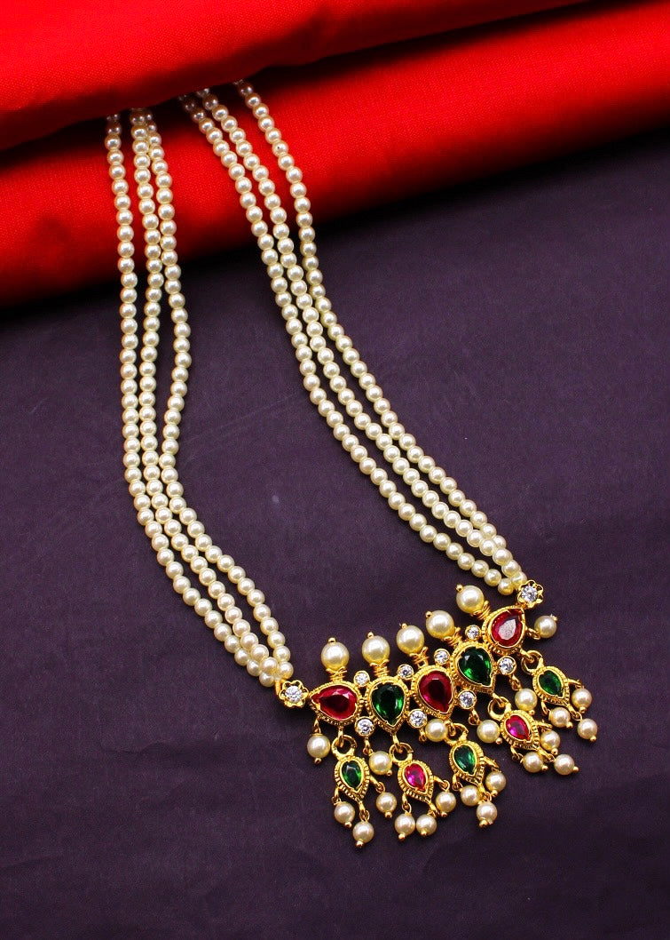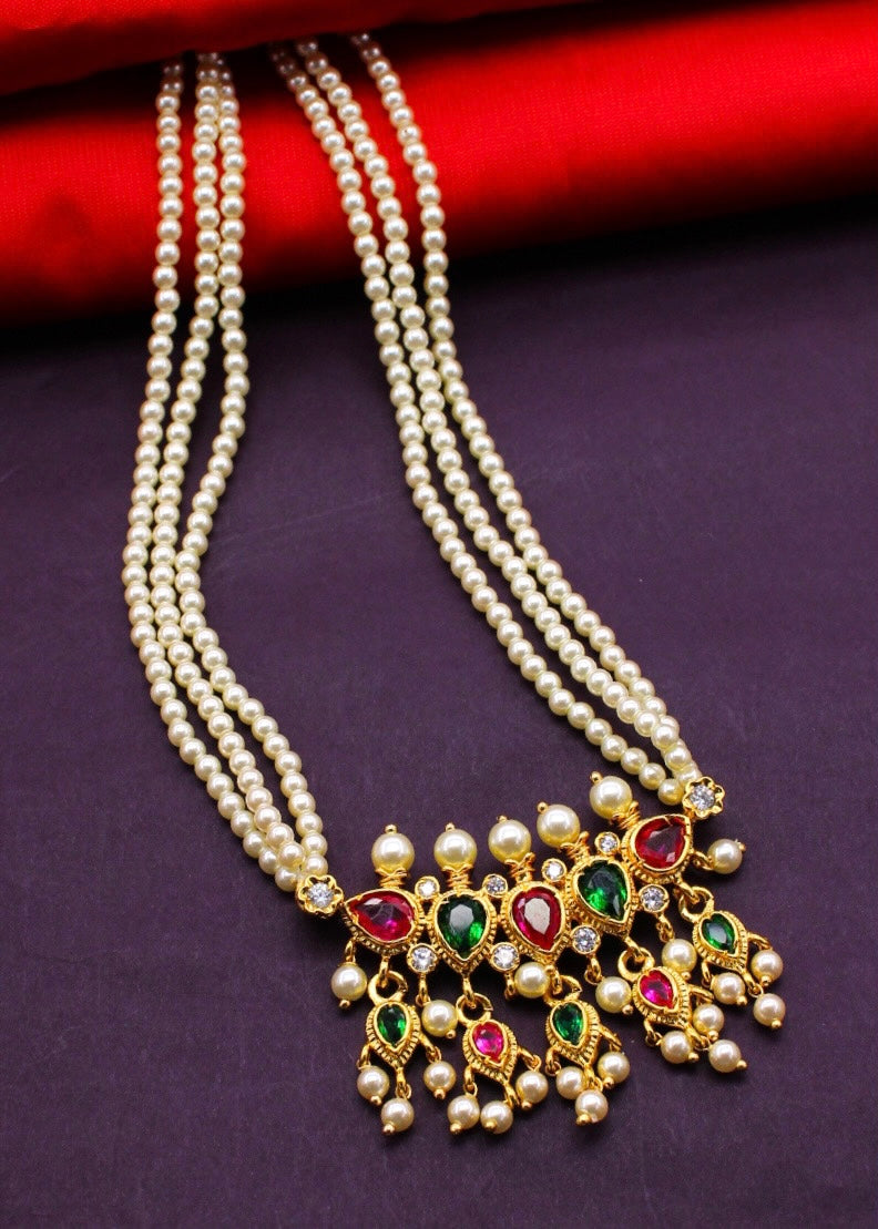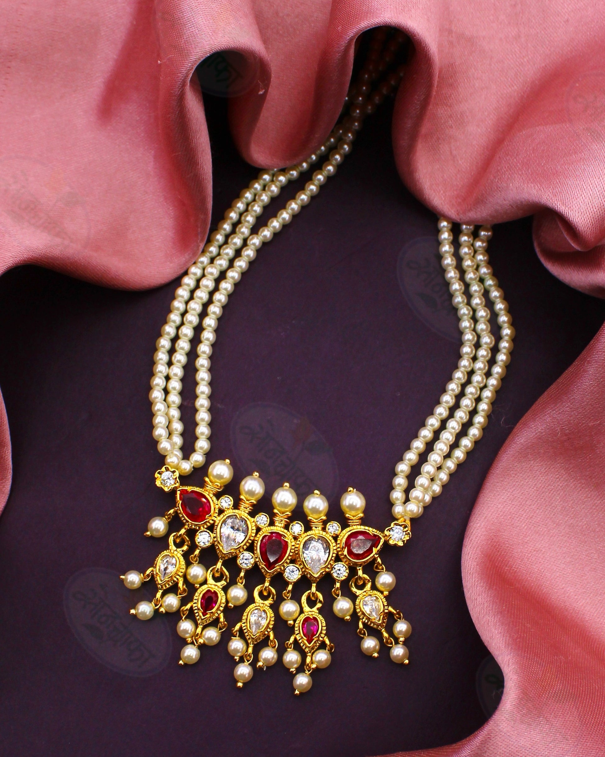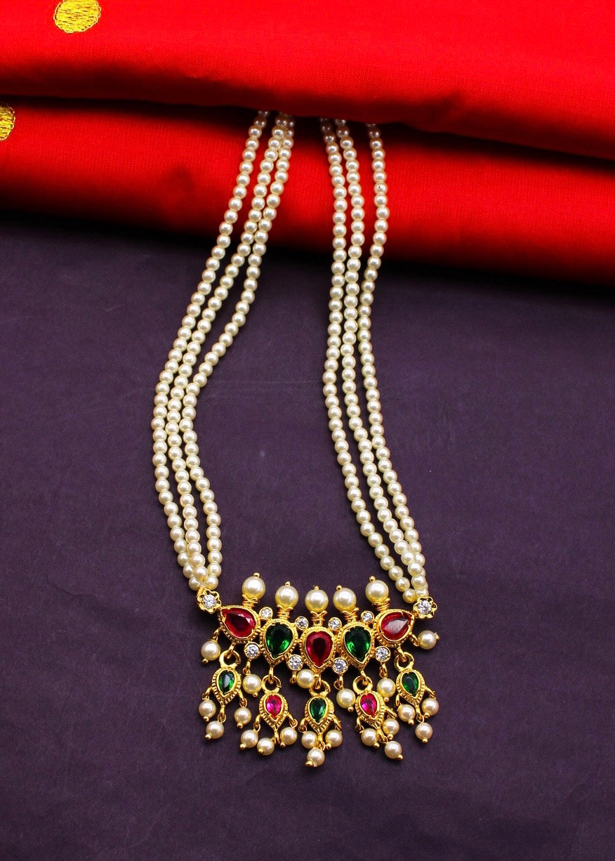 Complete your Maharashtrian look by clubbing this attractive Tanmani necklace set with your paithani saree. The pendant is studded with pink, green, white stones and made from golden finish metal. This necklace is woven with pearl beads and comes with adjustable dori, so that you can fit it properly.