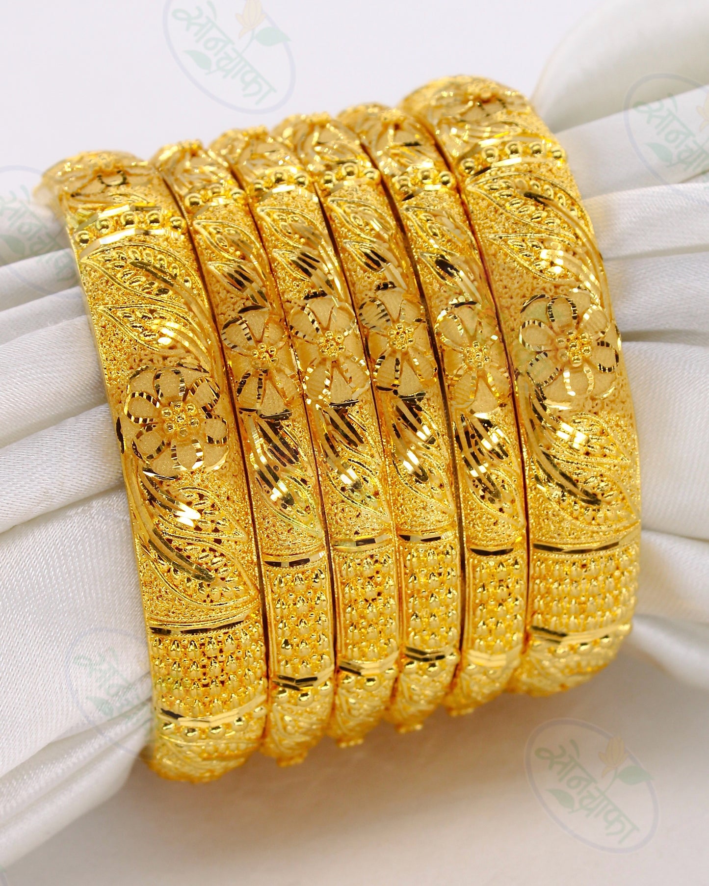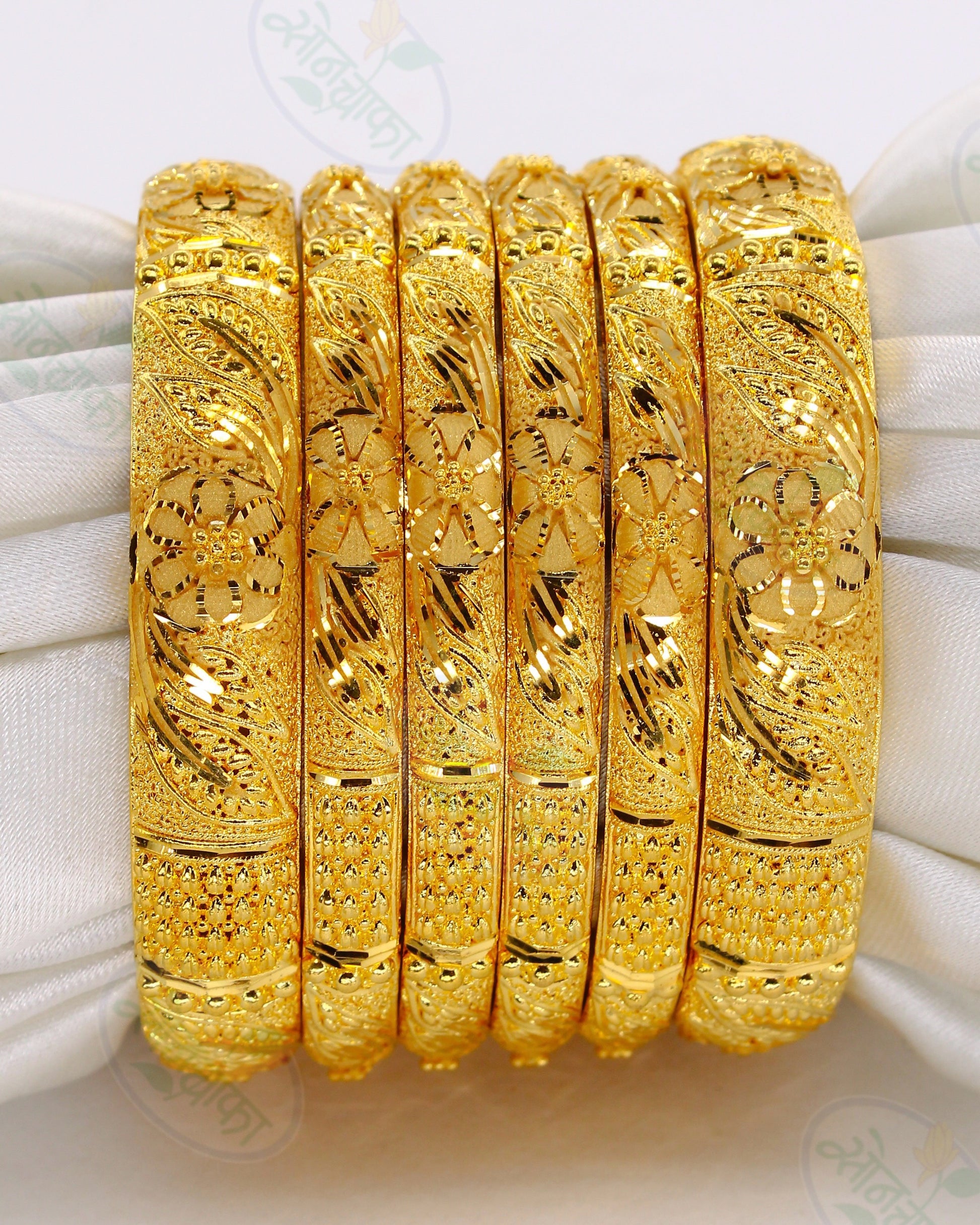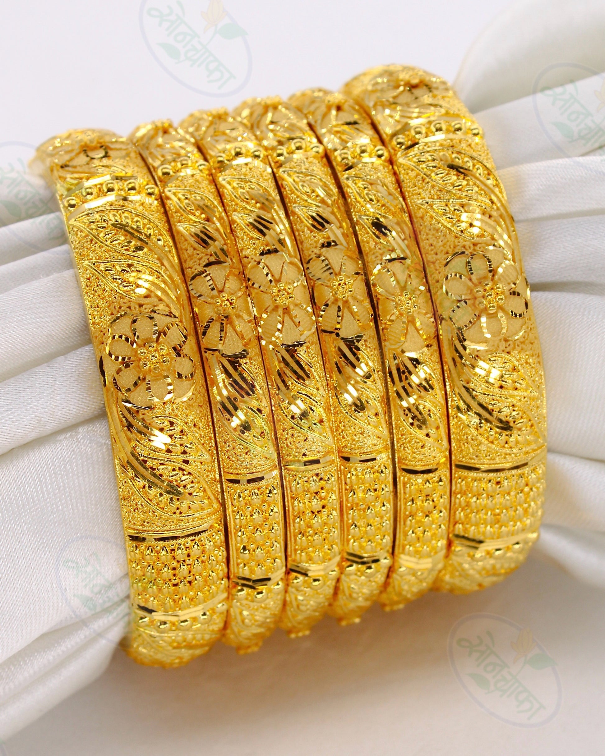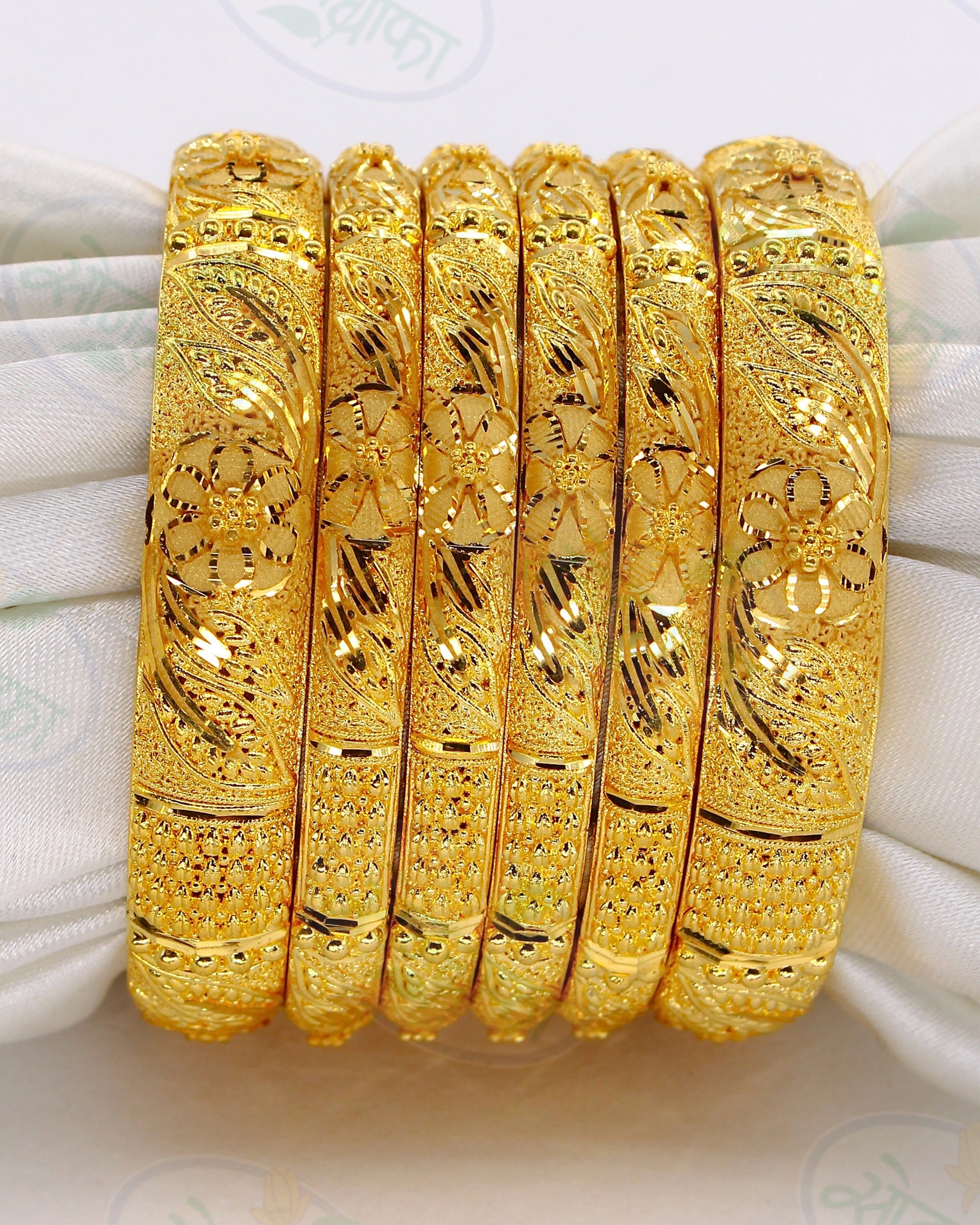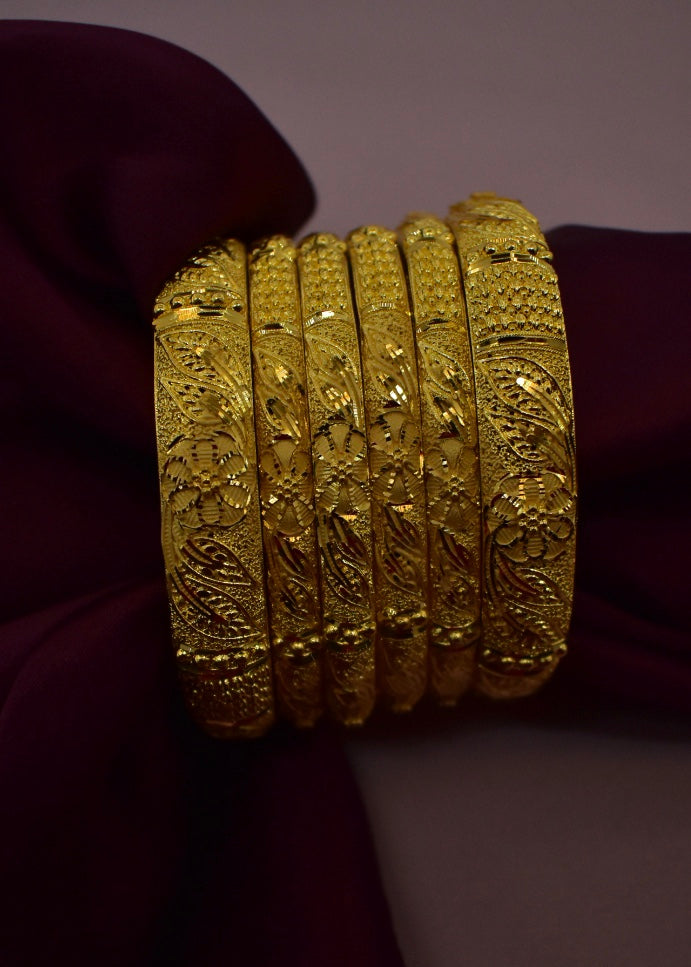 Must have in your 1 gram gold accessory collection this gold plated designer bangles from sonchafa Jewellery. It is encrusted with flower leaf design with golden beads on golden metal. These bangles are fashioned from golden plated metal and ensures high durability. These bangles are easy to wear.