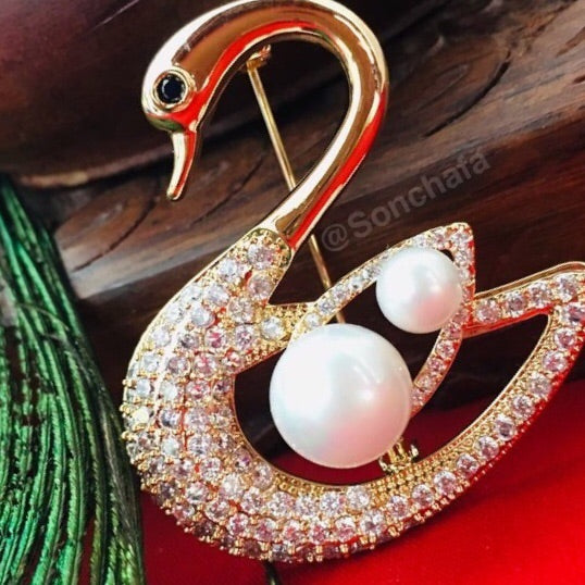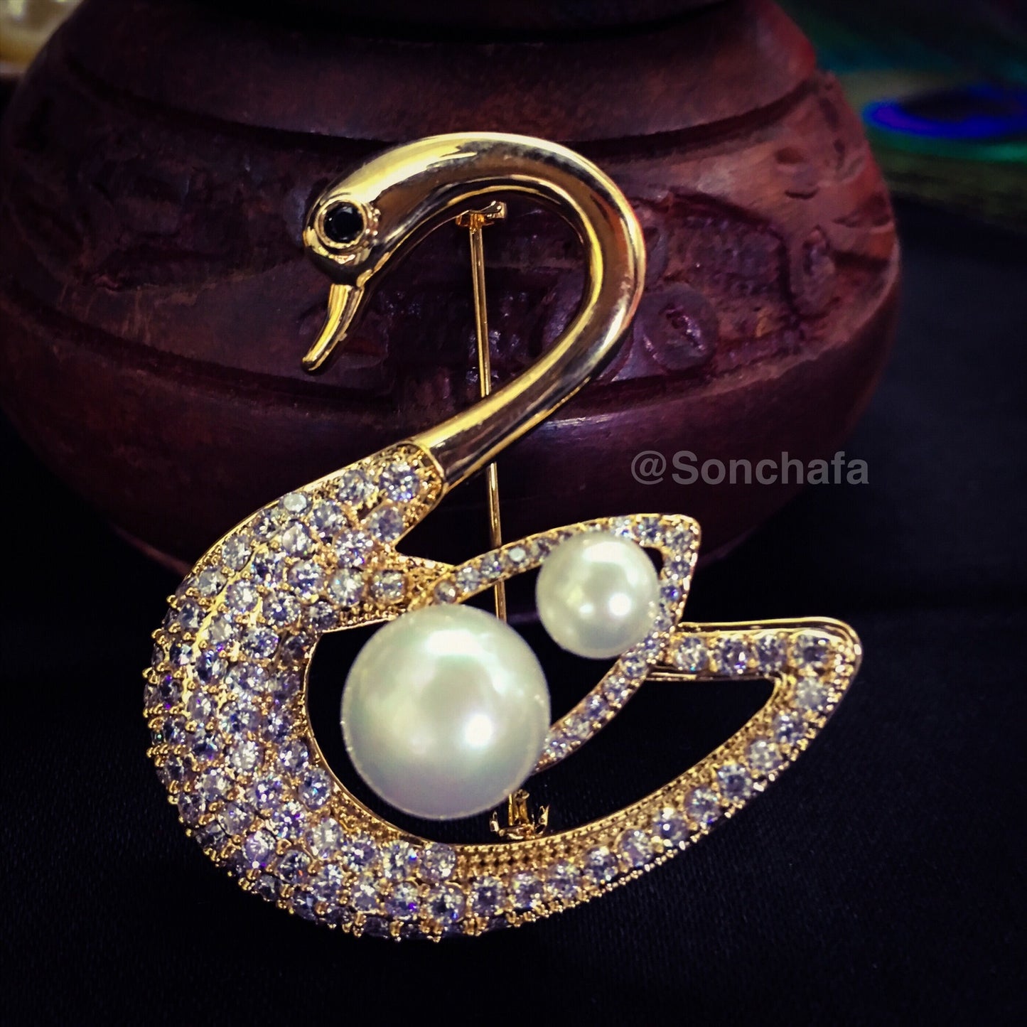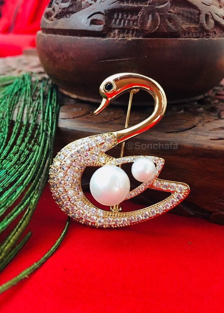 Swan inspired adorable sareepin from Sonchafa jewellery for this wedding season. It is styled with studded sparkling stone along with pearls beads and made from golden finish metal. This sareepin has completed your traditional look & durability for many years.