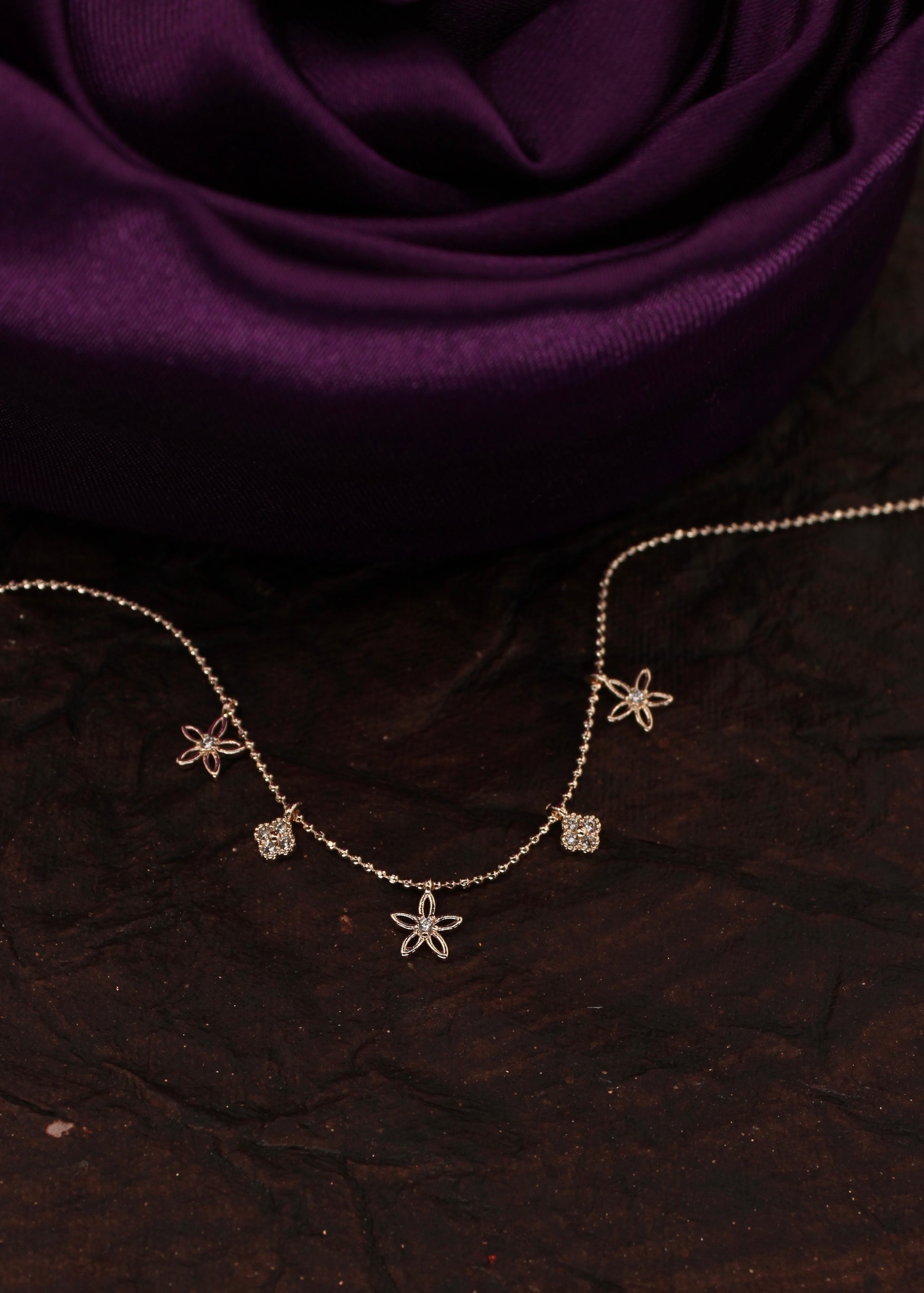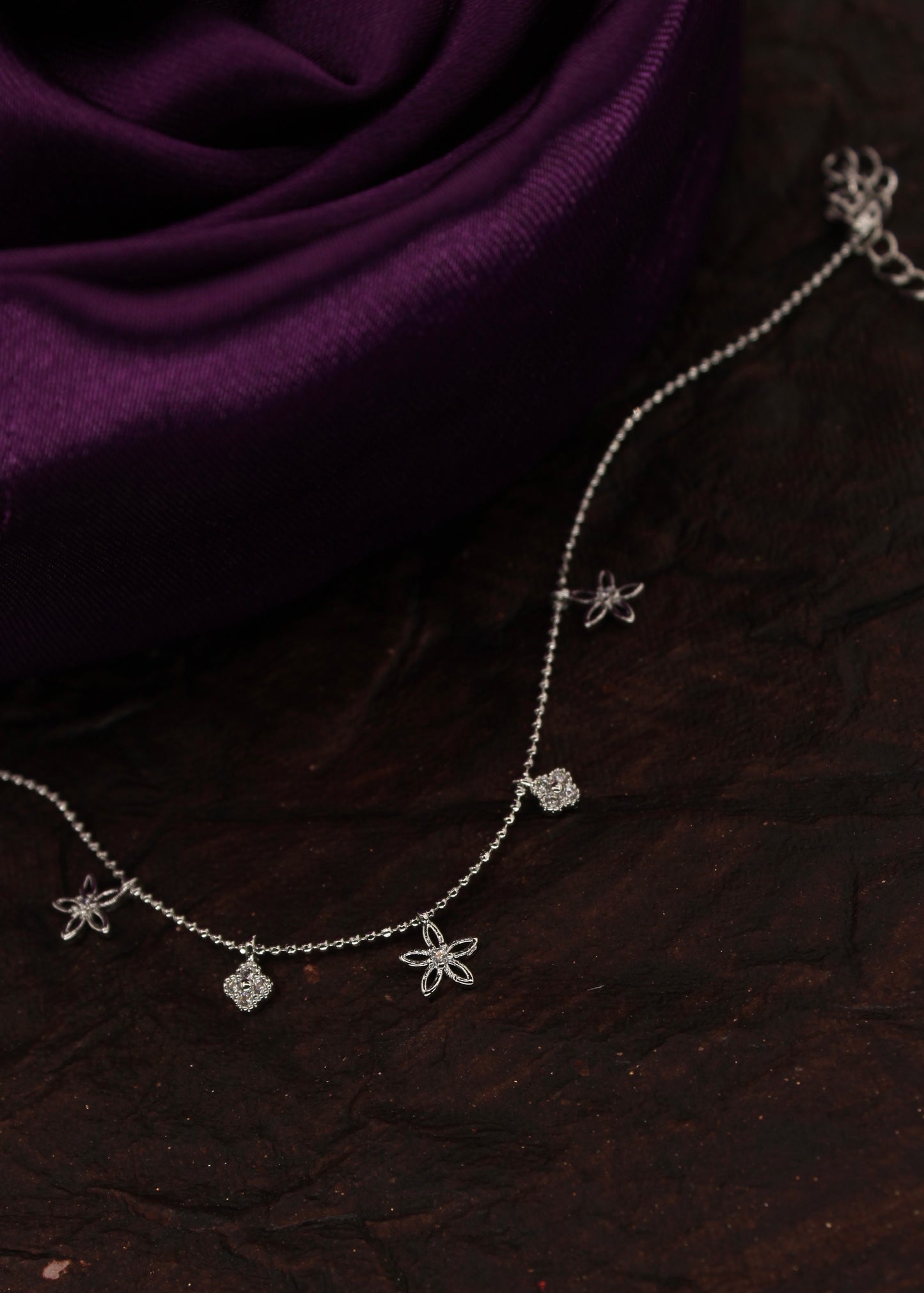 This petite floral designer anklet for Sonchafa Jewellery for stylish women like you. It is styled with studded dia diamond stone and made form high quality metal. This anklet is good in quality and will be your fashion companion for many years.