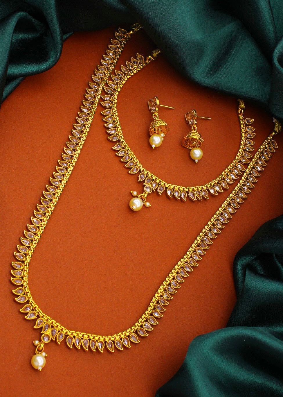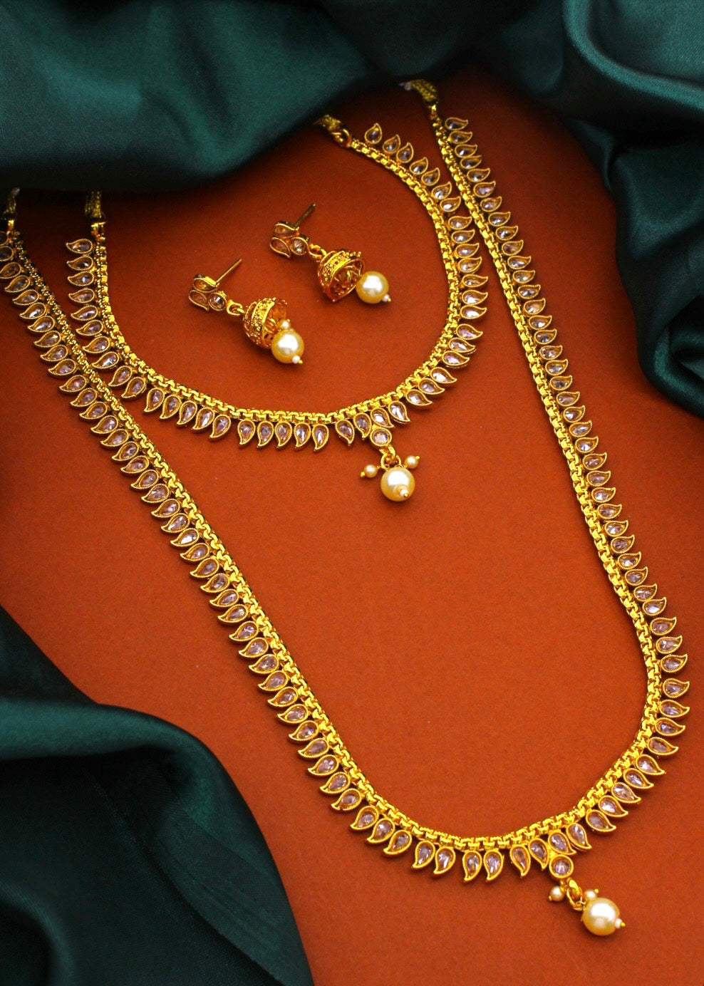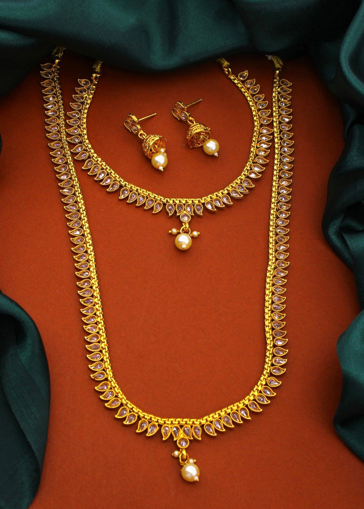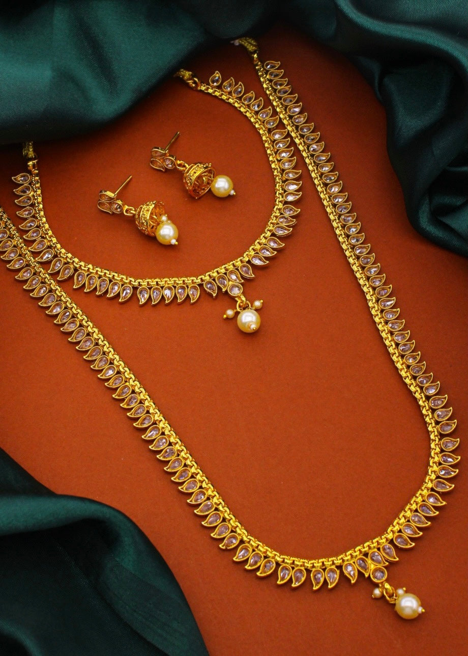 This wonderful traditional combo set from Sonchafa Jewellery for our stylish look. It is encrusted with shiny white stone along with pearl beads. This appealing designer necklace set is fashioned from antique golden finish metal. In addition it has pearl bead droplet.