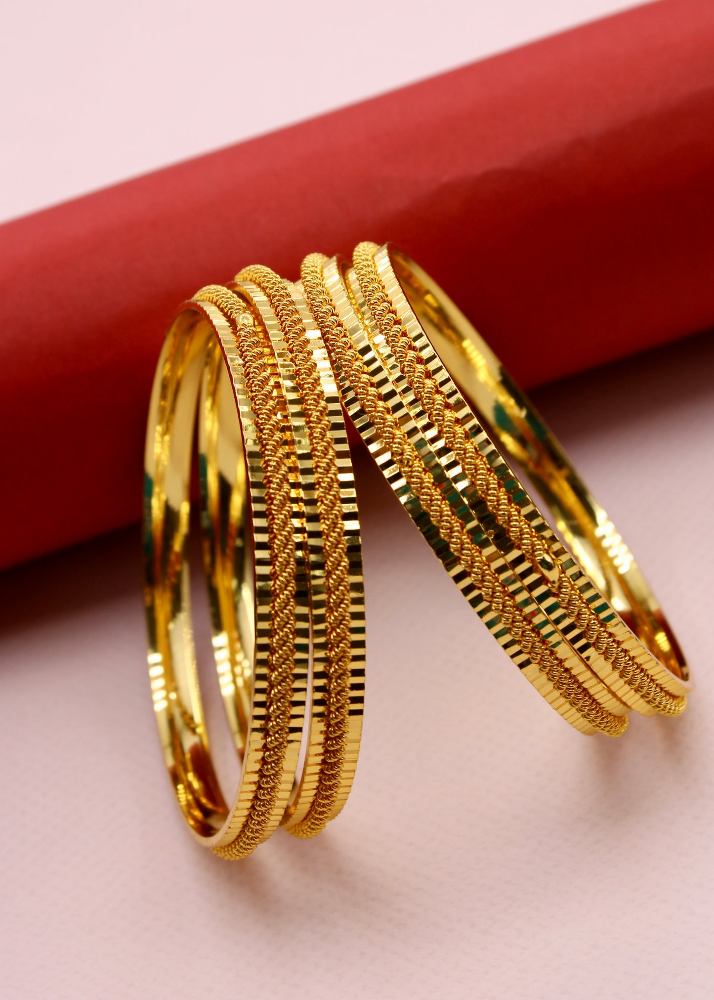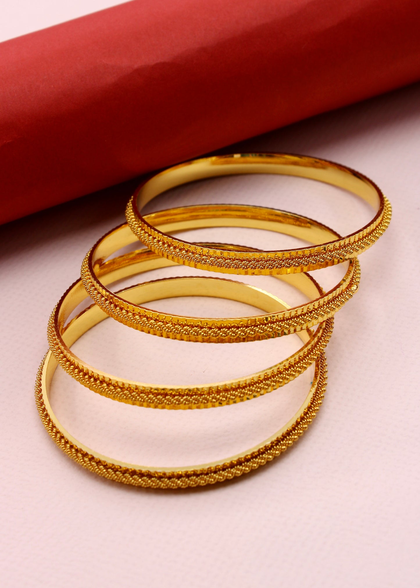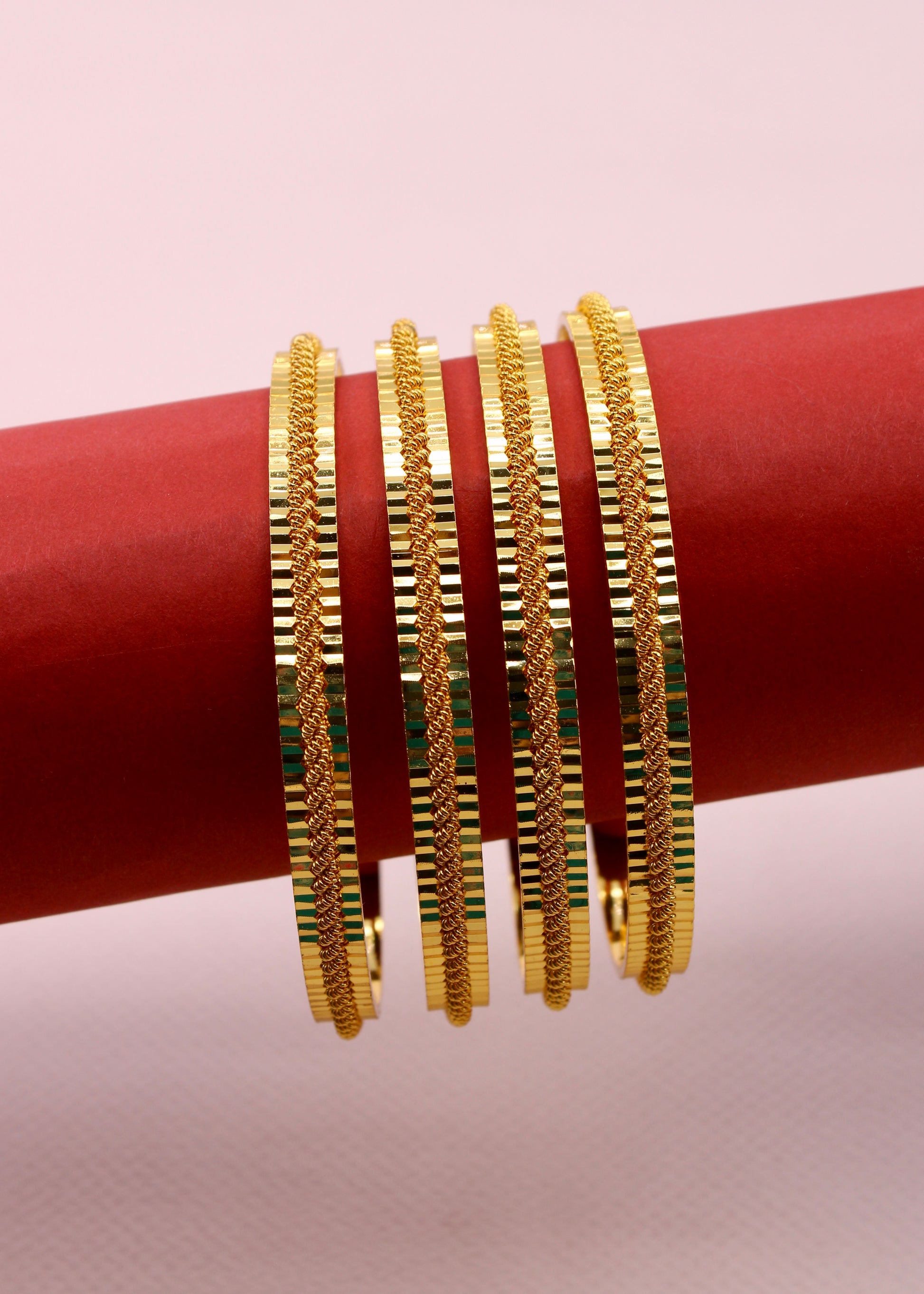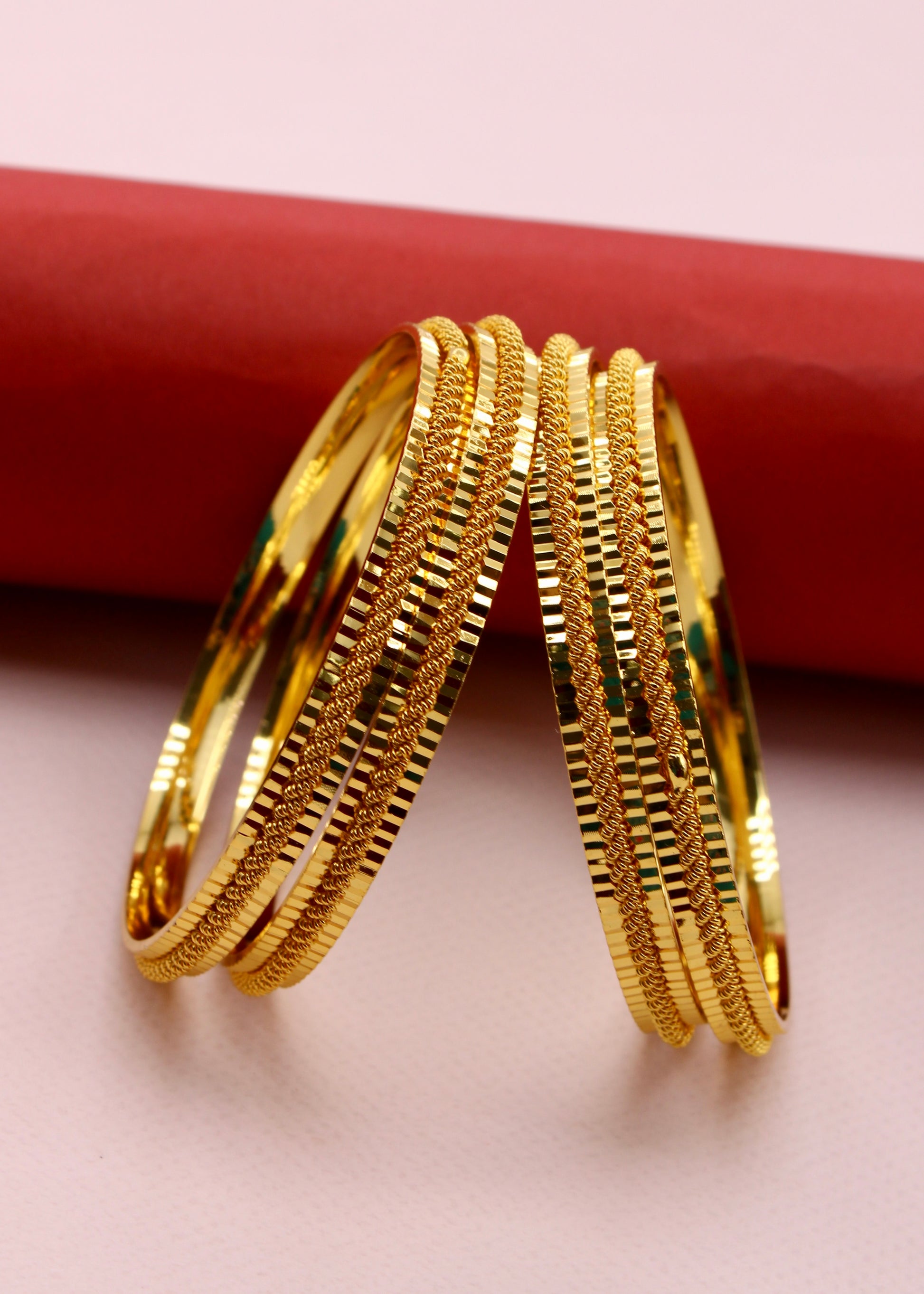 Step out in style by wearing this pair of beautiful bangles with your traditional saree. They are embedded with shimmering design on metal surface and crafted from antique gold finish metal. These bangles are good in quality and skin-friendly as well.