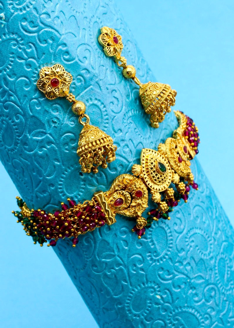 This season Sonchafa Jewellers brings to you this wonderful necklace set in classy look. It is encrusted with golden color stone and made from antique golden finish metal. The design of this necklace set is very attractive and worth noticing. It is long lasting and high in durability.