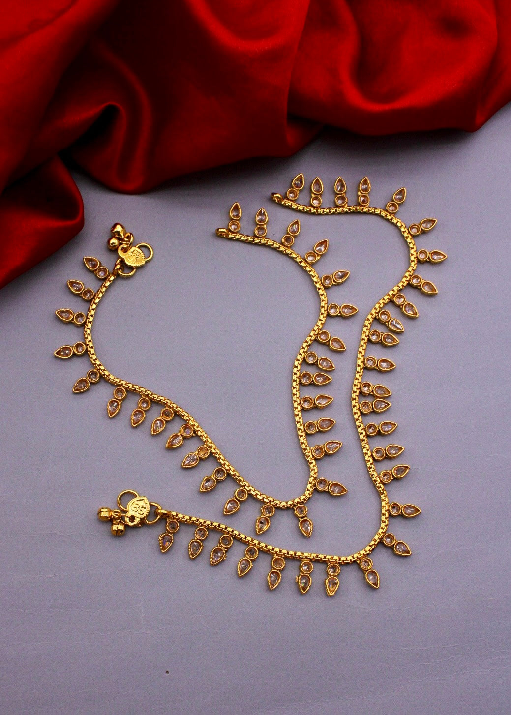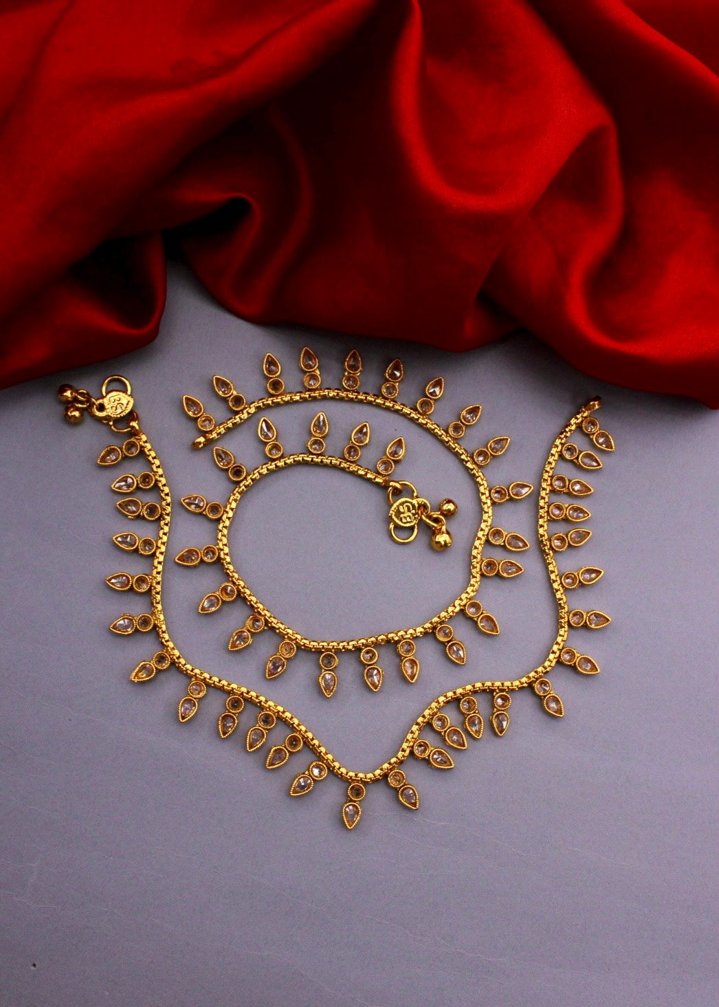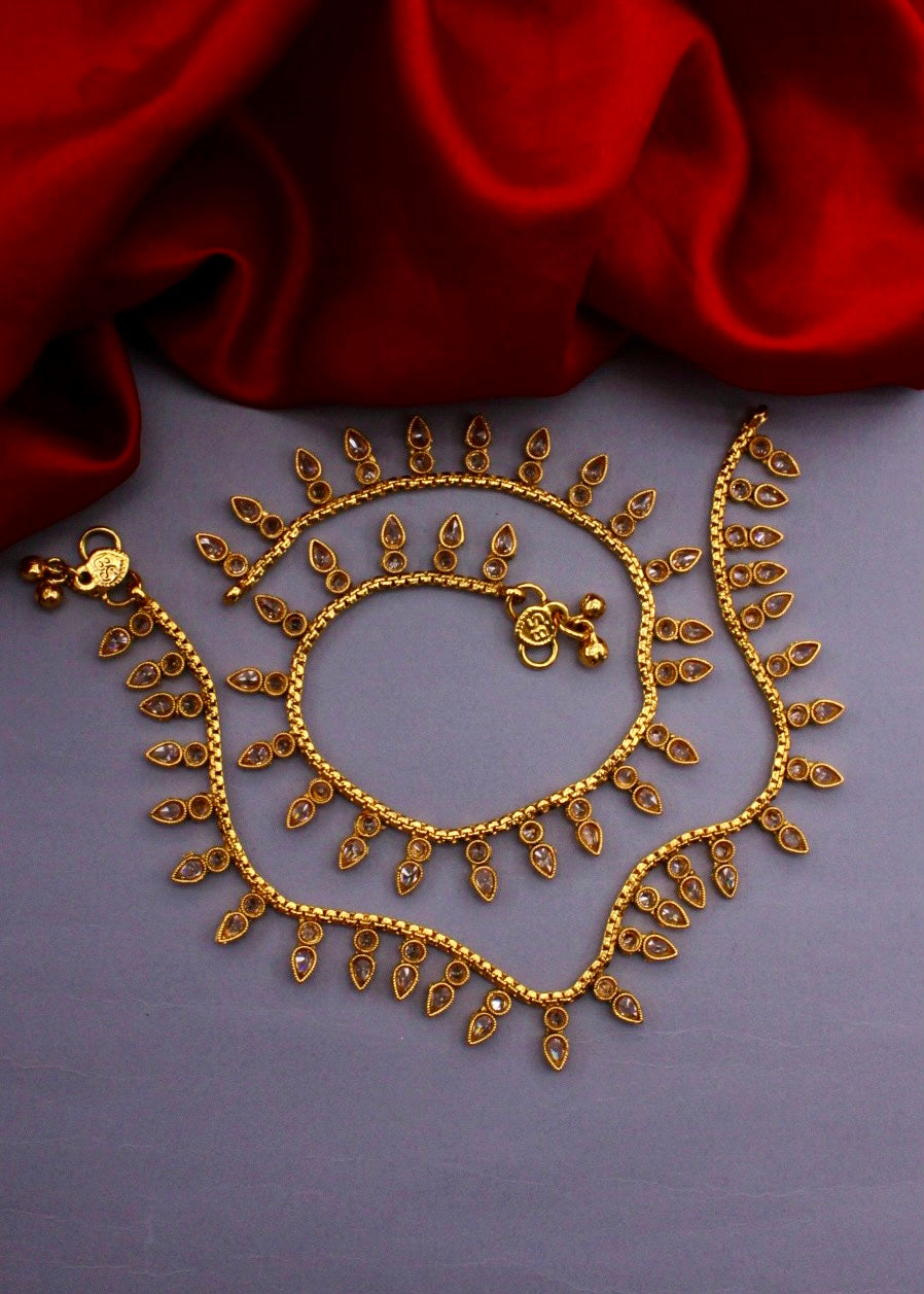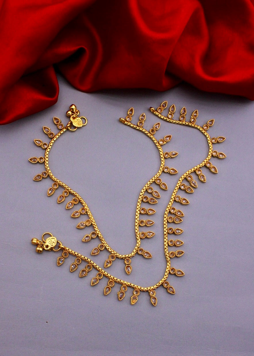 Adorn your jewellery collection with this antique payal from Sonchafa Jewellers. These are embedded with golden colour stones and fashioned from antique golden finish metal to ensures high durability. These anklets are high in quality and skin-friendly as well.