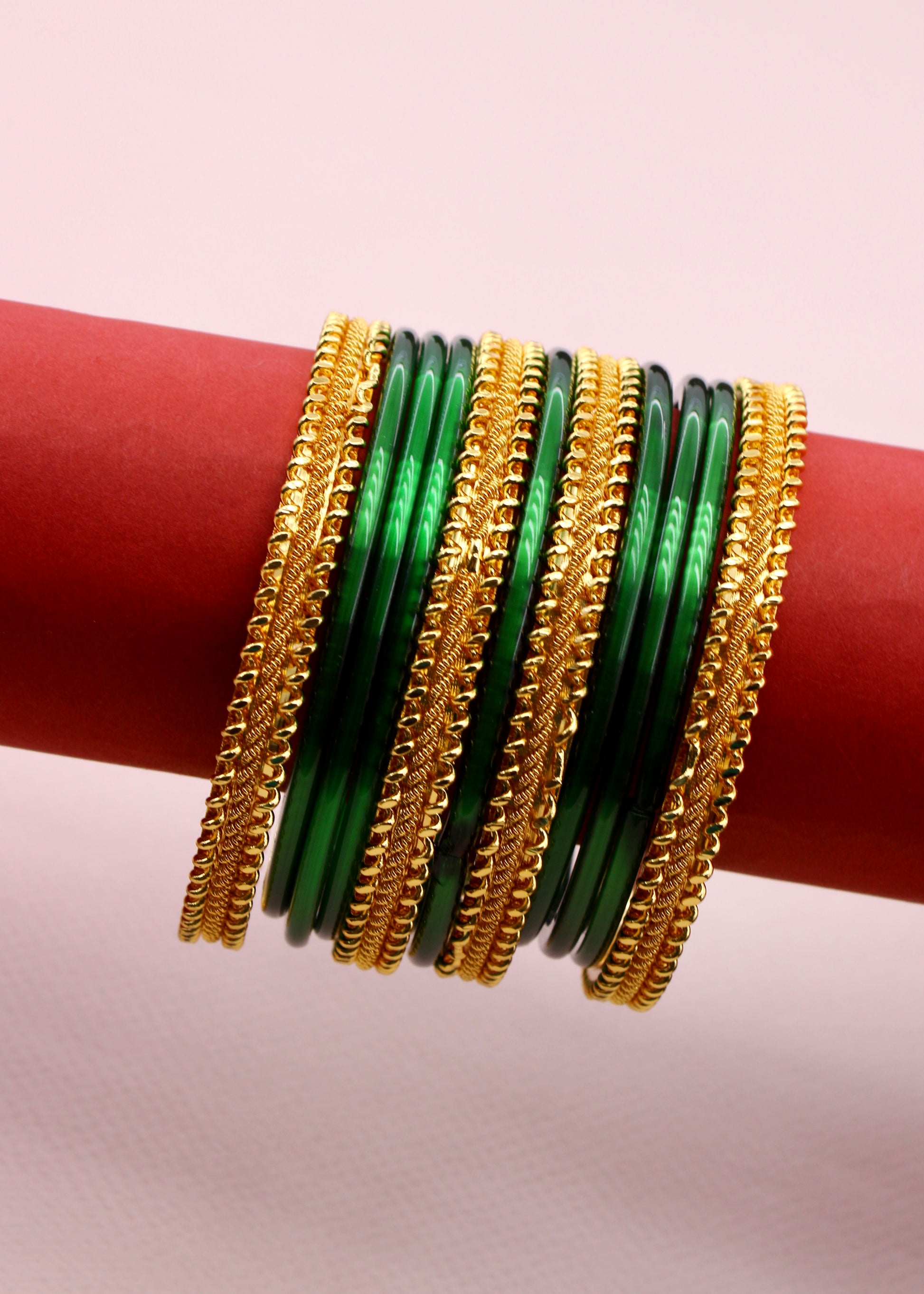 Upgrade your jewellery collection by adding this set of four bangles from Sonchafa Jewellery. They are encrusted with shimmering gold design and made from antique gold finish metal. These bangles are easy to wear as light in weight and comfortable to hold all day long.