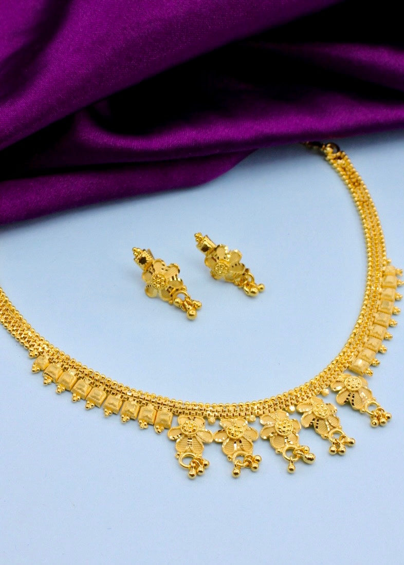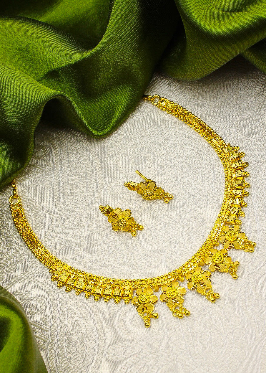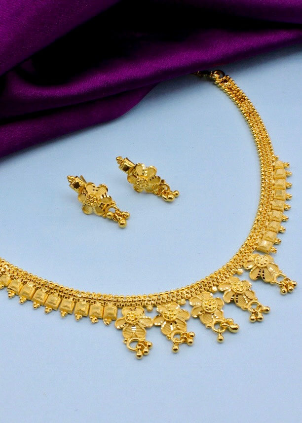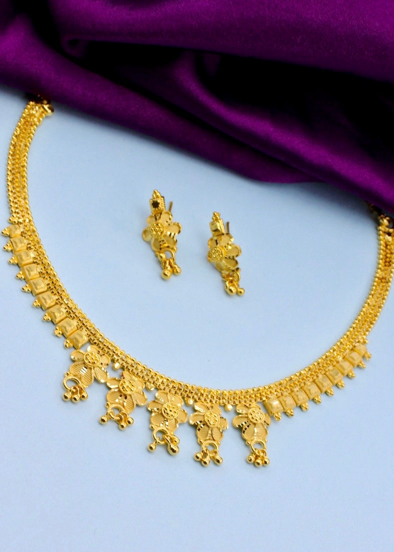 If you wish to look outstanding on festive occasion then you must pick this Flower designer necklace set from Sonchafa Jewellery. It is styled with gold colour and wonderful droplet gold beads. This necklace set is made from 1 gram gold plated metal and ensure high durability.