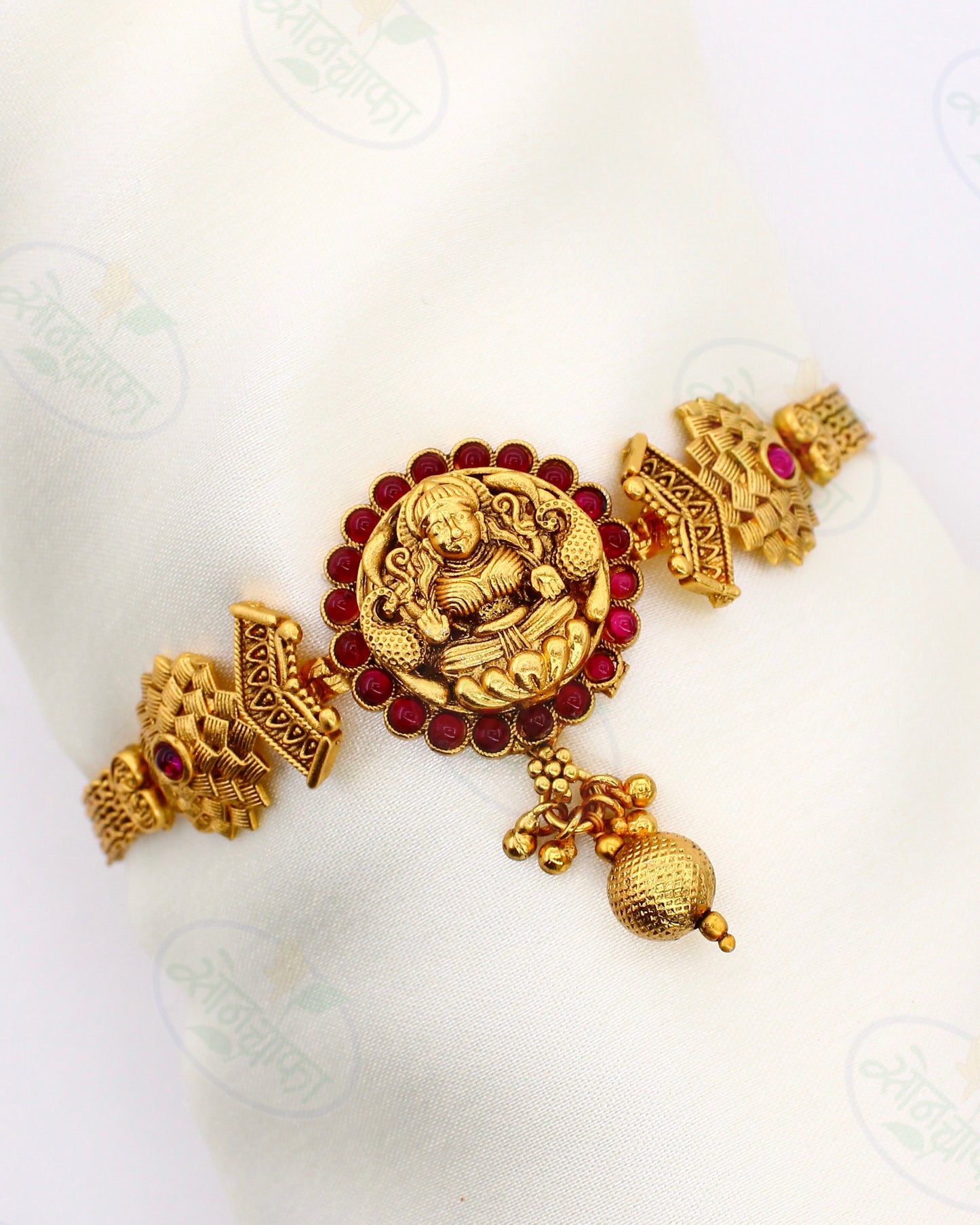 Creatively designed this antique golden finish appealing waki from Sonchafa Jewellery is best to complete your traditional look. It is studded with sparkling pink stones and made from antique golden finish metal. This armlet is easy to wear as it is adjustable in size.