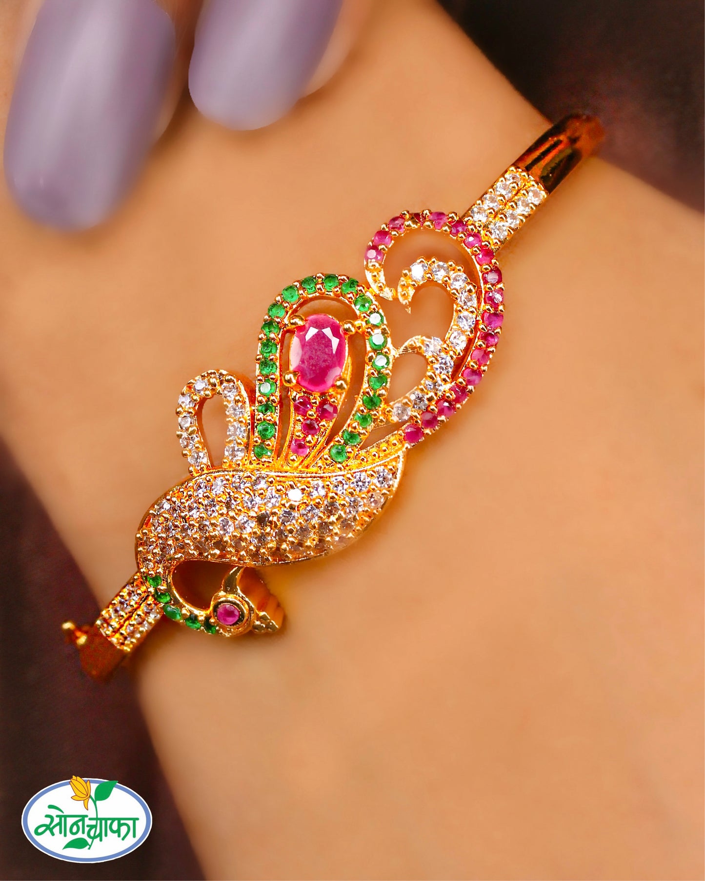 Complete your party look by clubbing this adorable bracelet from Sonchafa Jewellery. It is embedded with white stone and crafted from golden finish superior quality metal. It is long lasting and rust-resistant as well. This fancy bracelet is easy to wear and comfortable to hold.