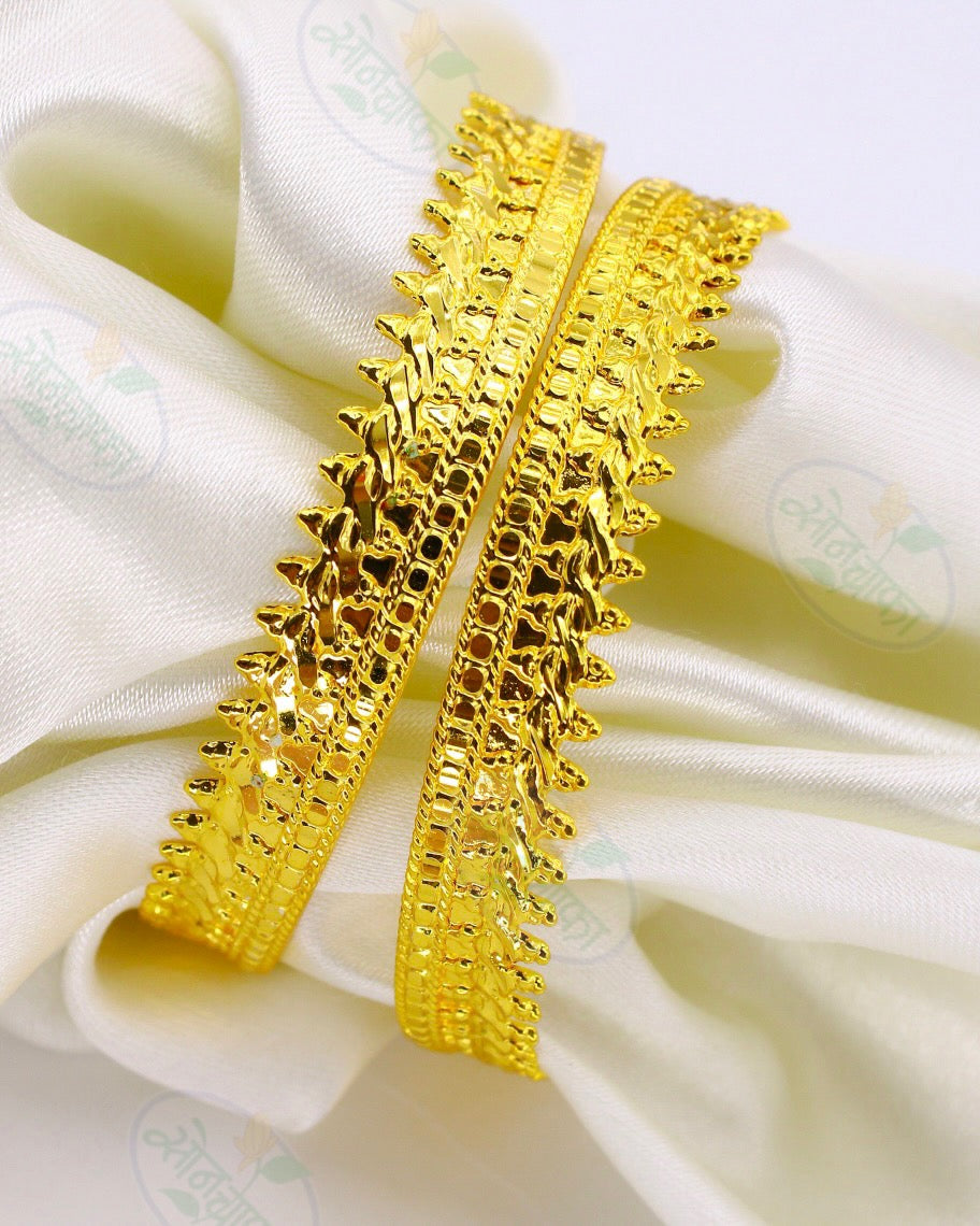 Beautify your wrist by adorning this pair of 1Gram gold plated appealing bangles with your fancy saree. They are encrusted with shimmering design and made from golden finish metal. These bangles are made from alloy brass and metal and ensure high durability.