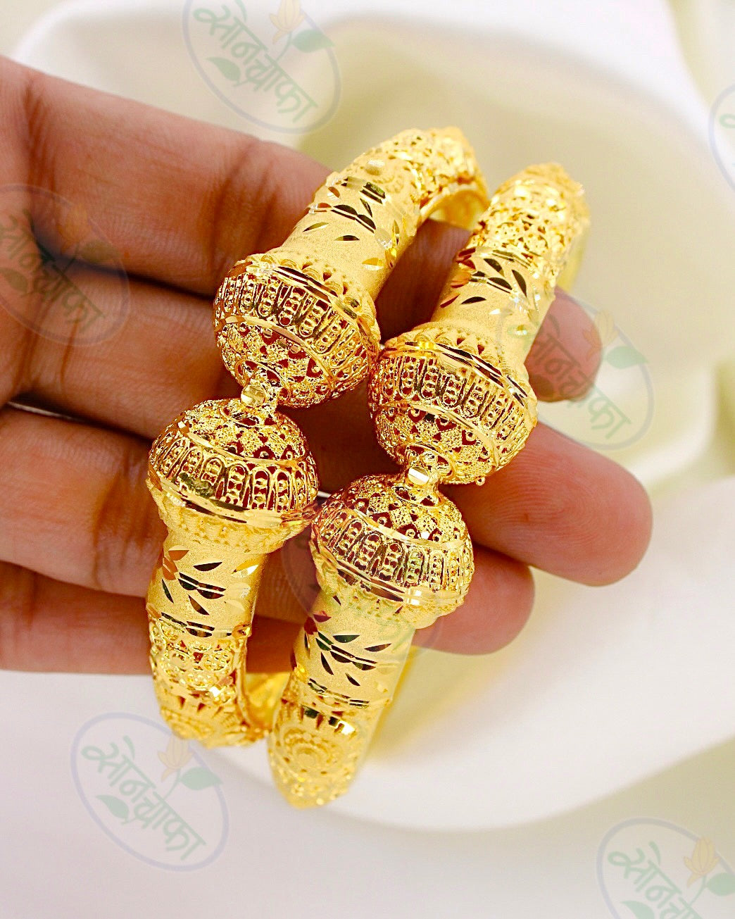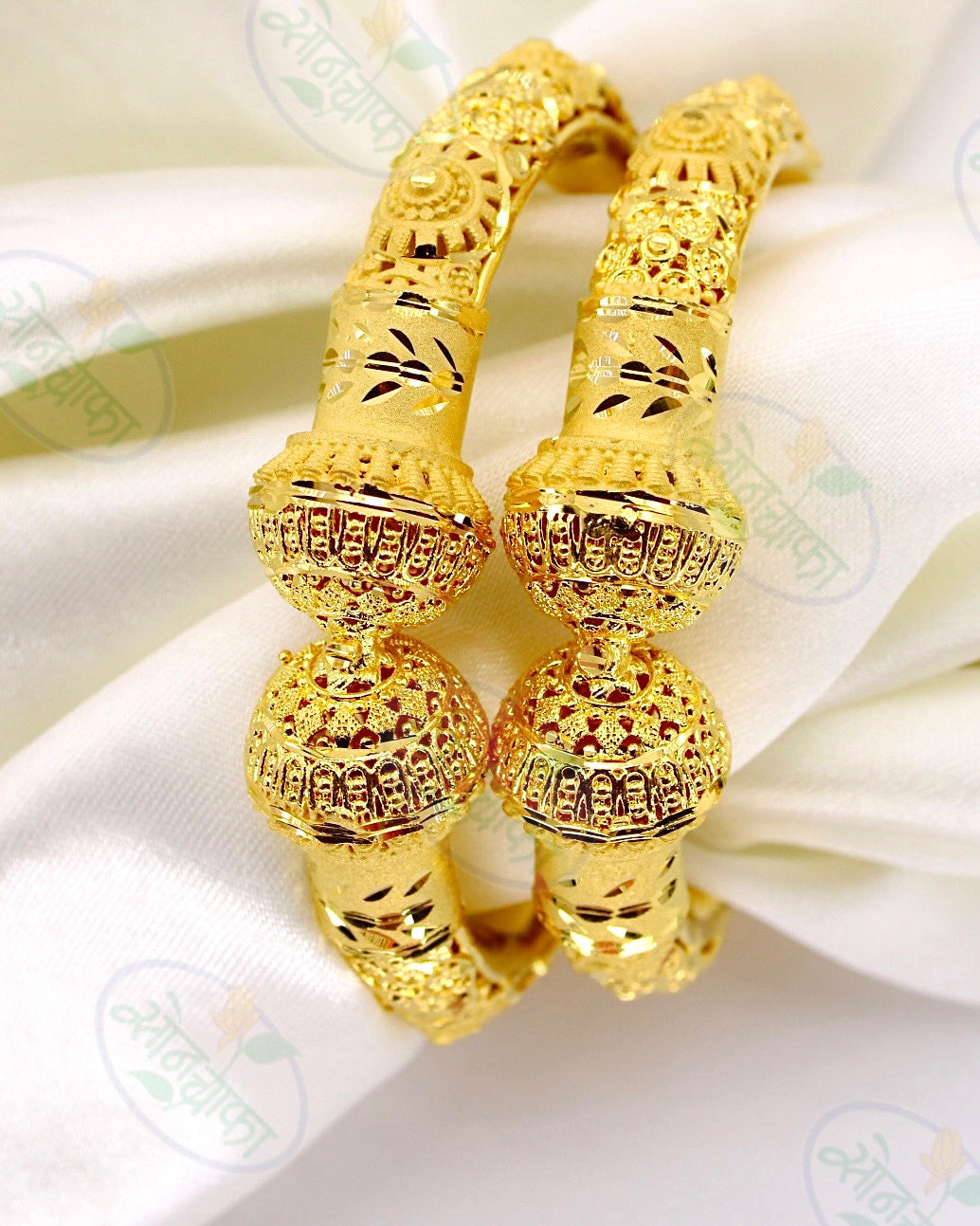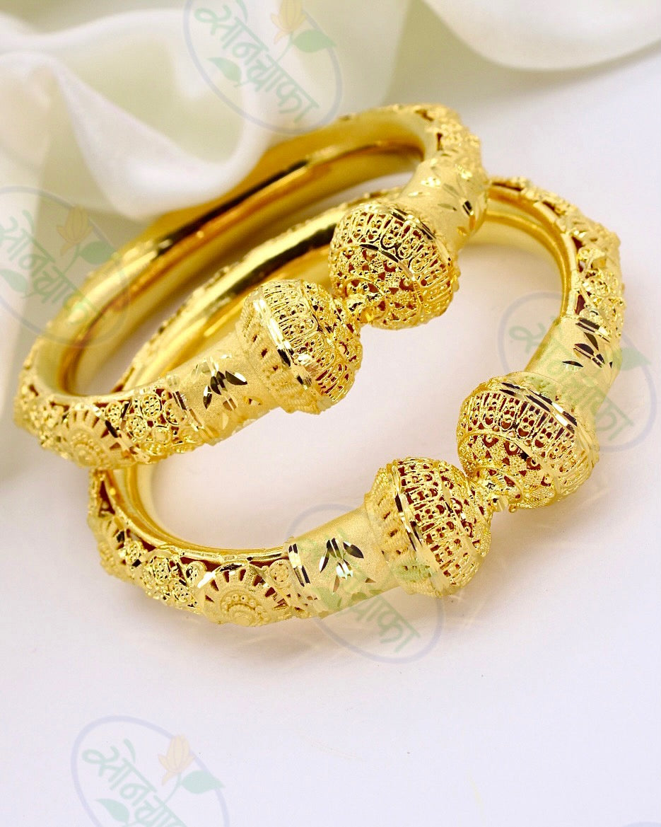 Exclusively designed this pair of 1 Gram gold plated appealing 2 bangles from Sonchafa Jewellery. They are studded with sparkling gold tone with mina work and made from golden finish metal. These wonderful bangles are easy to use.