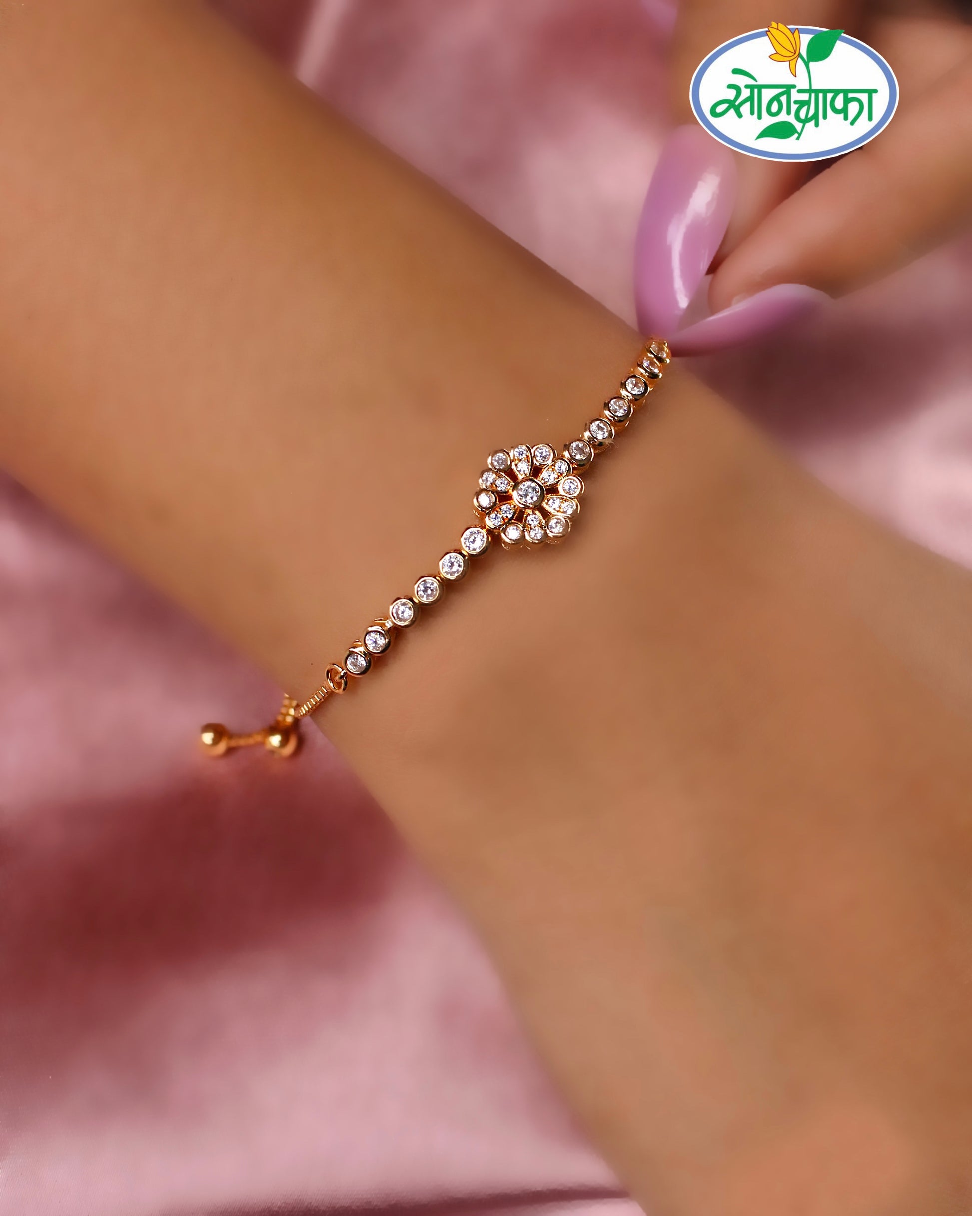 Complete your party look by clubbing this adorable bracelet from Sonchafa Jewellery. It is embedded with white stone and crafted from rose gold finish superior quality metal. It is long lasting and rust-resistant as well. This fancy bracelet is easy to wear and comfortable to hold.