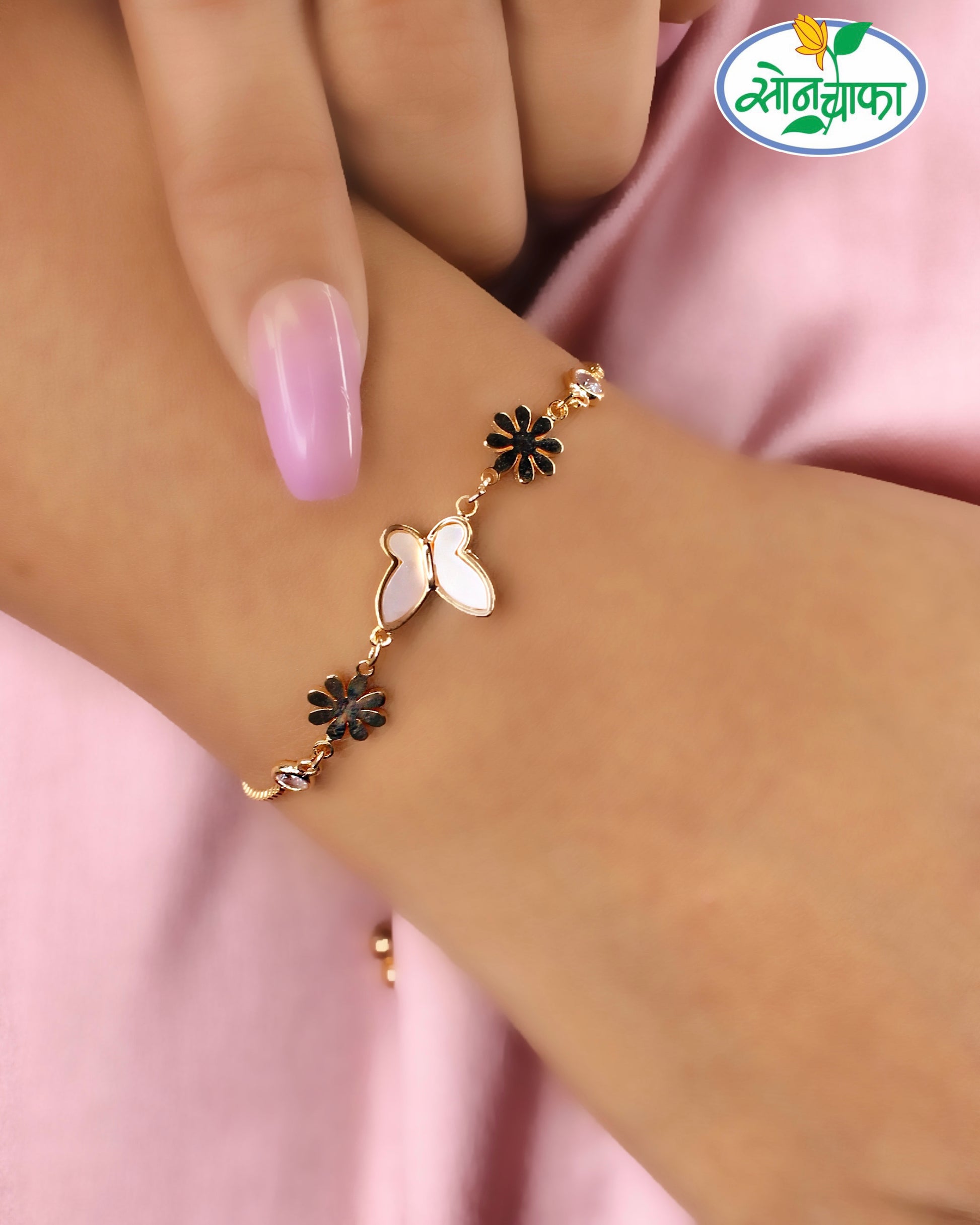 This festive time Sonchafa Jewellery presenting Butterfly designer bracelet for your pretty look. It is wonderfully crafted with rose gold finish metal along with studded white dia diamond stones. This bracelet is good in quality and rust-resistant as well.