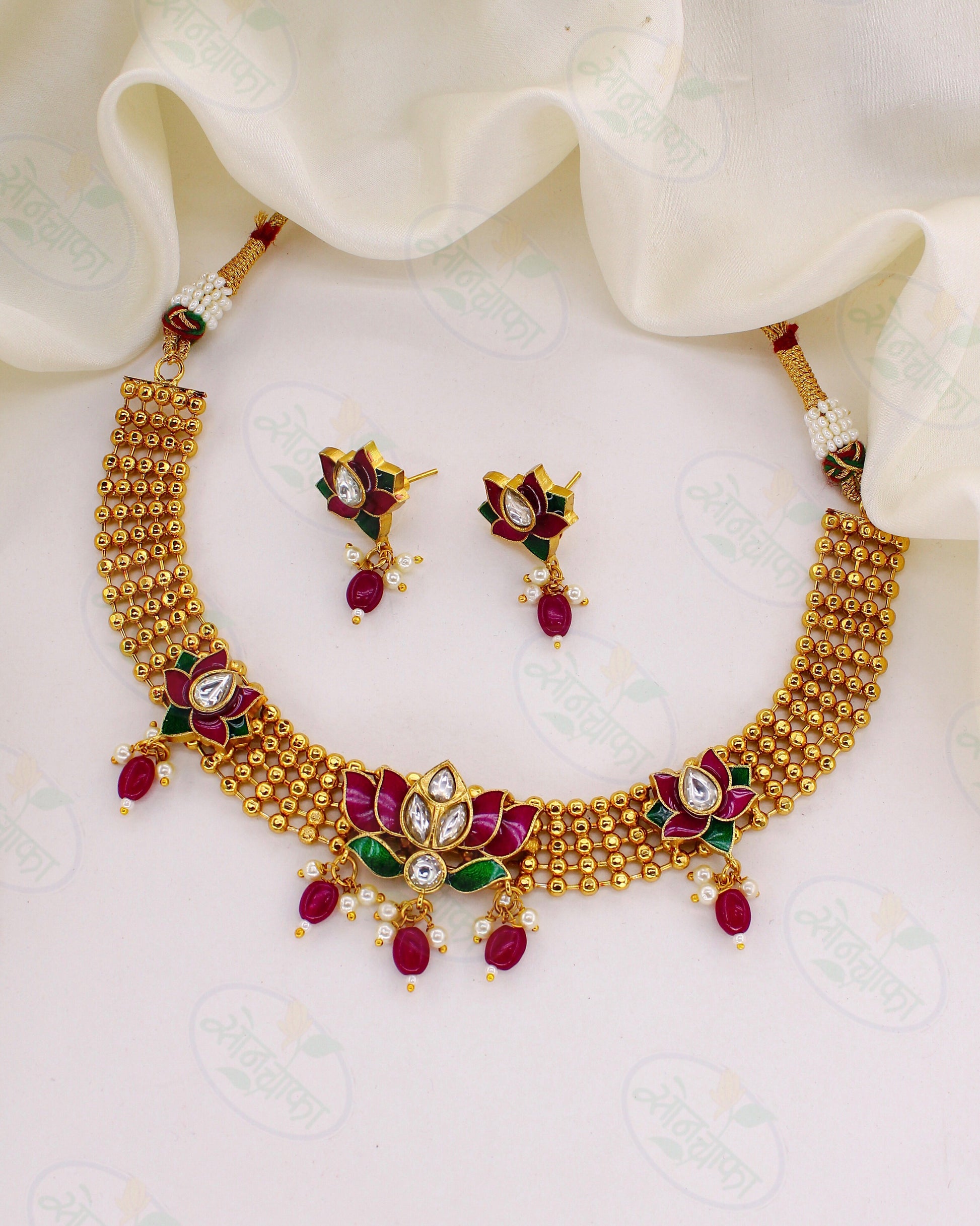 Presenting this golden beads classy necklace for fashion-conscious women who love to adorn traditional jewellery. The round shape pendant & beads feature eye-pleasing intricate carving design and fashion form antique golden finish meal. This necklace is ensures high durability.