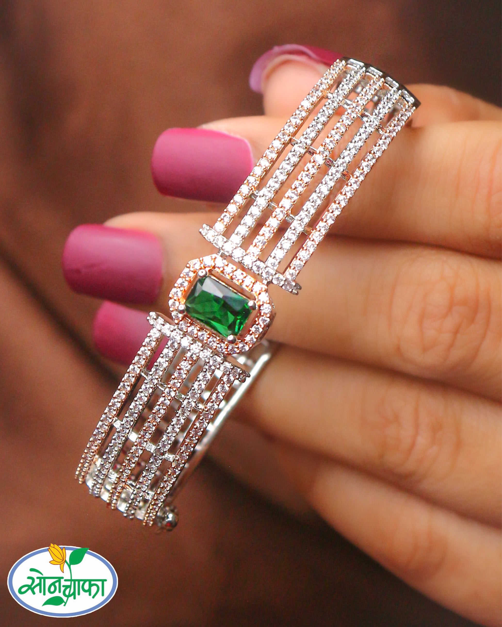 Exclusive designer bracelet from sonchafa Jewellery will blow your heart at very first look. It is encrusted with precious dia diamonds along with white stones and made from rose gold finish metal. You can wear this bracelet easily as it is adjustable.