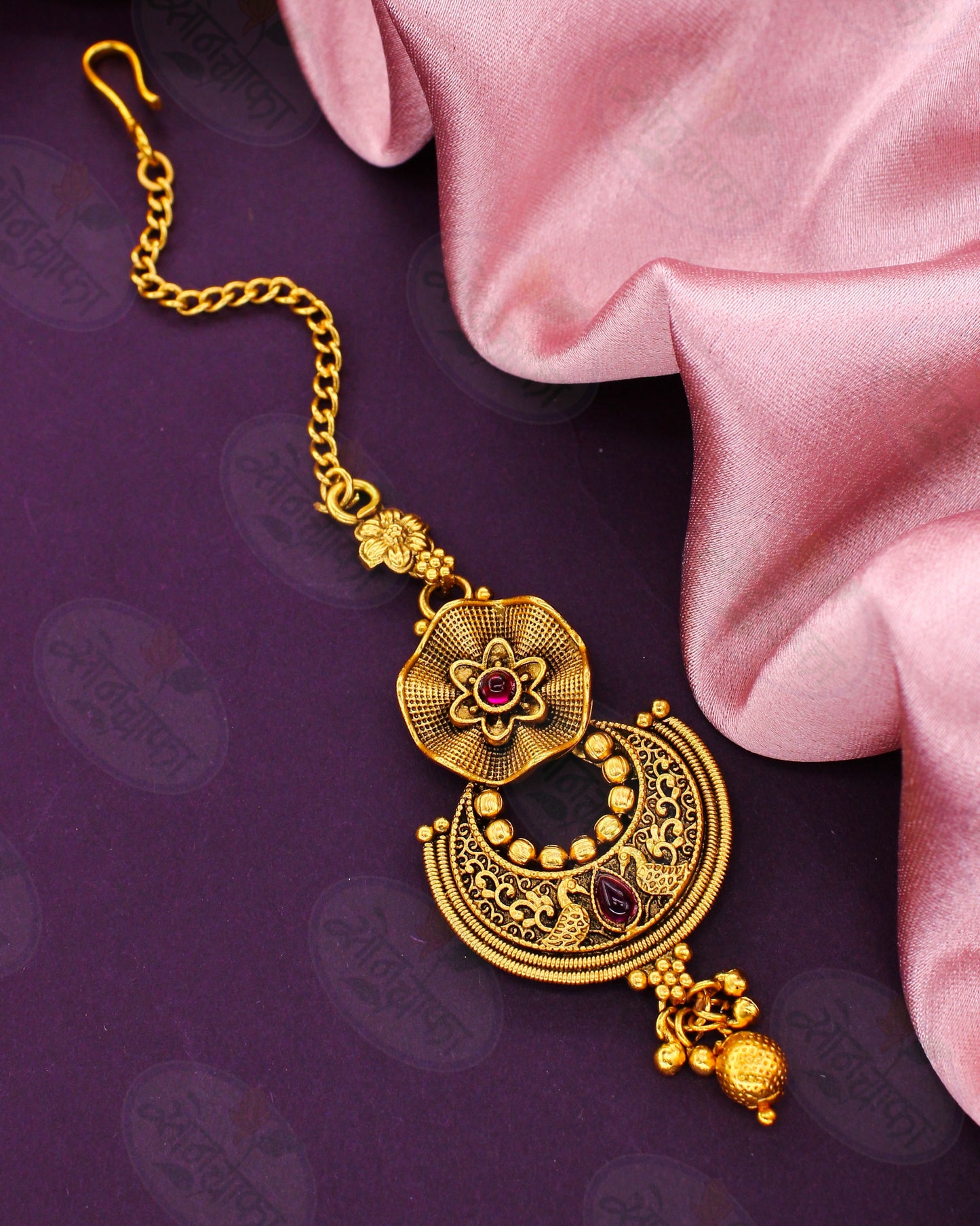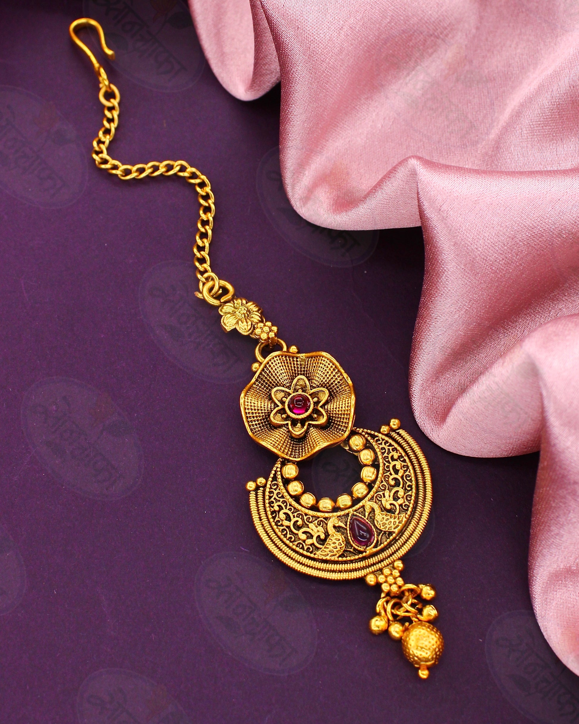 Simple yet very pretty this golden finish appealing bindi from Sonchafa Jewellery is best pick for modern women. It is embedded with pink, green stone along with golden beads and made from golden finish metal. This bindi has studded stone for added attraction.