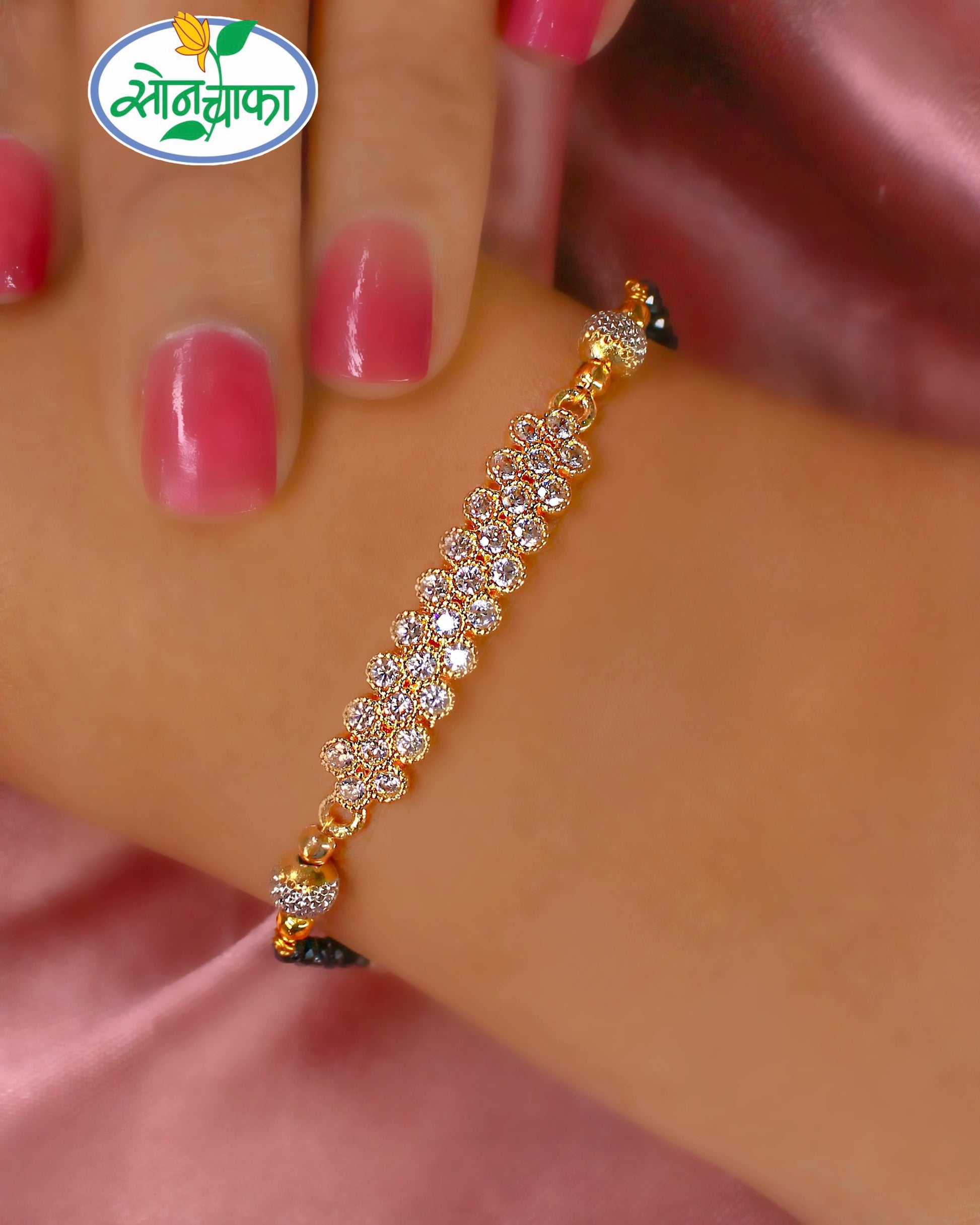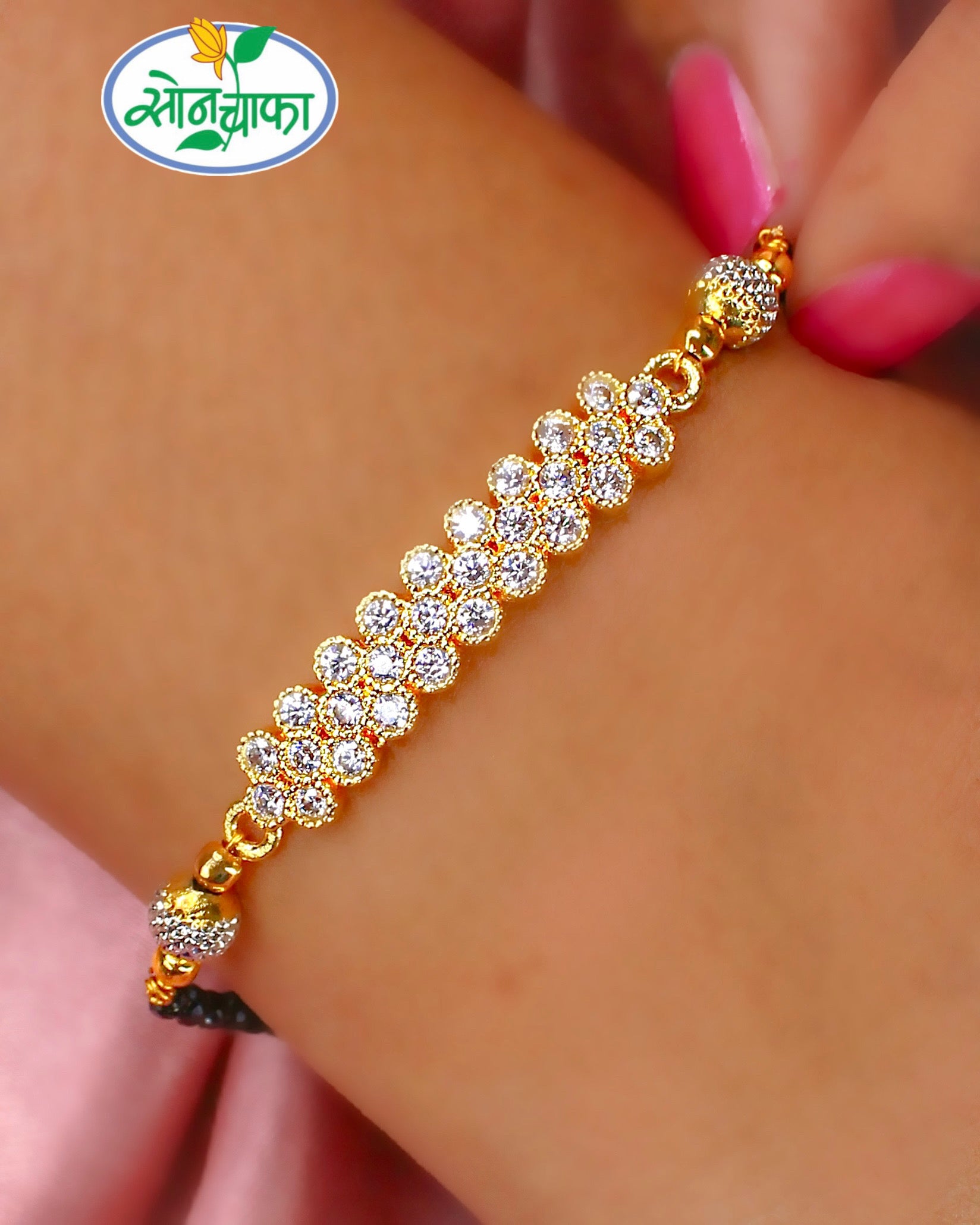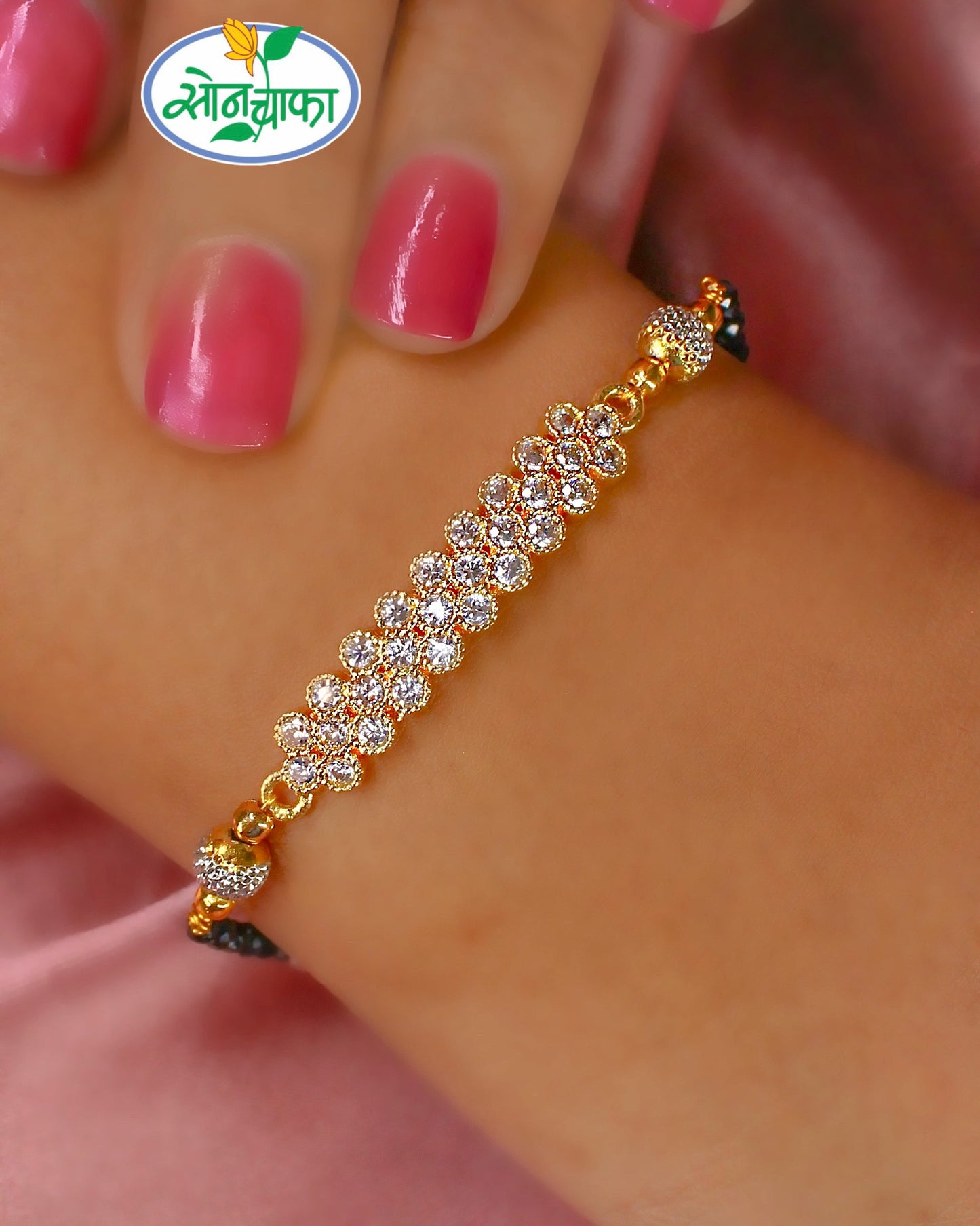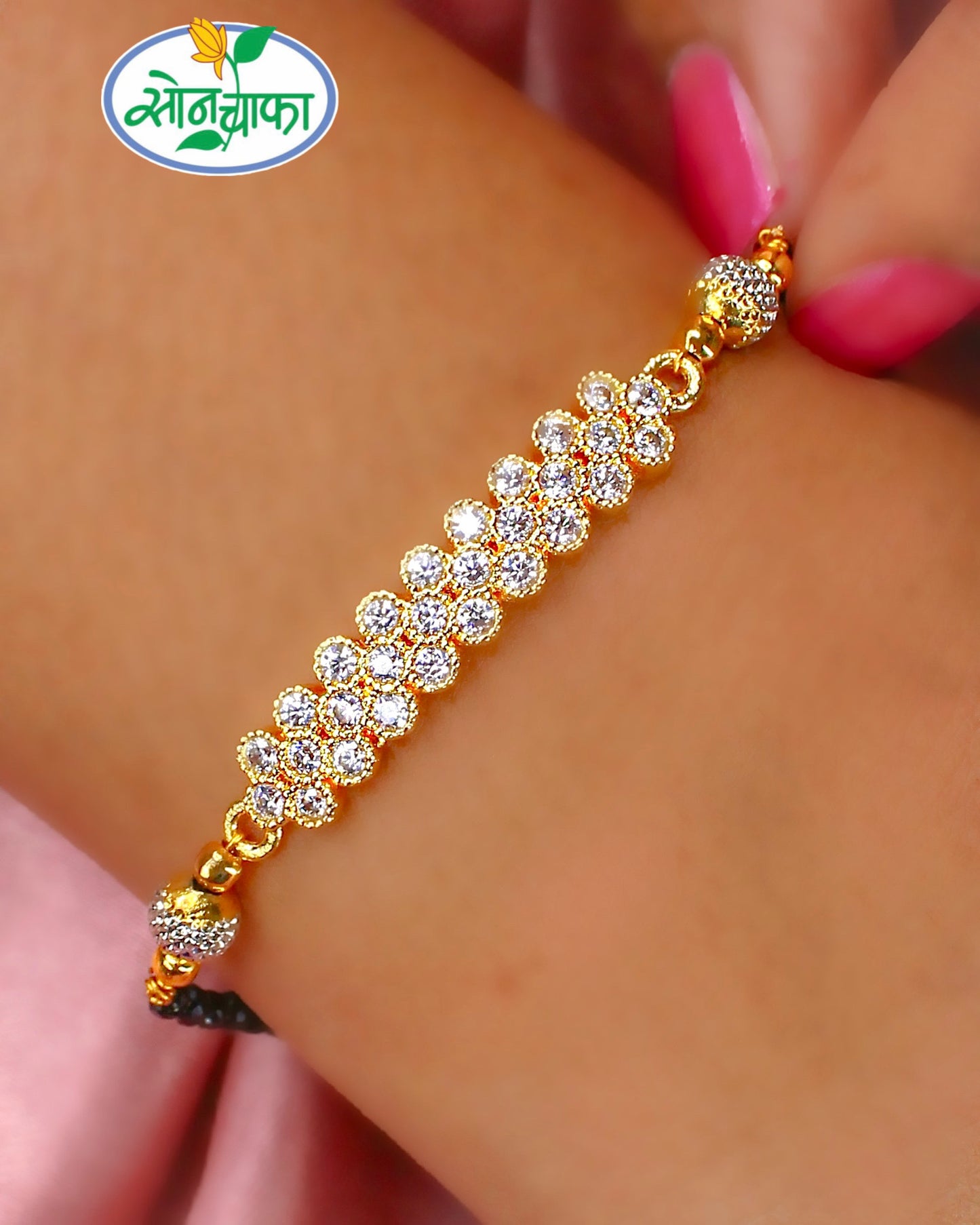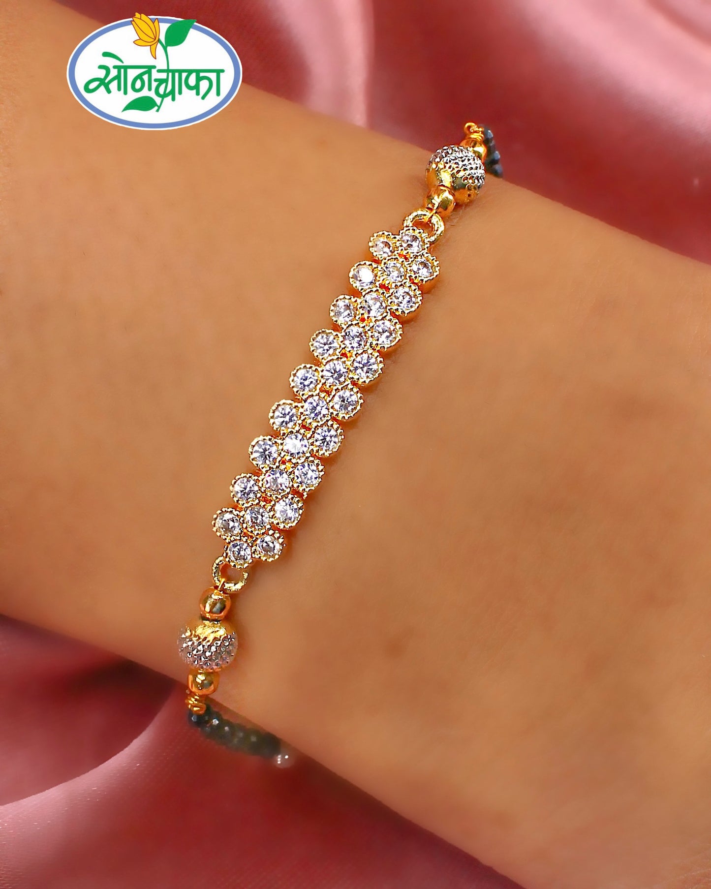 Complete your party look by clubbing this adorable bracelet from Sonchafa Jewellery. It is crafted from antique golden finish superior quality metal. This bracelet is decorated with attractive florals along with gajantlaxmi. It is embedded with pearl beads for more attraction