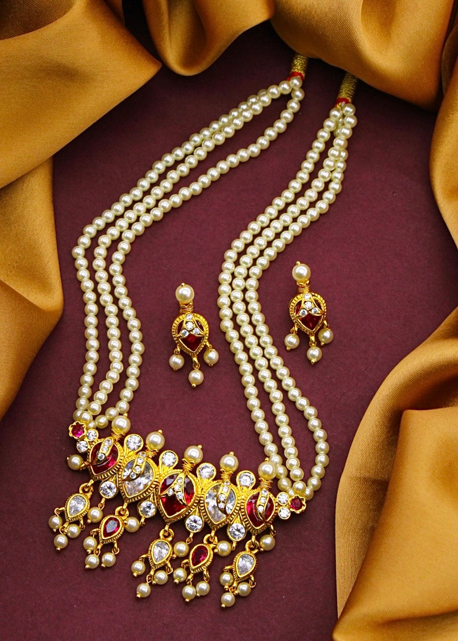 This season sonchafa jewellery brings to you this pink, white colour beautiful Tanmani short necklace in classic look. The pendant is embedded with sparkling white - pink colour stone and made from golden finish metal. It is woven with good quality pearl beads and comes with adjustable dori, so that you can fit it properly. This necklace set will fetch you lots of compliments from onlookers for your amazing choice.