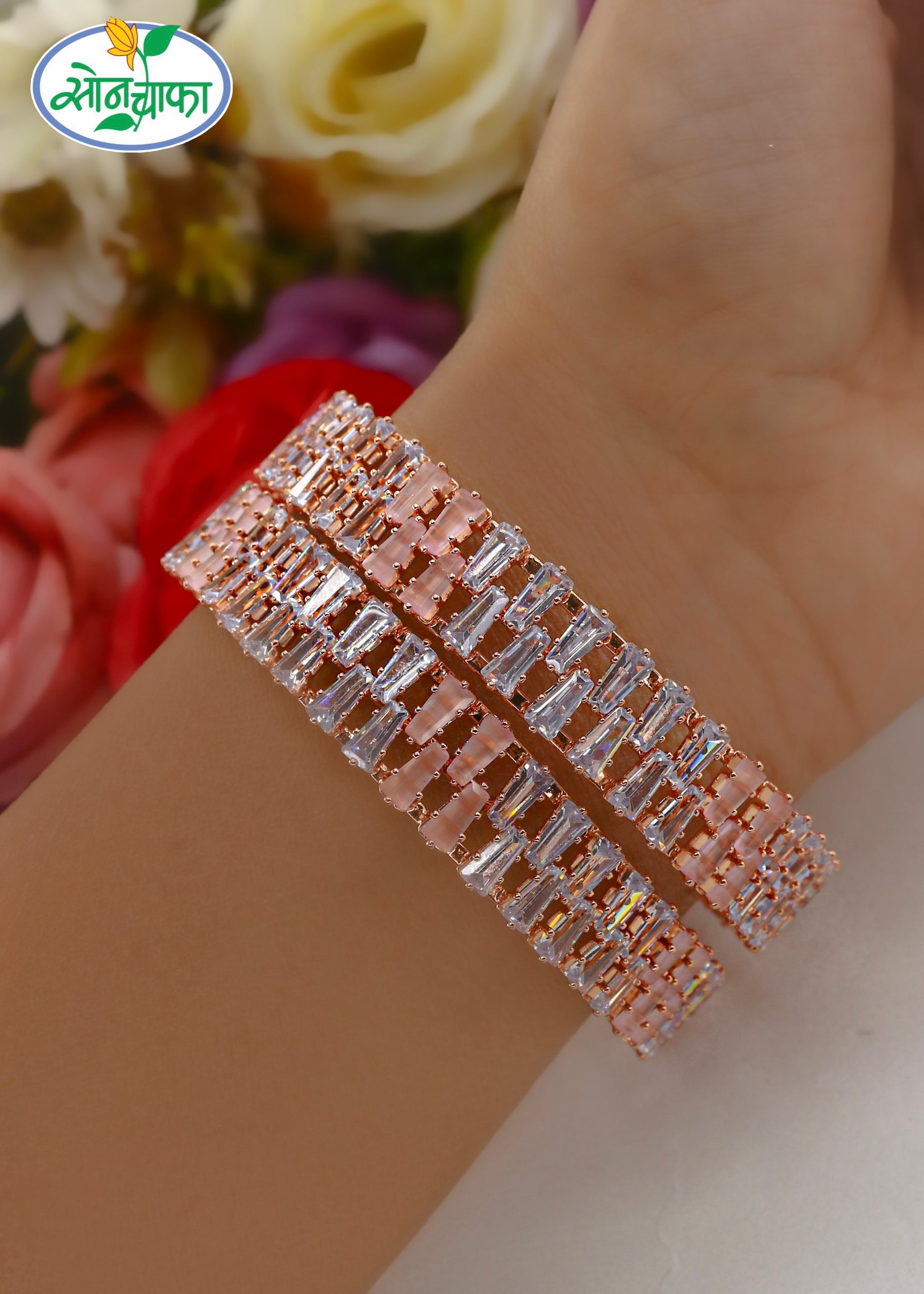 Add a stylish twist to your classy appearance by adorning these Dia bangles from Sonchafa Jewellery. These bangles are encrusted with sparkling white stone and crafted from superior quality rose gold finish metal. These bangles feature eye-pleasing decoration and high in durability.