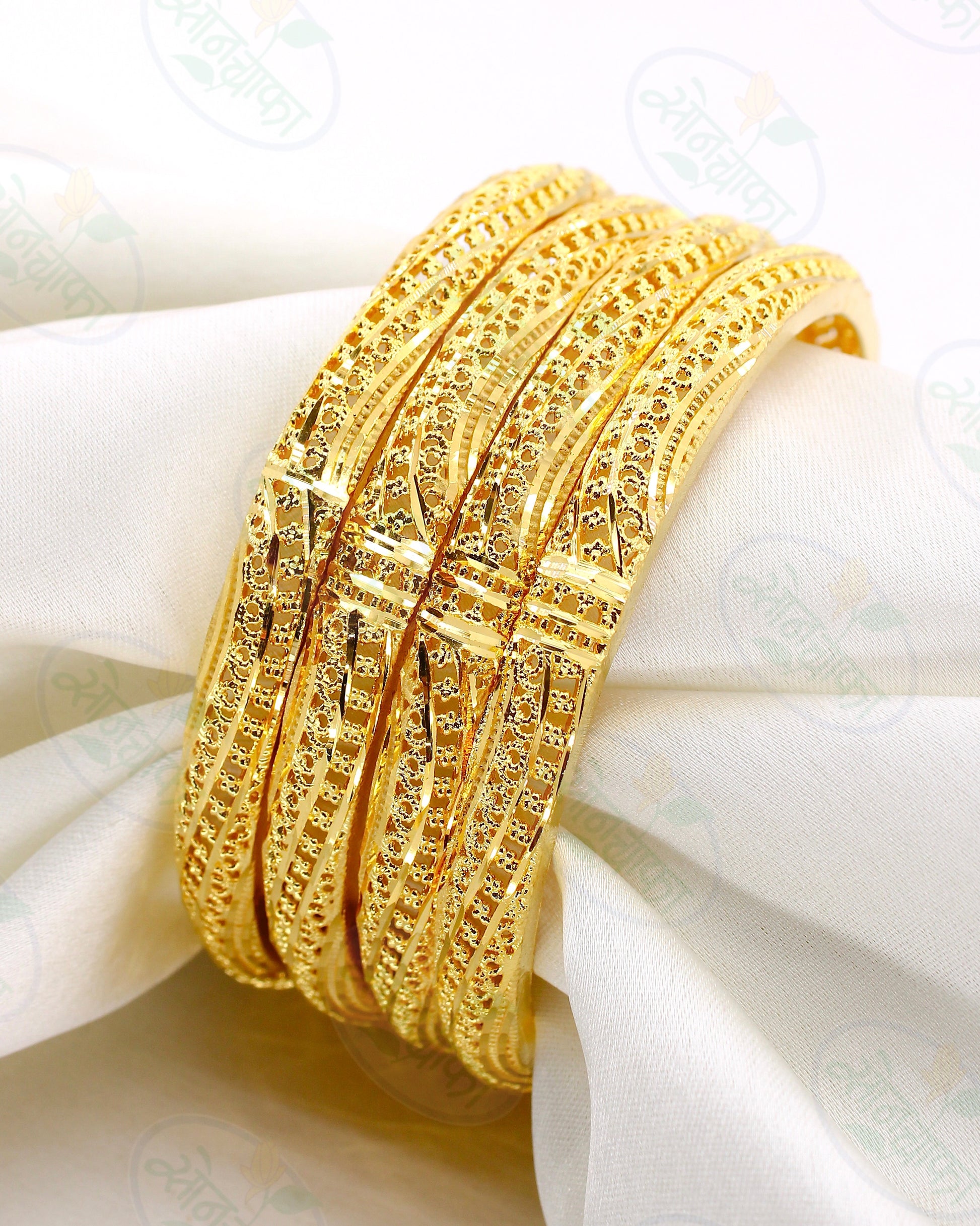 Sonchafa Jewellery presenting this gold plated floral set of 6 bangles for women and girl who love to wear golden designer bangles. It is decorated with floral design along with flawless mina work on golden base. These bangles are good in quality and comes with full assurance of durability