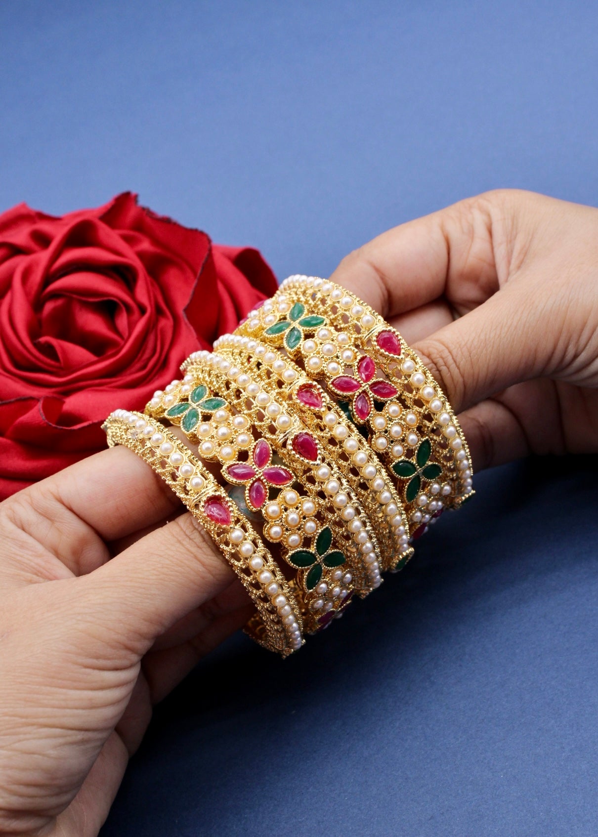 Sonchafa Jewellery presenting set of 6 pc appealing bangles for women and girl who love to wear antique jewellery. It is woven with pink, green stone along with pearl beads and fashioned from antique golden finish metal. These bangles feature floral design on metal surface. These are superior in quality and will retain its shine for years to come.
