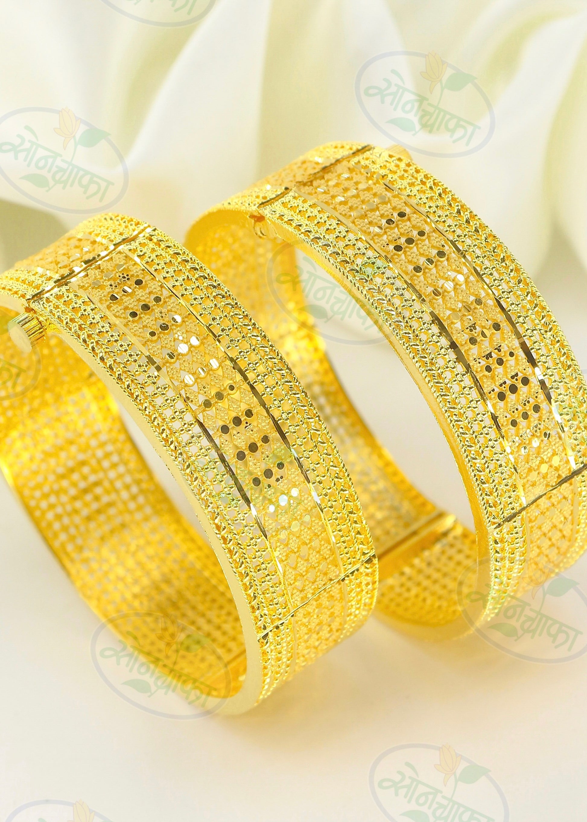 Glam up your festive look by clubbing this pair of designer bangles with your traditional costume. These sparkling bangles are made from 1 gram gold plated metal. These designer bangles are good in quality and skin-friendly as well. This jewellery will make you look gorgeous and make head turns towards you.