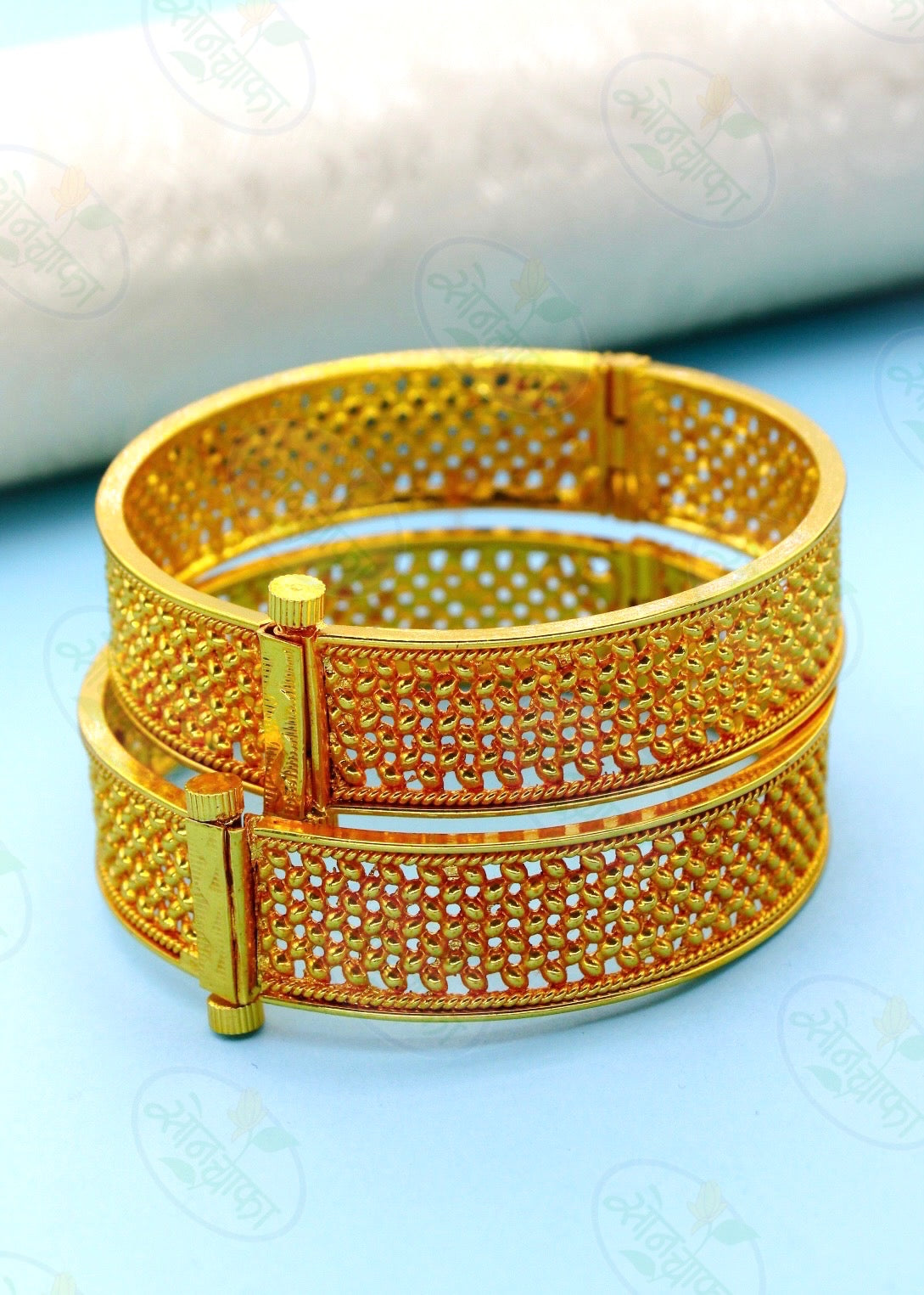 Get that appealing look by wearing this geru finish beautiful bangles with your matching saree. They are studded with golden beads along with carving work. This set is good in quality and will be your fashion companion for many years.