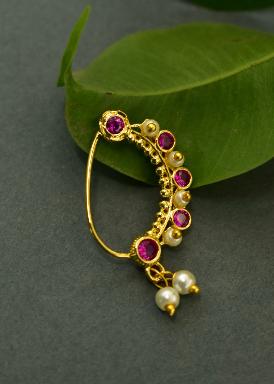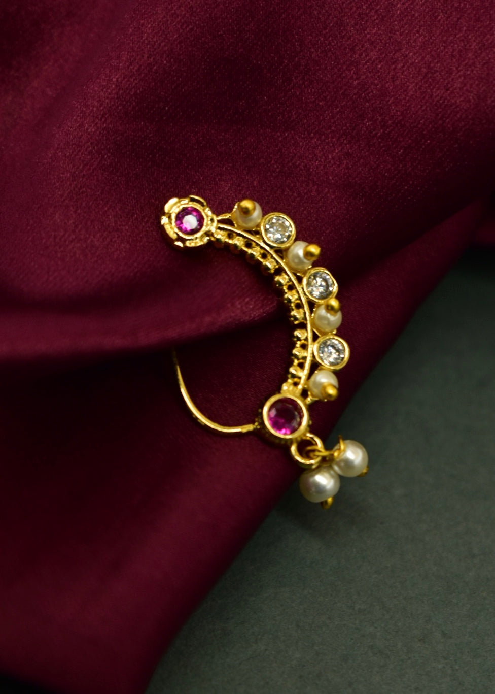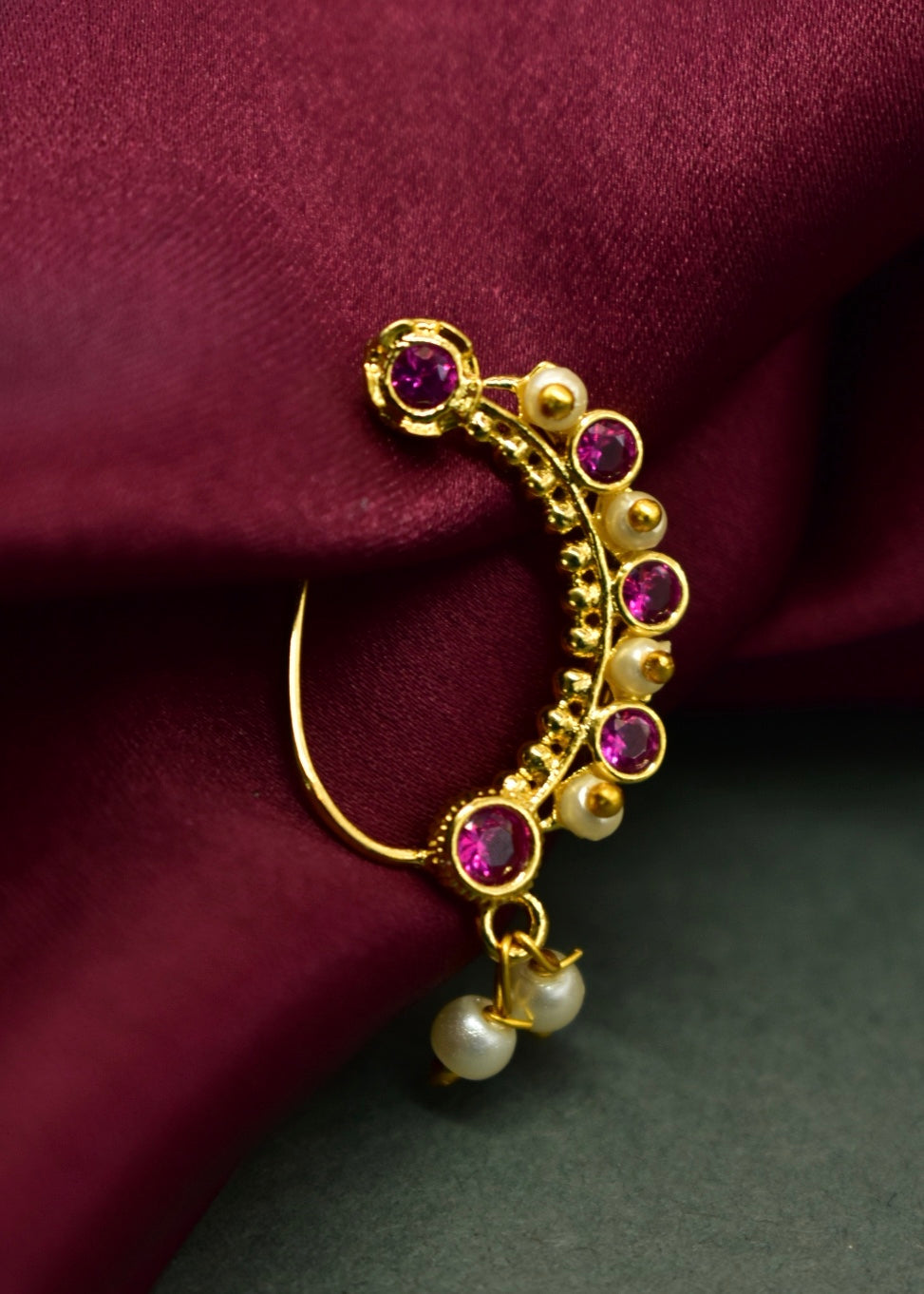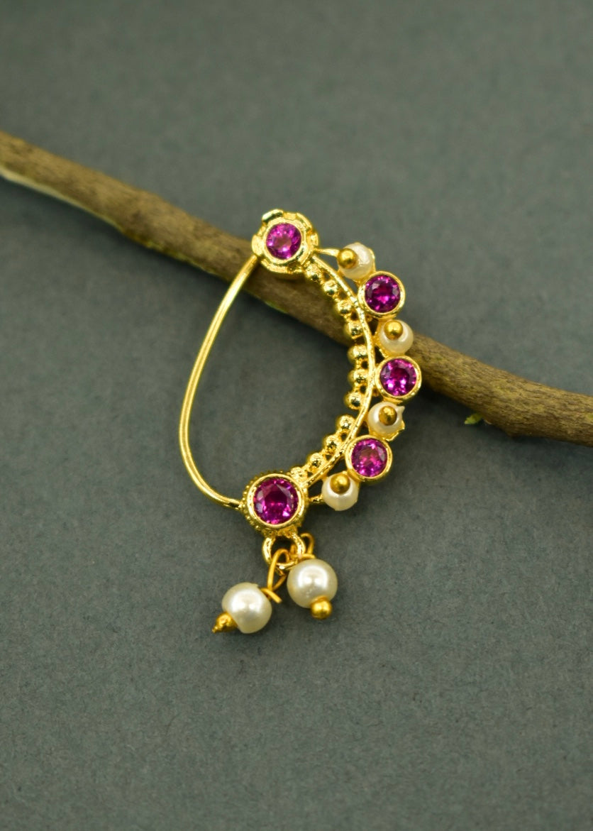 This pearl beads delicate nath is sure to catch your attention at the first look itself. This nath is embedded with pink, white, green stones and crafted from golden finish metal. This nath has pearls dangling beads at the bottom for added charm. This nath is skin-friendly and highly durable.