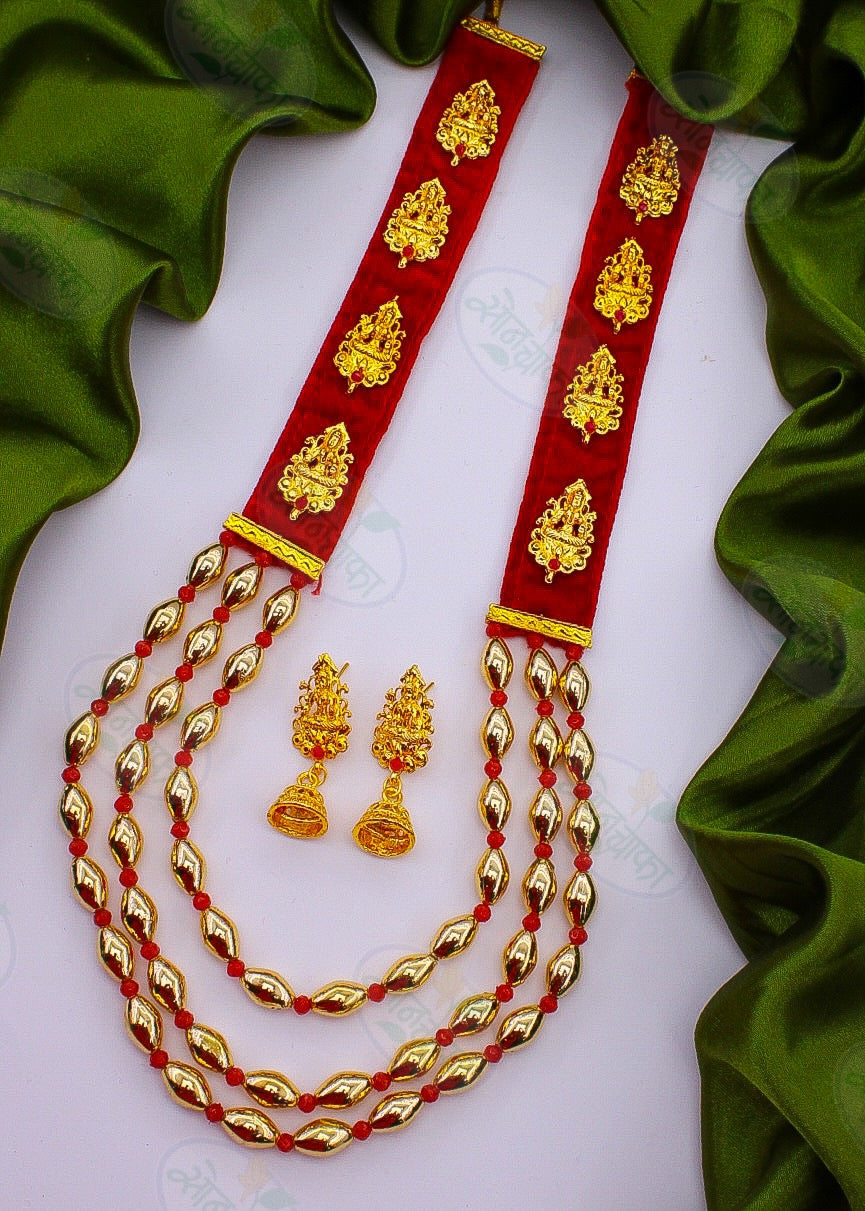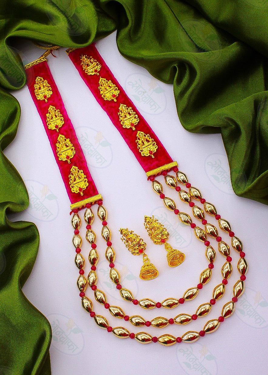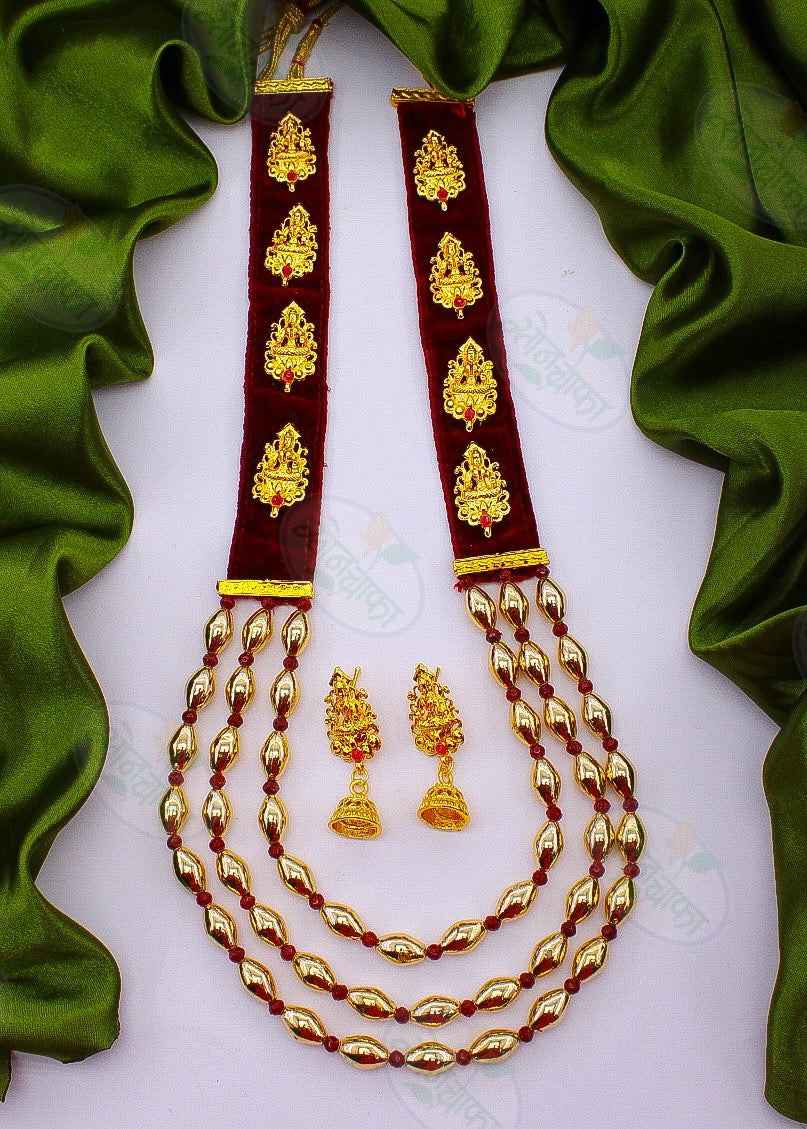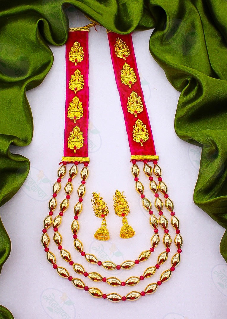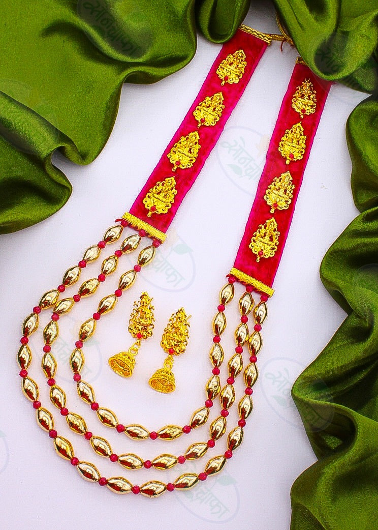 Buy something different for yourself in the form of this divine Dholki beads necklace from Sonchafa Jewellery. This necklace is studded with pink stone along with Goddess Laxmi design. It is wonderfully woven with golden colour Dholki beads. This adorable necklace is fashioned from golden finish metal and ensures high durability.