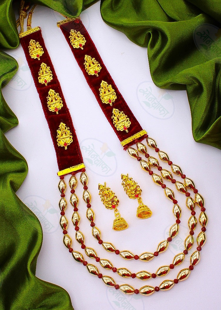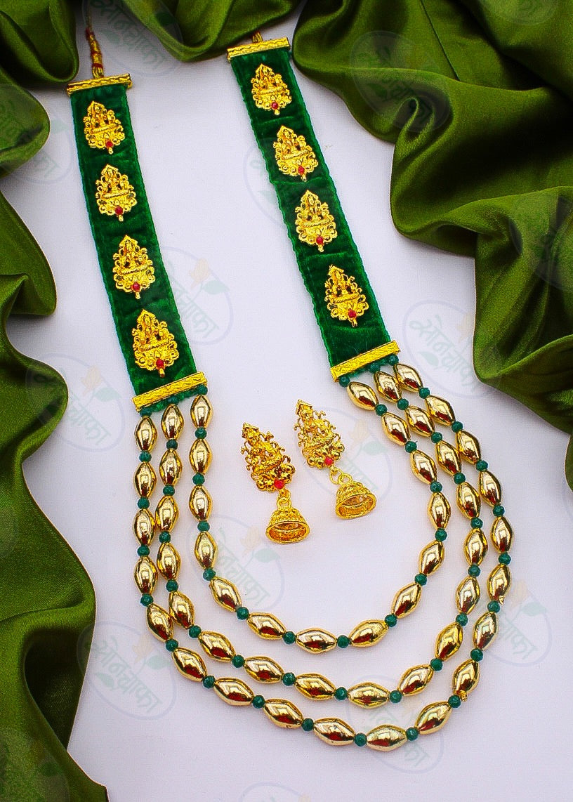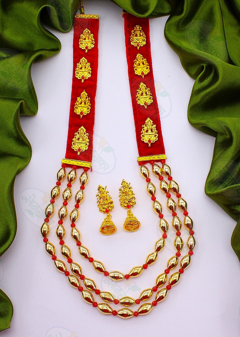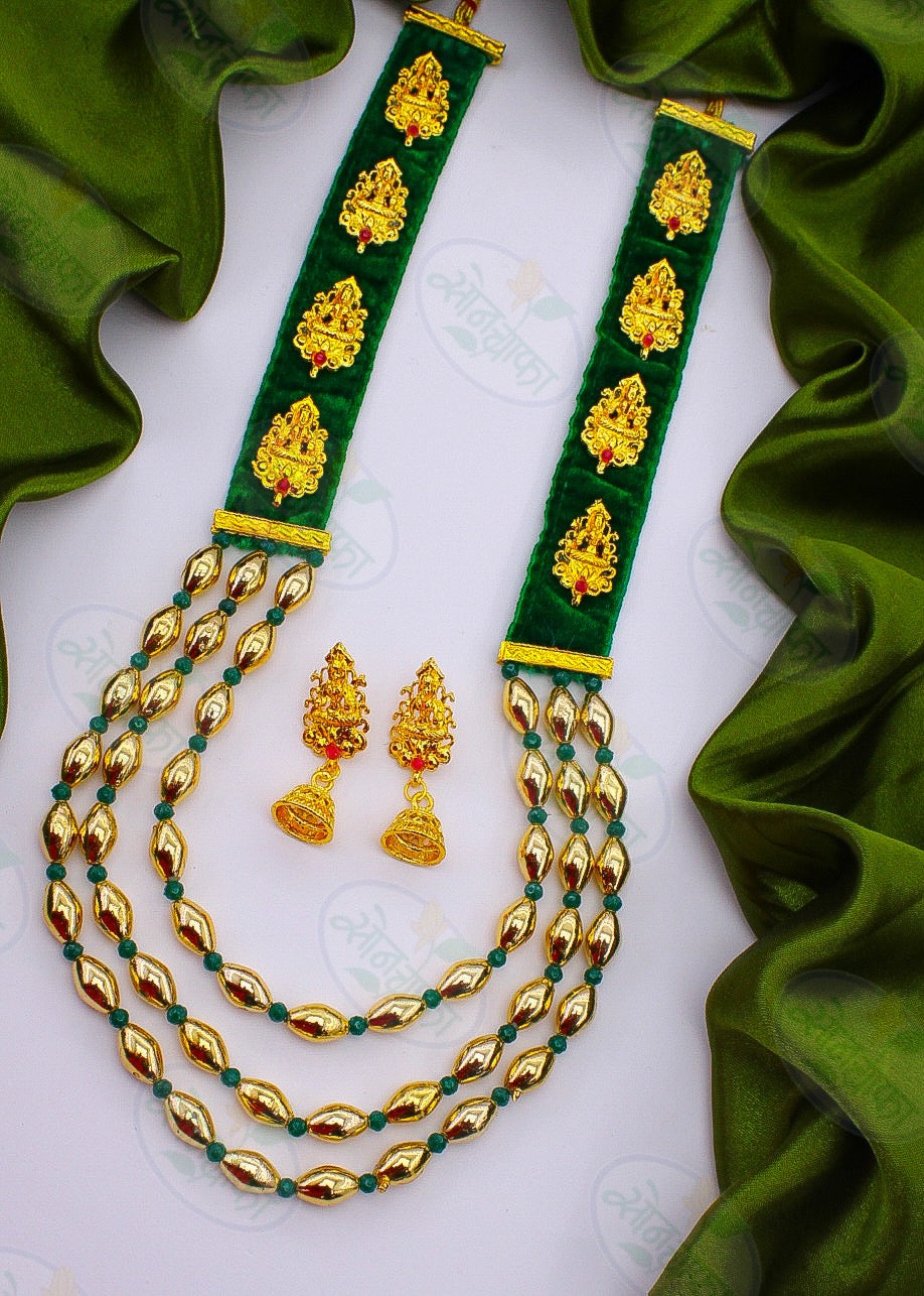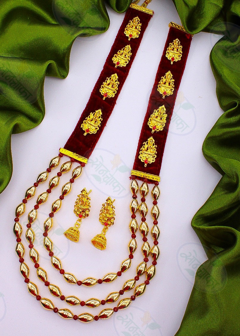 Buy something different for yourself in the form of this divine Dholki beads necklace from Sonchafa Jewellery. This necklace is studded with pink stone along with Goddess Laxmi design. It is wonderfully woven with golden colour Dholki beads. This adorable necklace is fashioned from golden finish metal and ensures high durability.