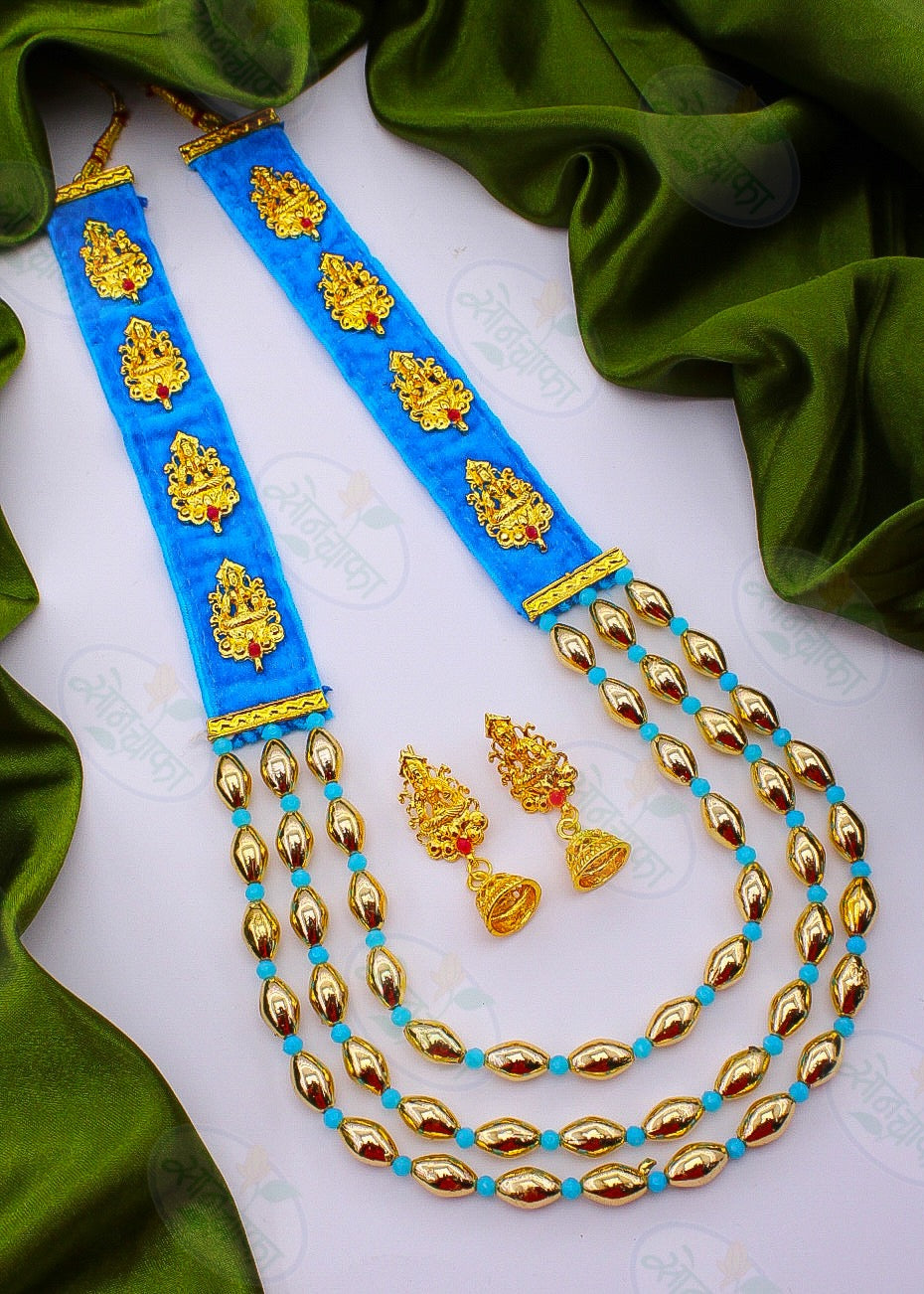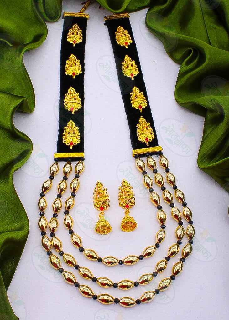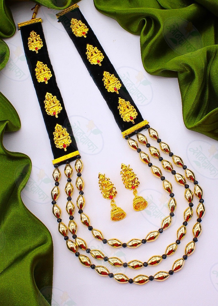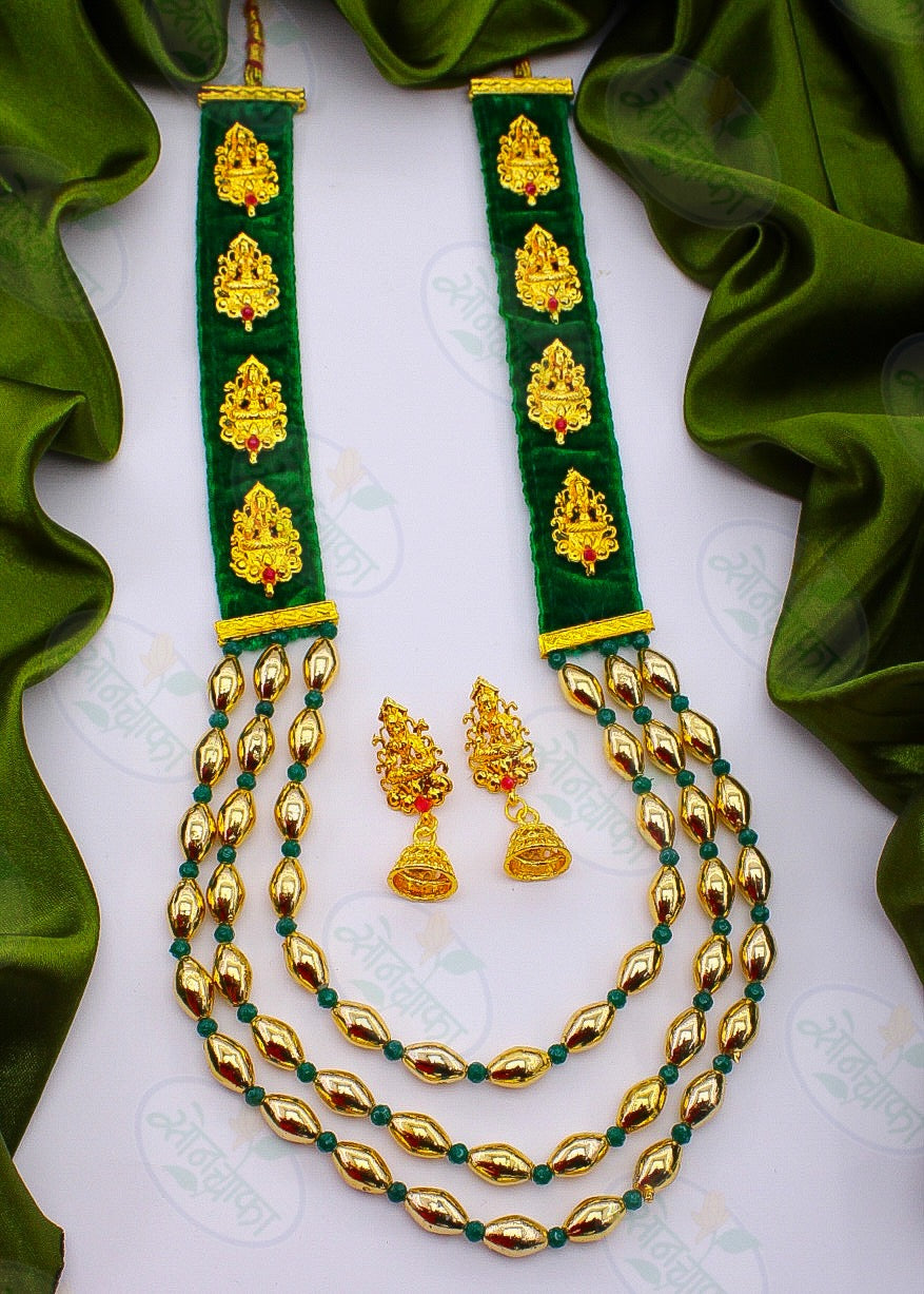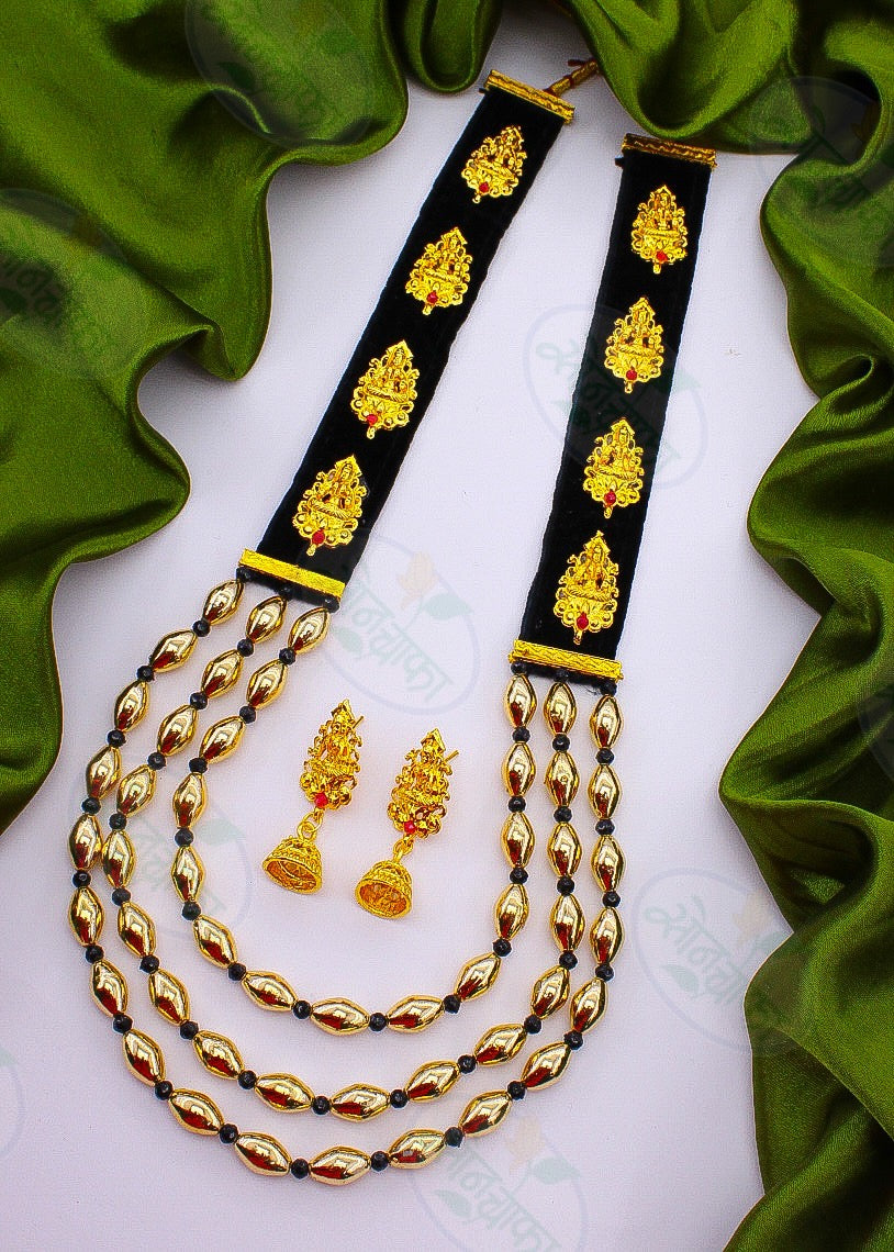 Buy something different for yourself in the form of this divine Dholki beads necklace from Sonchafa Jewellery. This necklace is studded with pink stone along with Goddess Laxmi design. It is wonderfully woven with golden colour Dholki beads. This adorable necklace is fashioned from golden finish metal and ensures high durability.