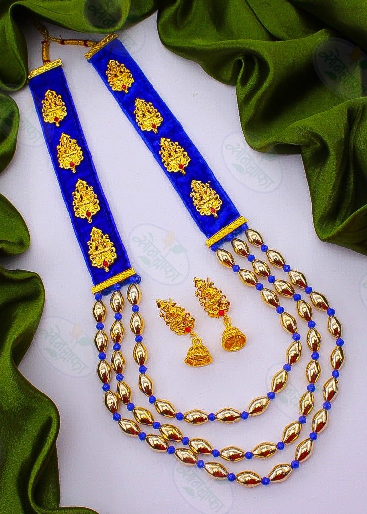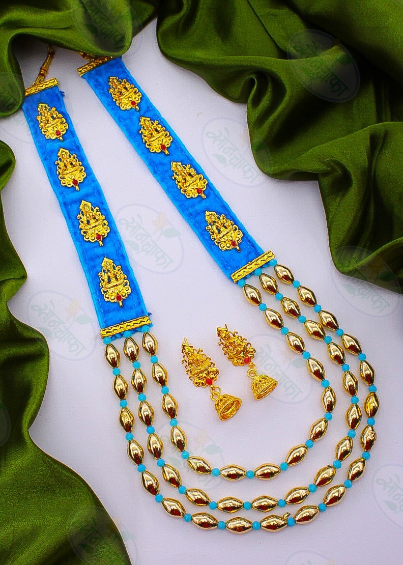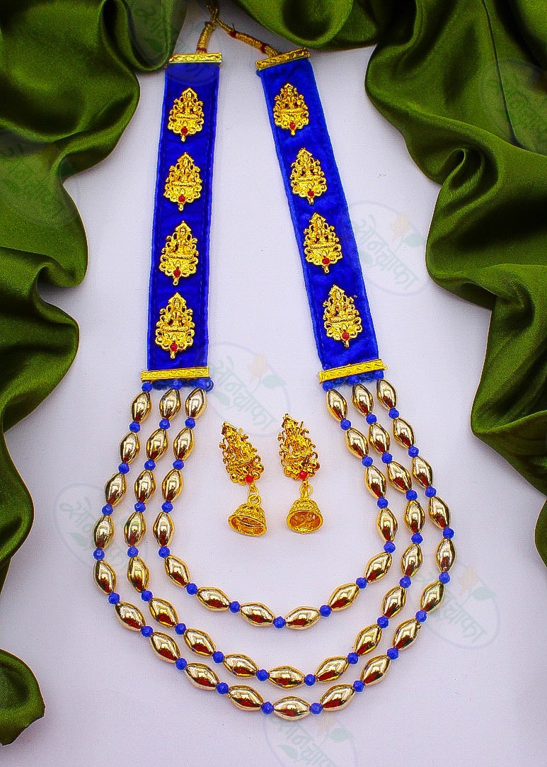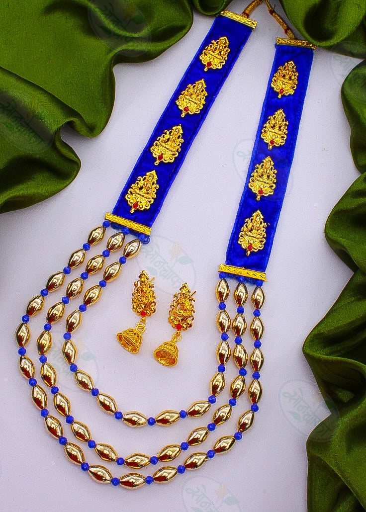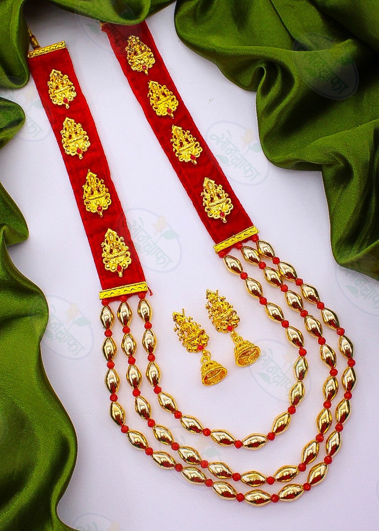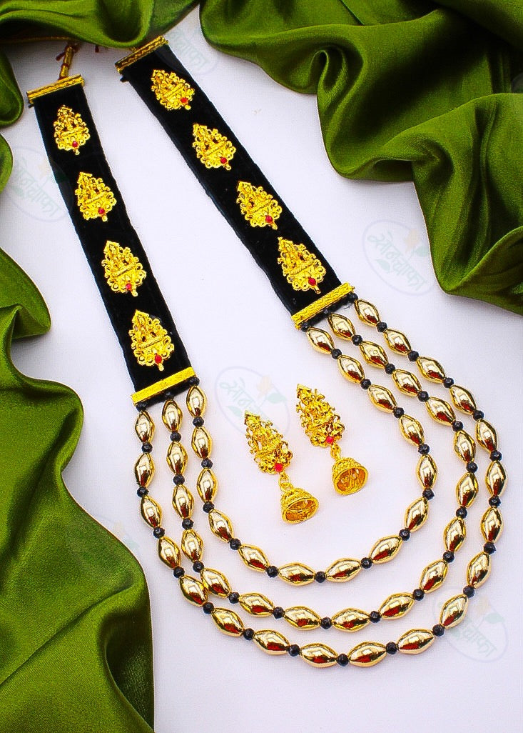 Buy something different for yourself in the form of this divine Dholki beads necklace from Sonchafa Jewellery. This necklace is studded with pink stone along with Goddess Laxmi design. It is wonderfully woven with golden colour Dholki beads. This adorable necklace is fashioned from golden finish metal and ensures high durability.