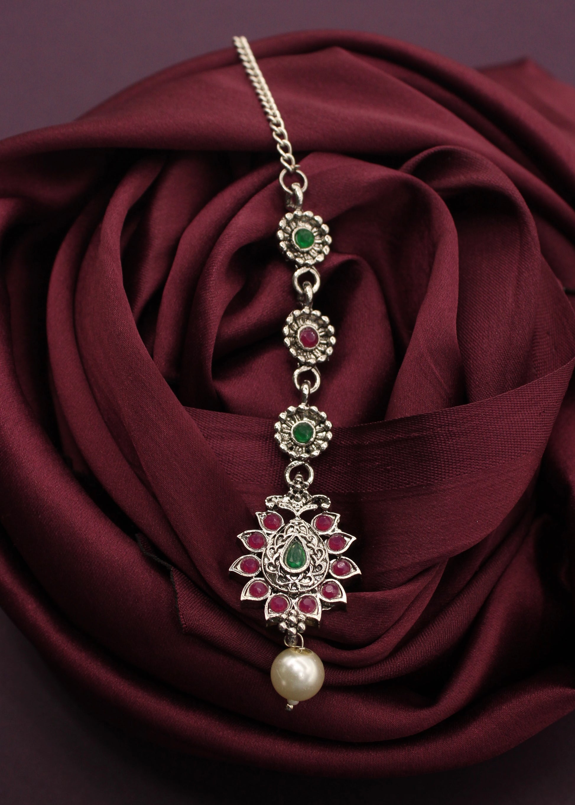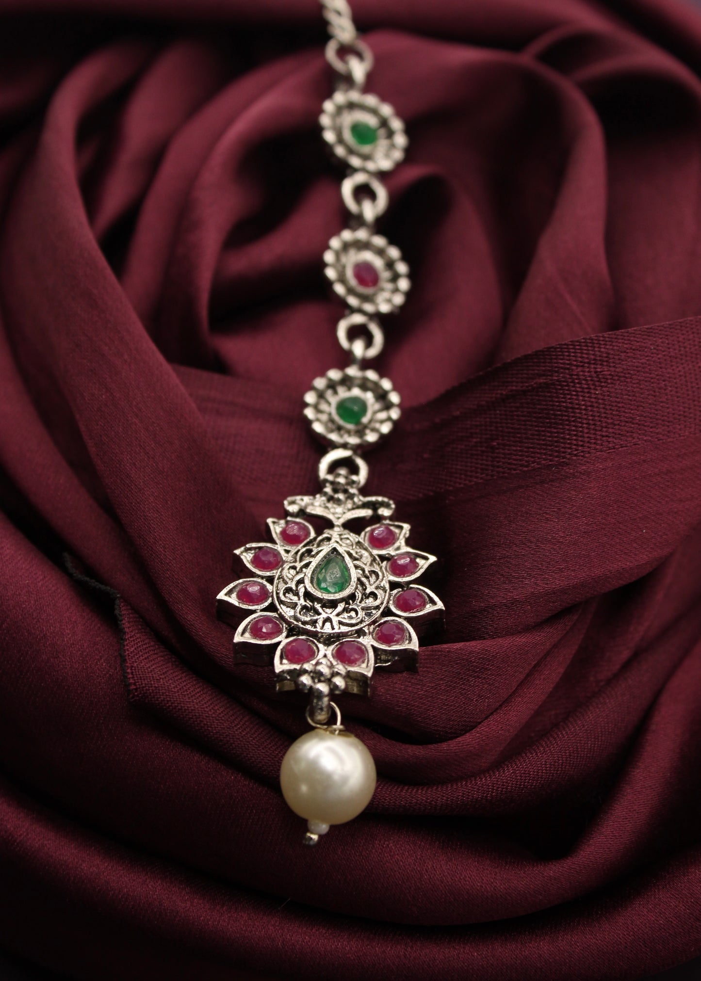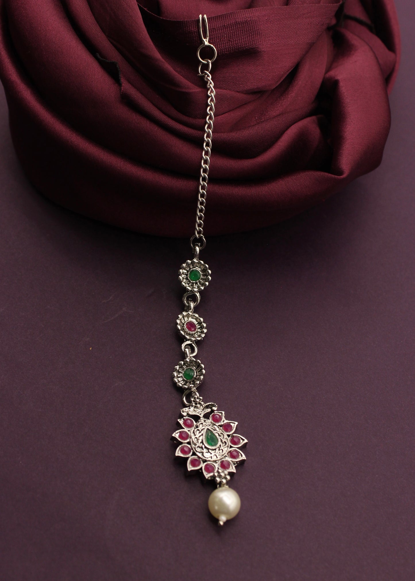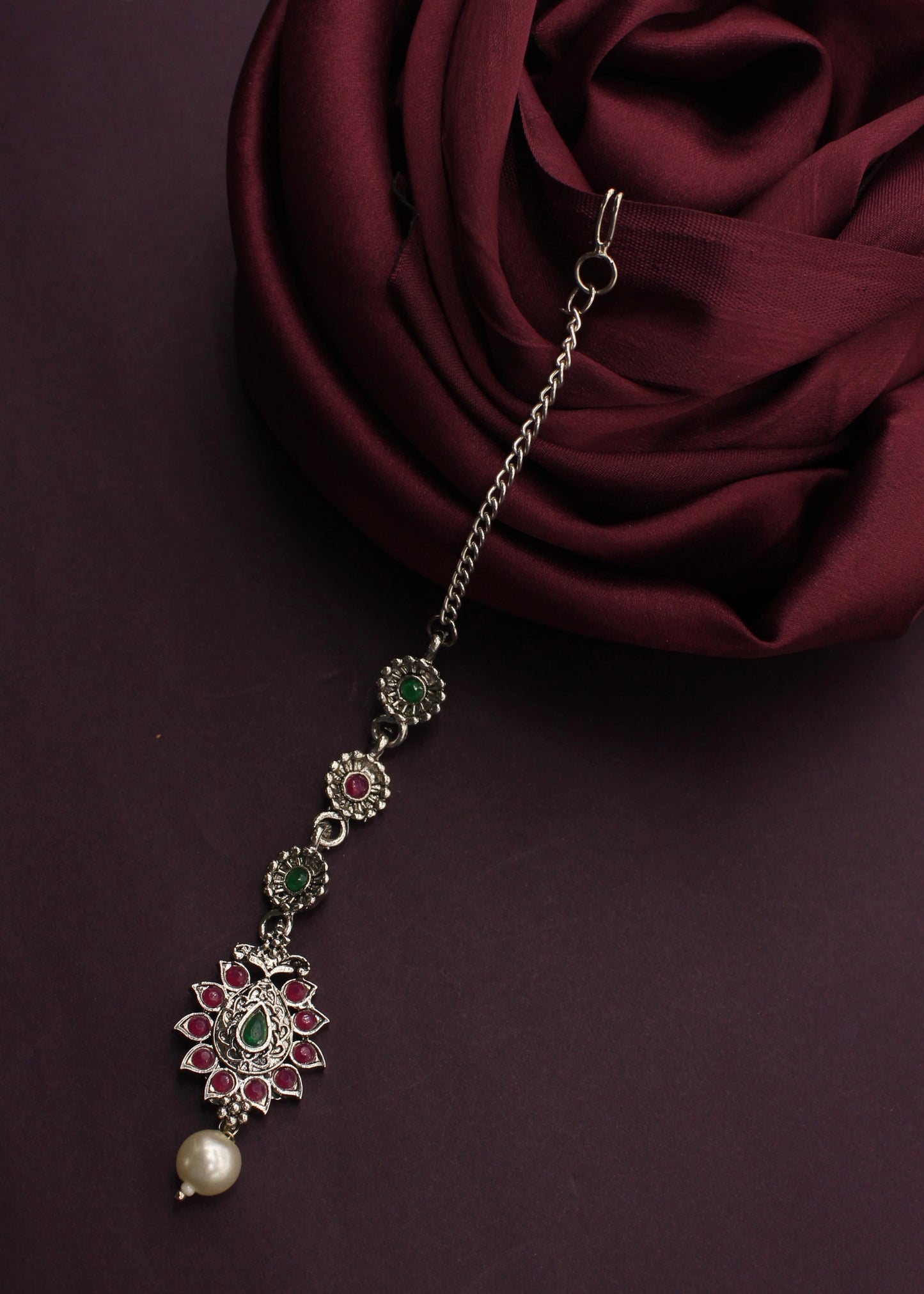 Sonchafa Jewellery presents this beautiful bindi which will catch your attention at once. It is studded with pink-green stone & fashioned from Oxidised finish metal. It has pearl droplet for additional look. It is long lasting and high in durability.