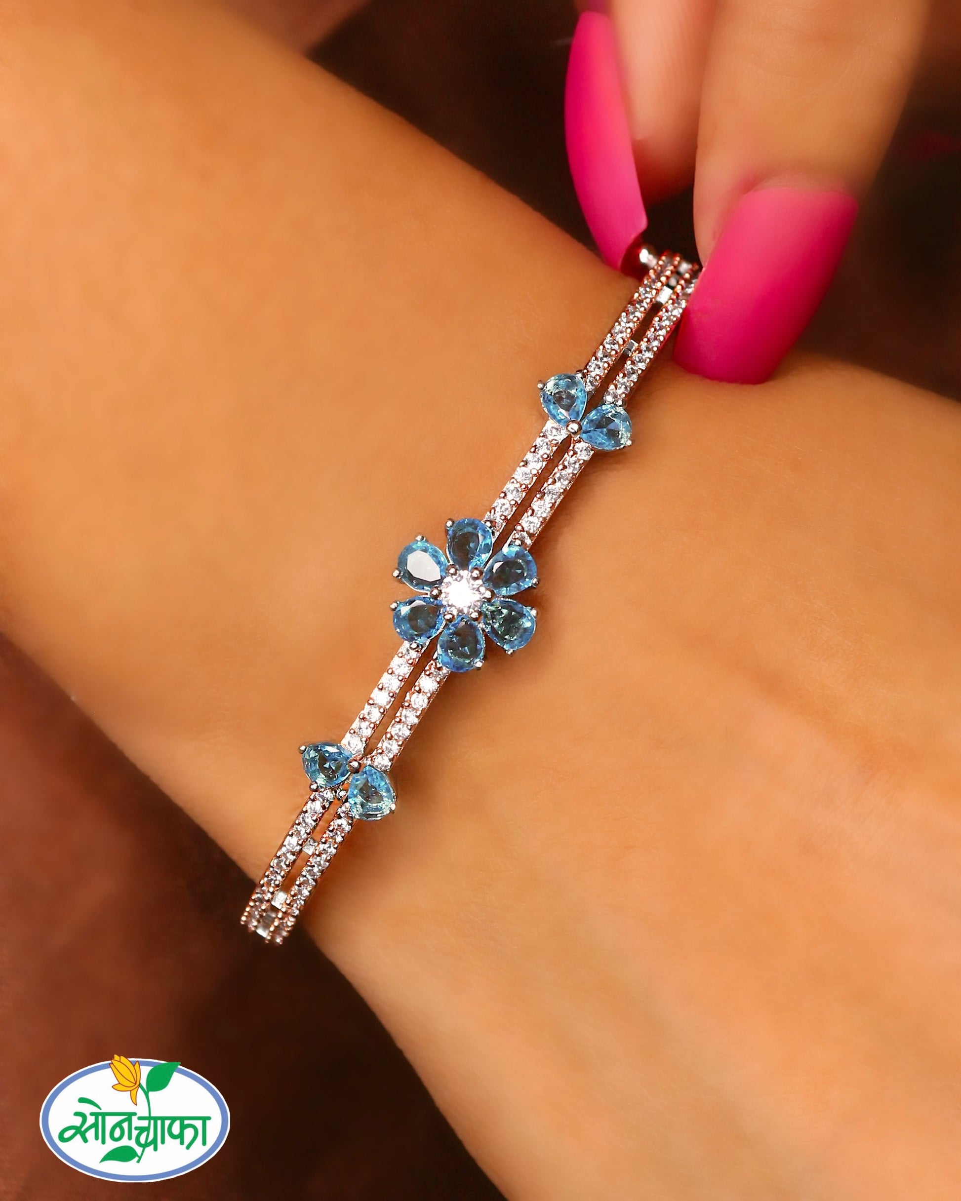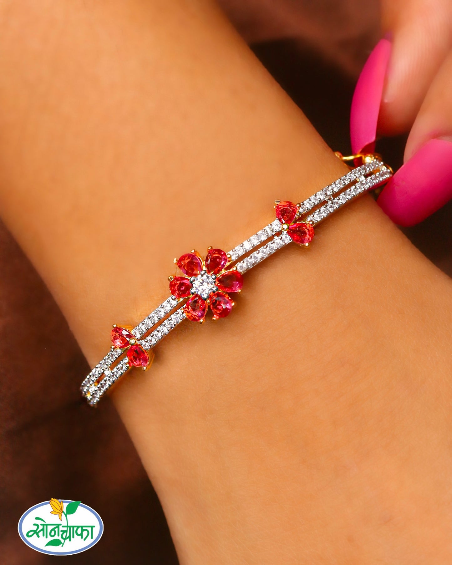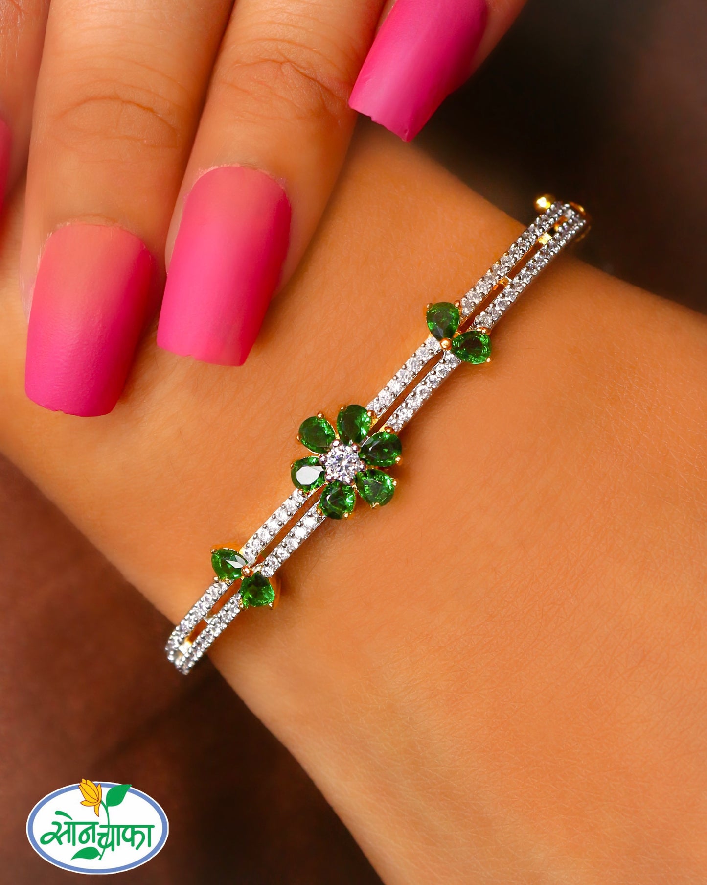 Beautifully designed this dia bracelet from sonchafa Jewellery is best to team with traditional costume. They are encrusted with pink, sky blue ,green stones and feature eye-pleasing intricate carving design on metal surface. These floret bracelate are good in quality and rust-resistant as well.