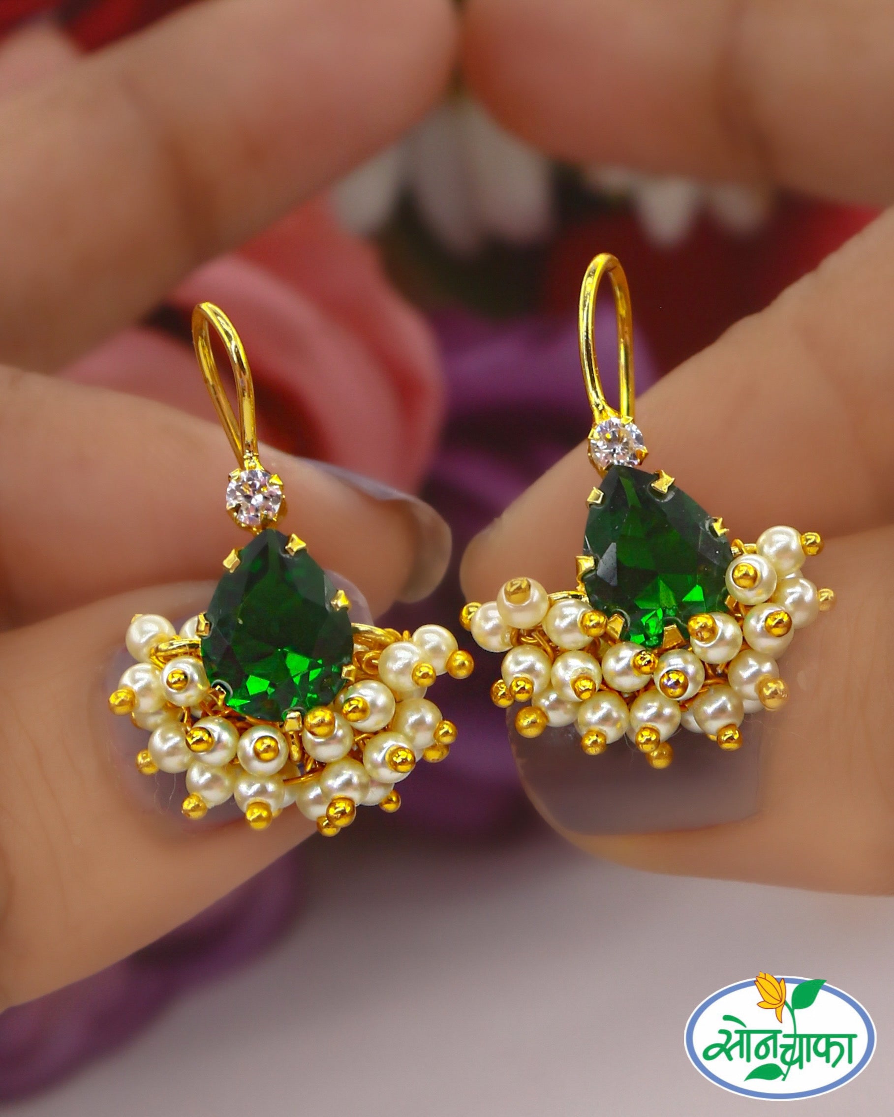 Sonchafa Jewellery offers this Dazzling pair of bugadi earrings at low price. These bugadi earrings are embedded with green colour stones and styled with pearl beads. They are crafted from superior quality metal and ensure high durability.