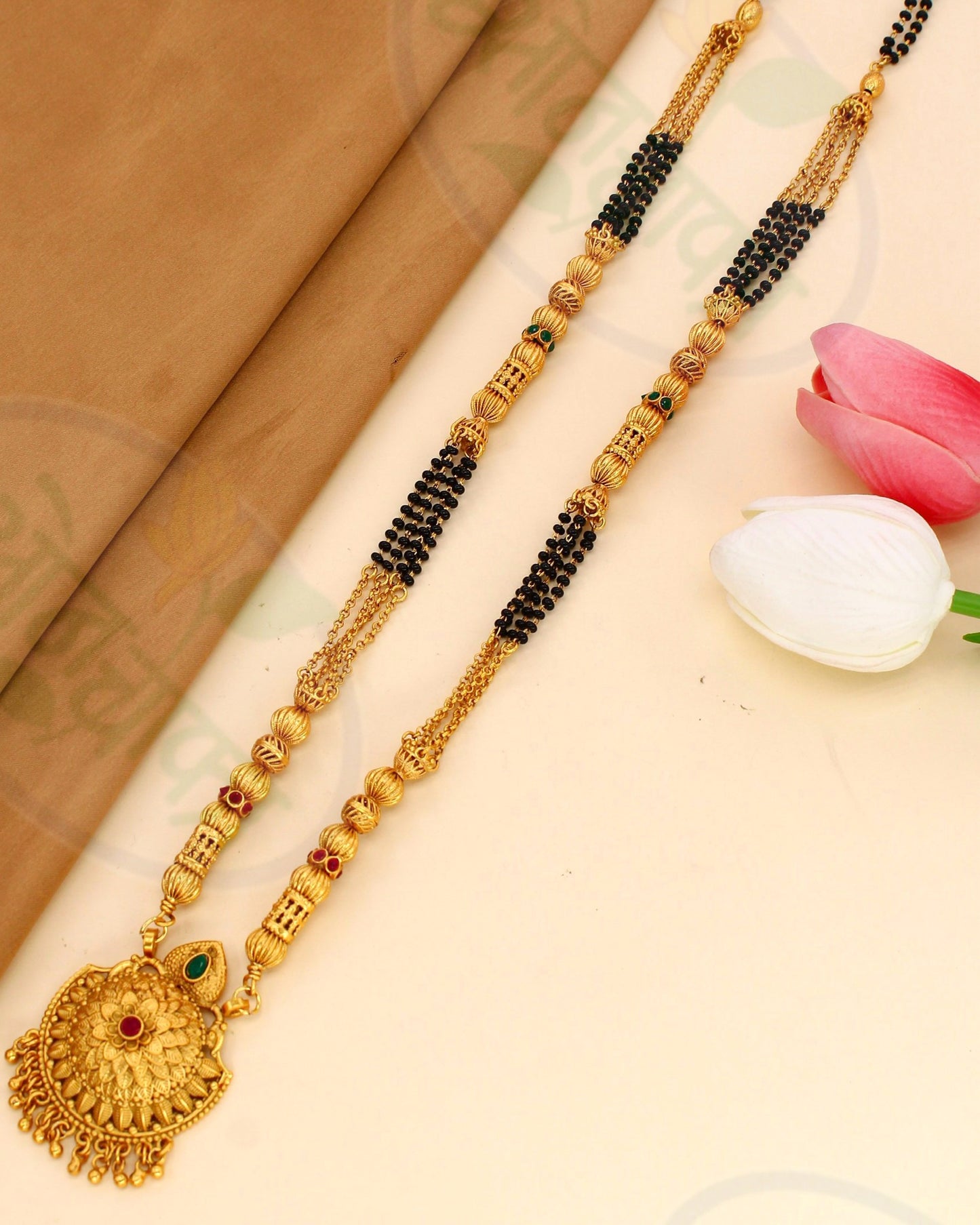 Delicate matte golden finish mangalsutra designs for women traditional from Sonchafa Jewellery. This Mangalsutra is made from matte golden finish metal and it is superior in quality.