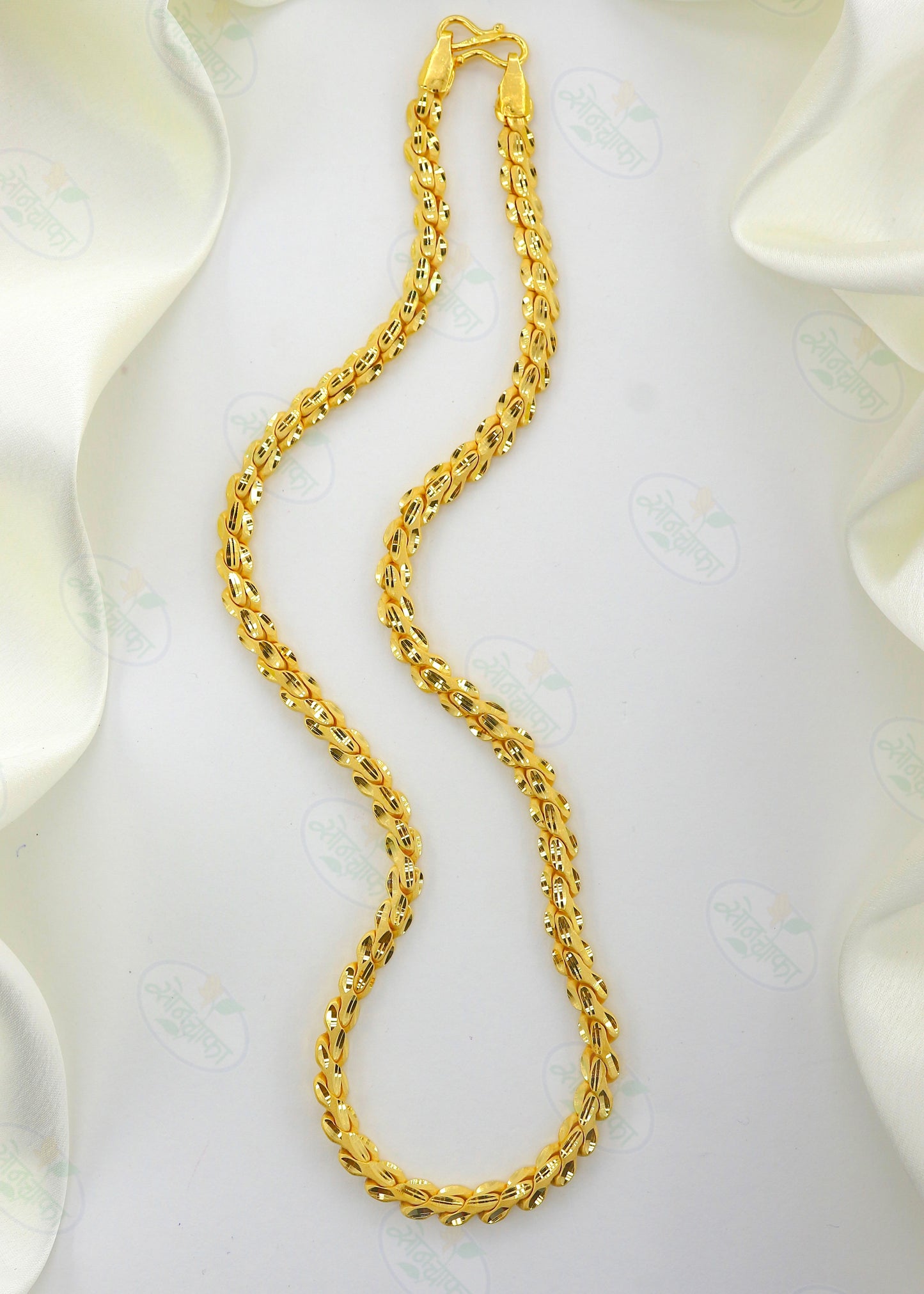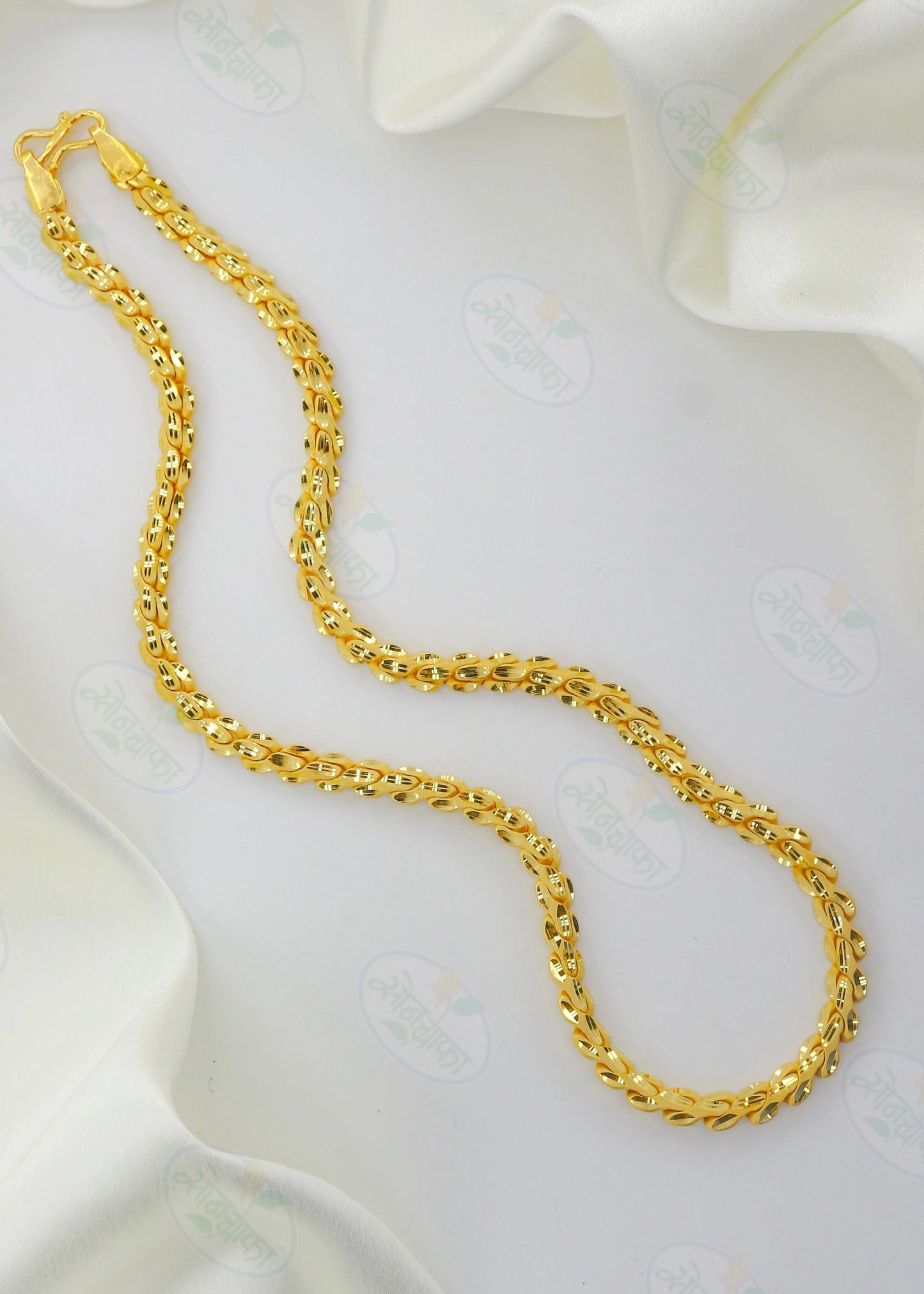 This 1 gram gold plated unique designer chain. How To Wear It : Wear this chain with as solid color cotton kurta with churidar. Look The Part: Look beoThe Part: This classy men's broad chain is a perfect wear for any festive occasion.